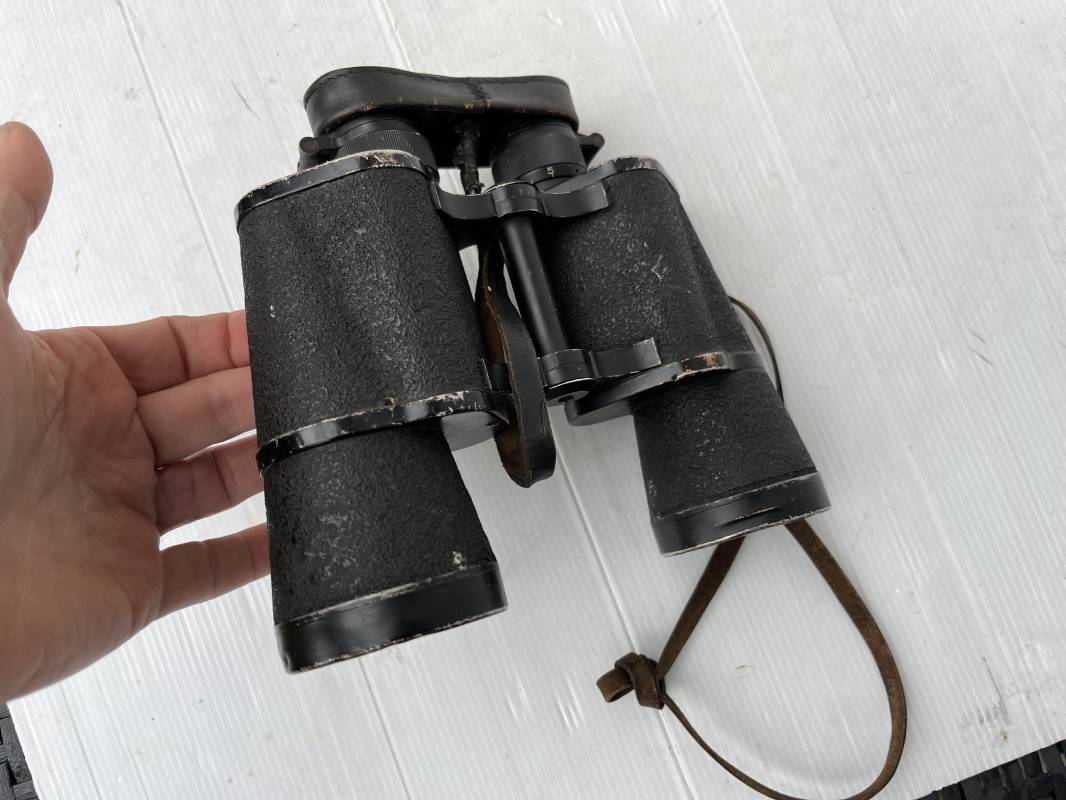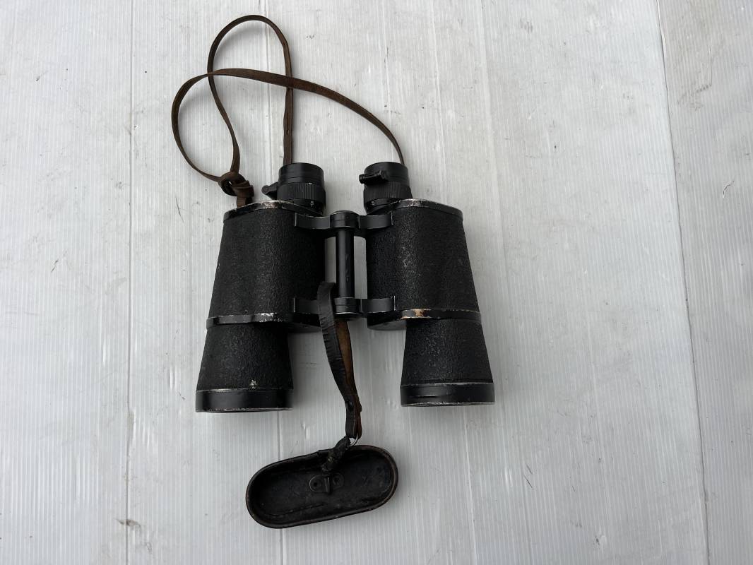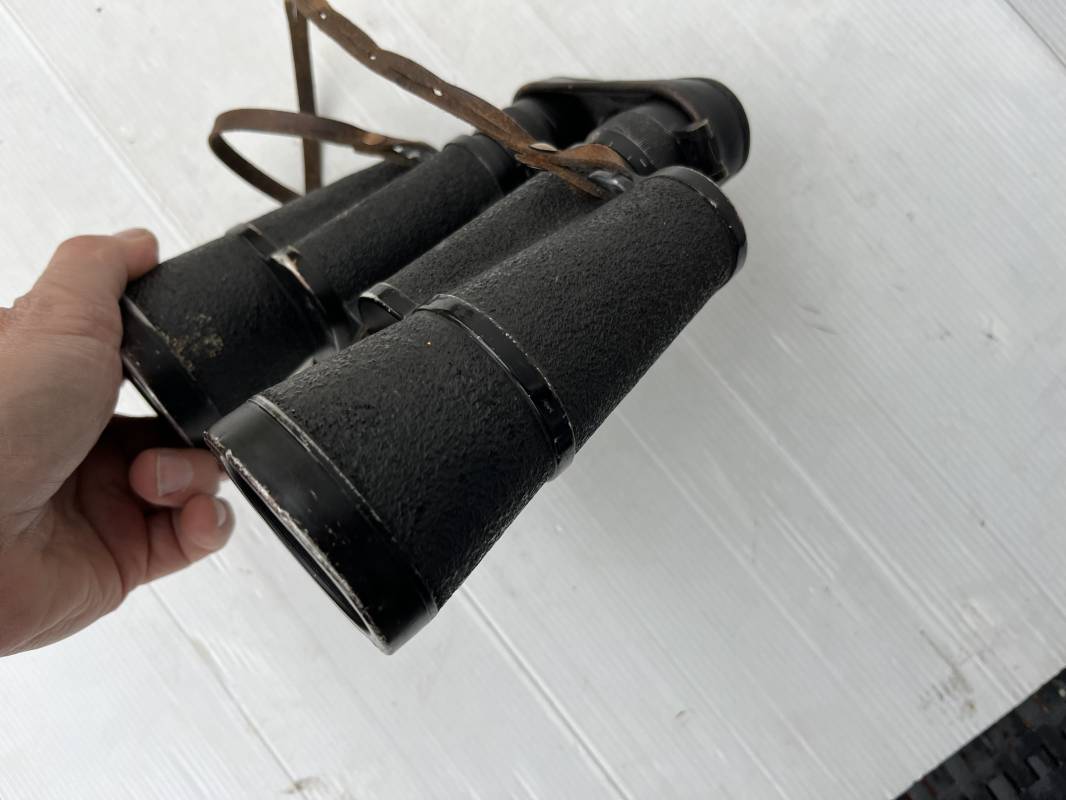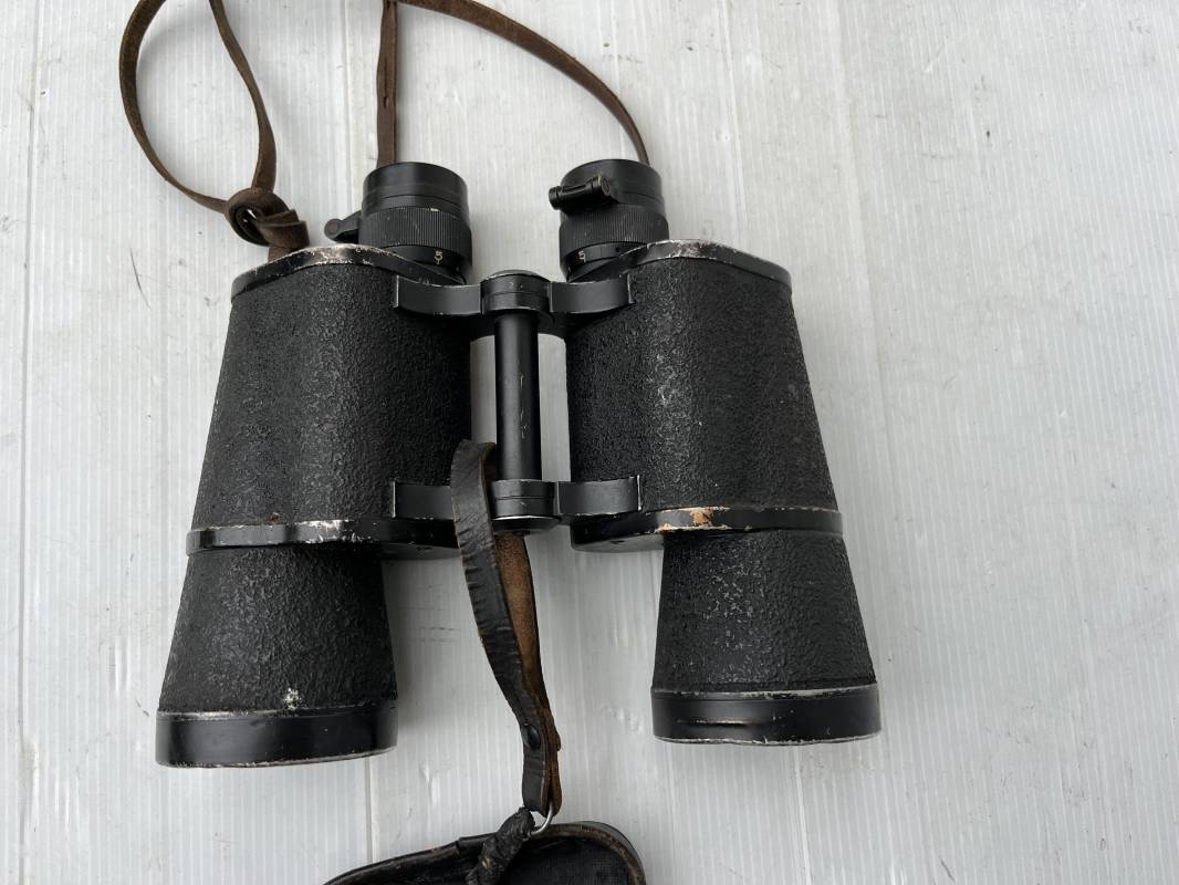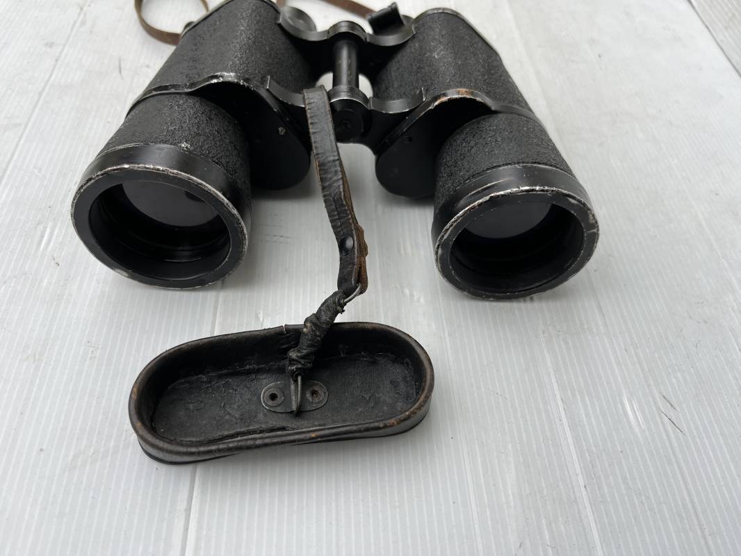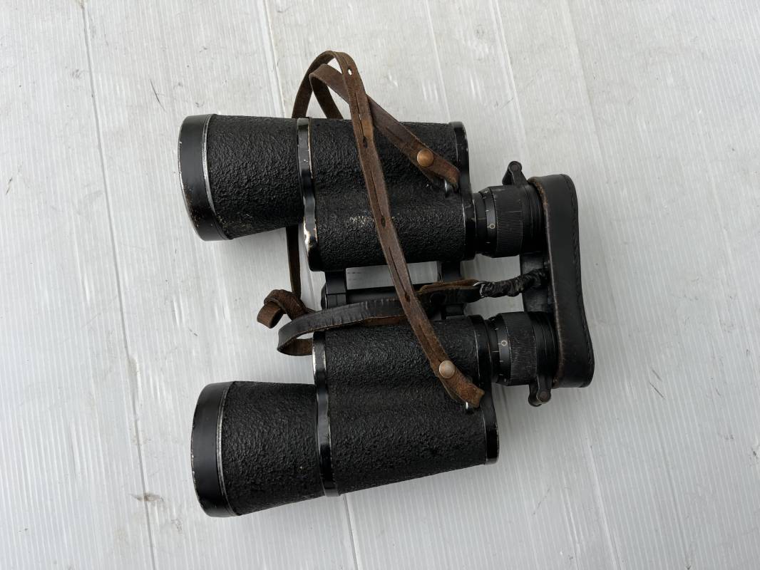Belle paire de jumelles 7X50 de dotation Dienst glass , peinture granuleuse noire d'origine. Marquage matricule. Fabricant bmk , optiques en bon état. Réticule coté droite . Protéges optiques à bascule pour le port de filtres . Sangle cuir et rivets, Protége optique en cuir avec lanière de maintient en cuir noir . Bel ensemble homogène . Porté en bel état 1940/45. Ref 17073