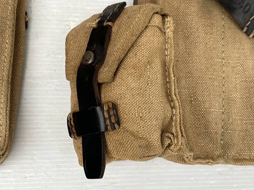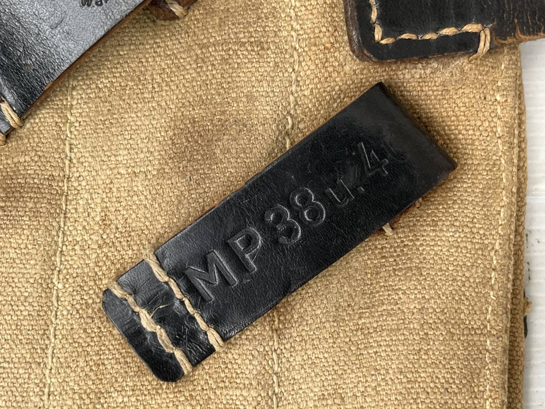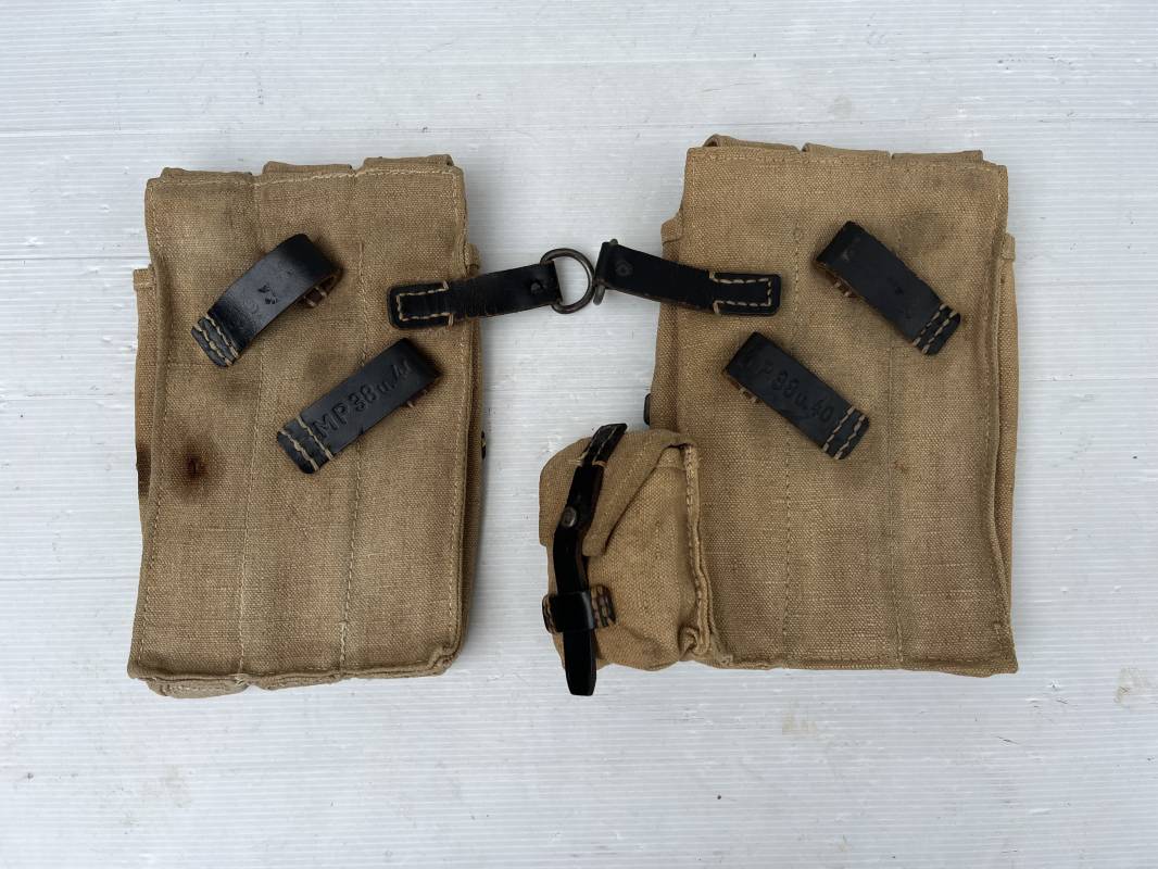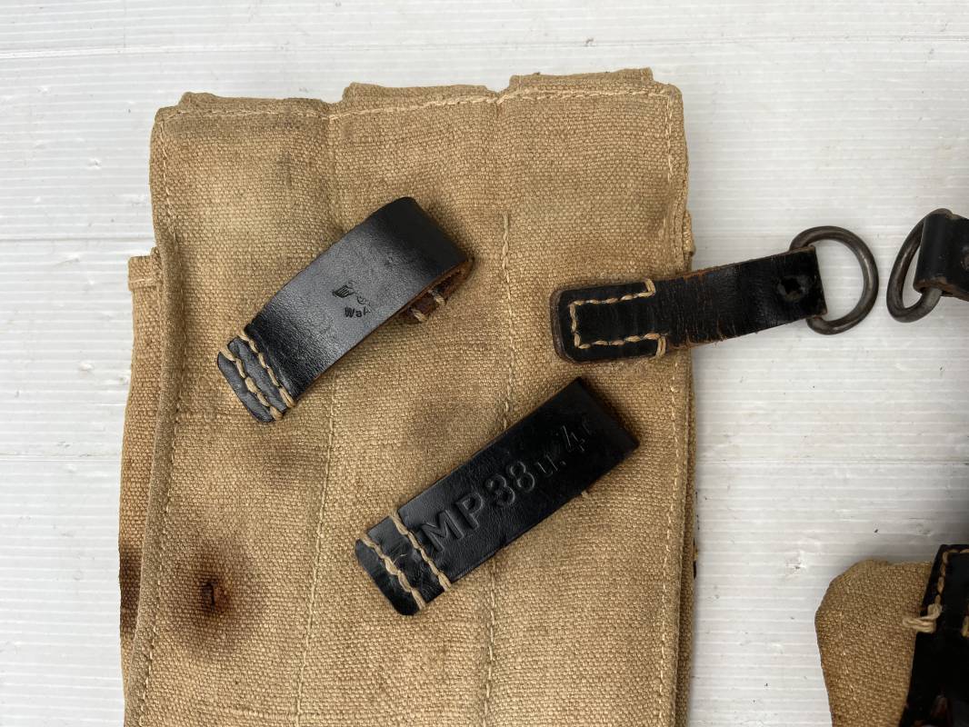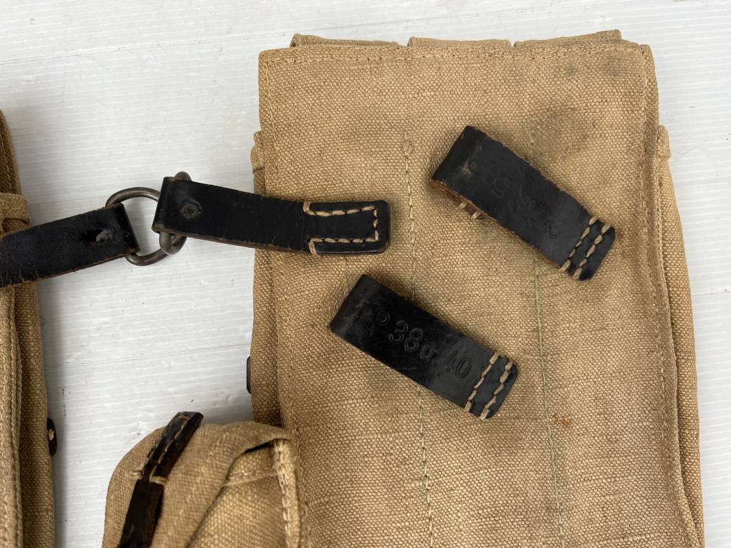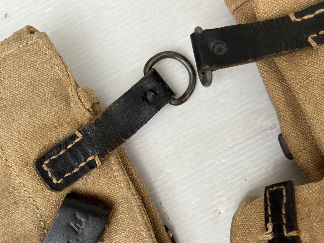 Rare paire de porte chargeurs MP40 en jaune . Paire homogène et du même fabricant . Fabrication en forte toile de couleur jaune . Passants en cuir noir . Passants cuir de ceinturon. Emplacement pour le port de la chargette. Tétons métalliques, Marquage fabricant sur chaque pochette CLG 43 , aigle WaA B 66 MP38 u 40 . Anneaux métalliques de fixation des bretelles de suspension a noté un petit rivet fer manquant mais ne nuisant en rien a la solidité du cuir ni de la mobilité de l anneau ( voir photos ) . Rare paire légèrement portée en bel état.Trés belle patine générale . Rare équipement pour troupe de combat de la WH . Ref 21600