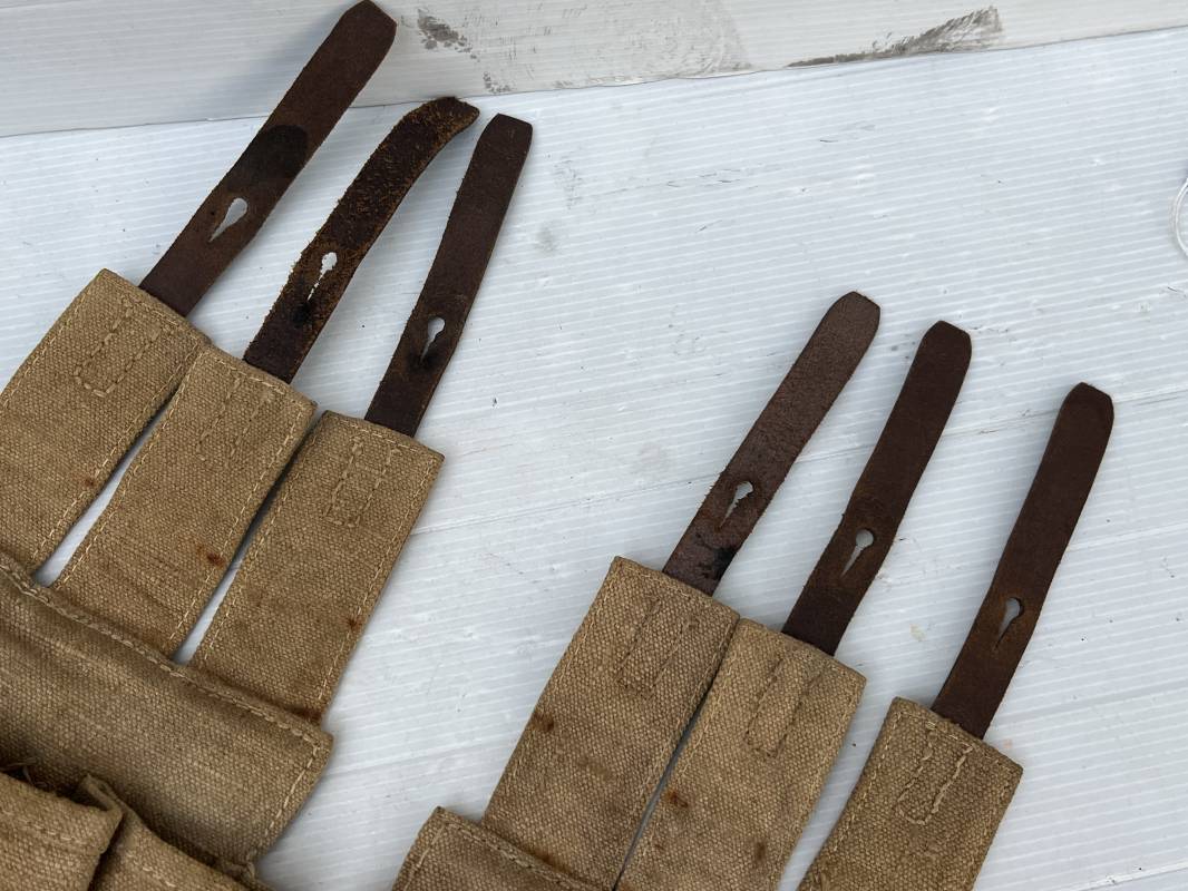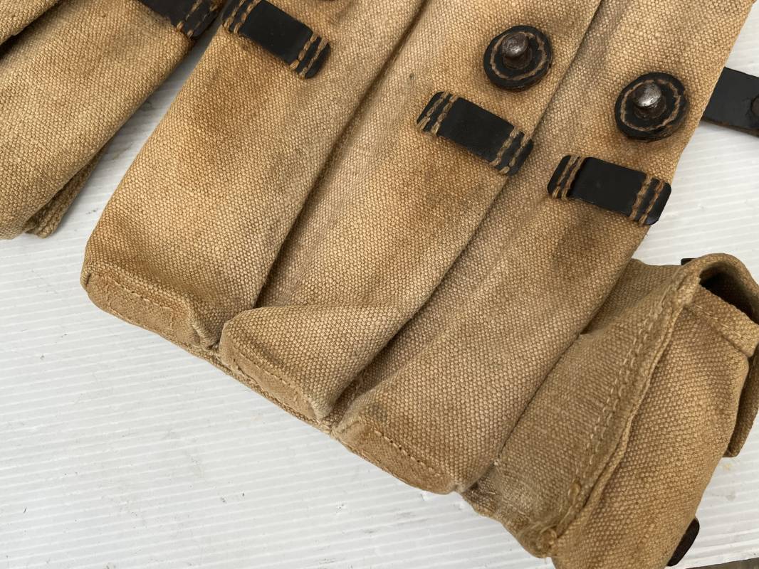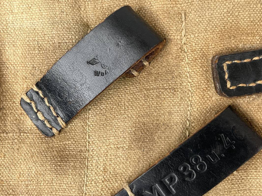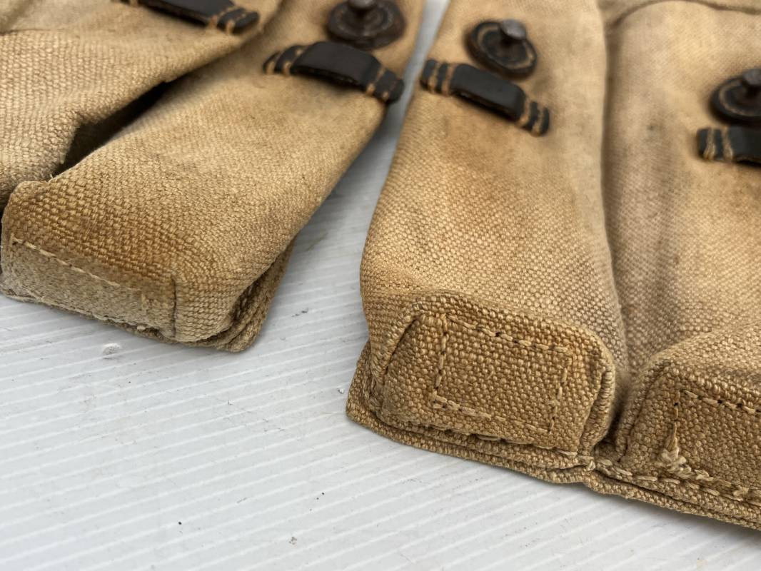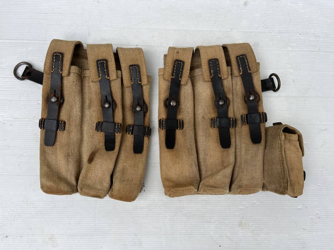 Rare paire de porte chargeurs MP40 en jaune . Paire homogène et du même fabricant . Fabrication en forte toile de couleur jaune . Passants en cuir noir . Passants cuir de ceinturon. Emplacement pour le port de la chargette. Tétons métalliques, Marquage fabricant sur chaque pochette CLG 43 , aigle WaA B 66 MP38 u 40 . Anneaux métalliques de fixation des bretelles de suspension a noté un petit rivet fer manquant mais ne nuisant en rien a la solidité du cuir ni de la mobilité de l anneau ( voir photos ) . Rare paire légèrement portée en bel état.Trés belle patine générale . Rare équipement pour troupe de combat de la WH . Ref 21600