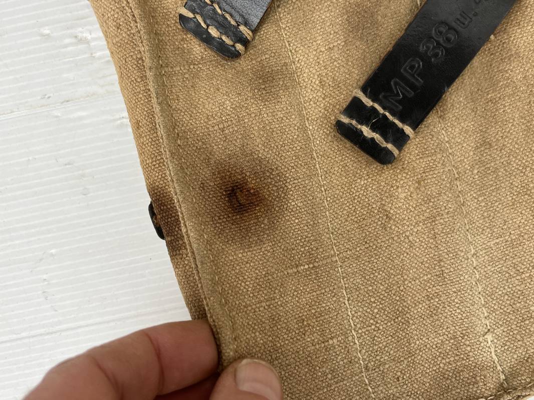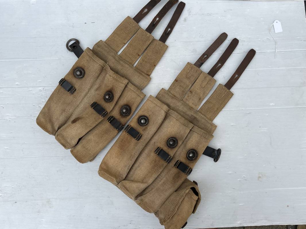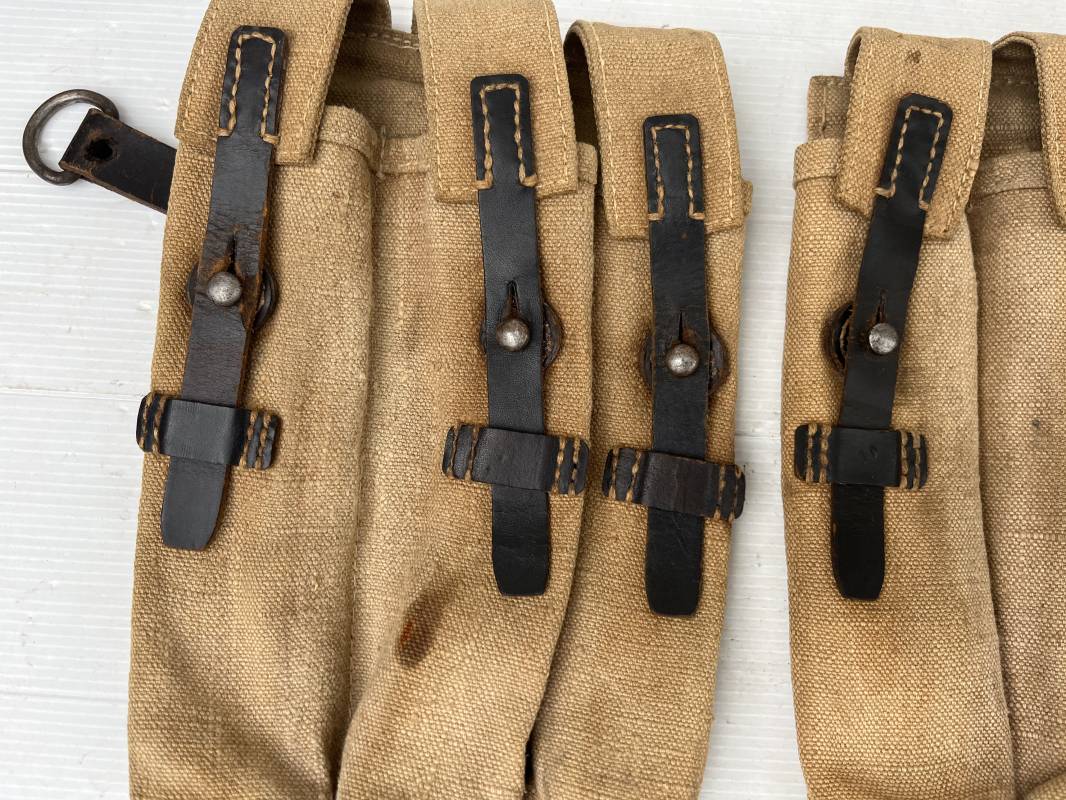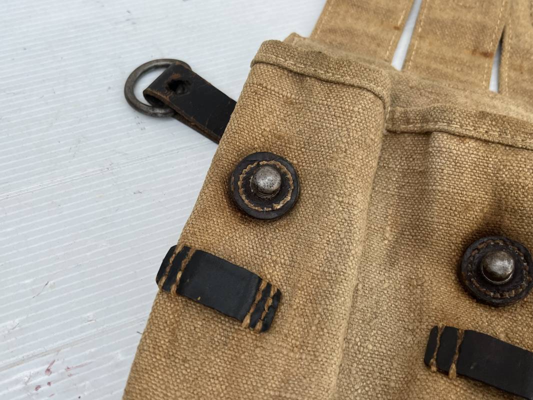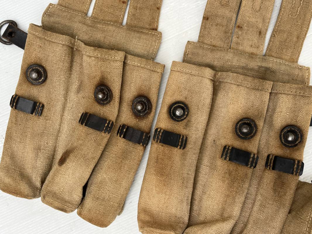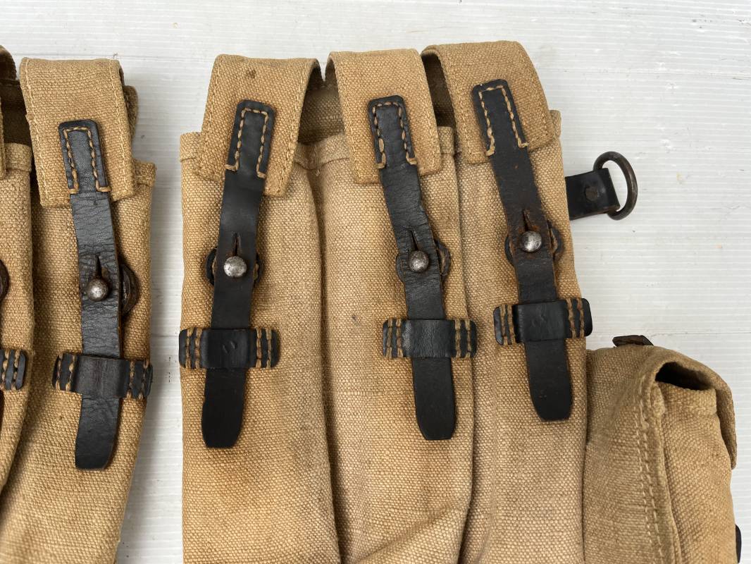 Rare paire de porte chargeurs MP40 en jaune . Paire homogène et du même fabricant . Fabrication en forte toile de couleur jaune . Passants en cuir noir . Passants cuir de ceinturon. Emplacement pour le port de la chargette. Tétons métalliques, Marquage fabricant sur chaque pochette CLG 43 , aigle WaA B 66 MP38 u 40 . Anneaux métalliques de fixation des bretelles de suspension a noté un petit rivet fer manquant mais ne nuisant en rien a la solidité du cuir ni de la mobilité de l anneau ( voir photos ) . Rare paire légèrement portée en bel état.Trés belle patine générale . Rare équipement pour troupe de combat de la WH . Ref 21600