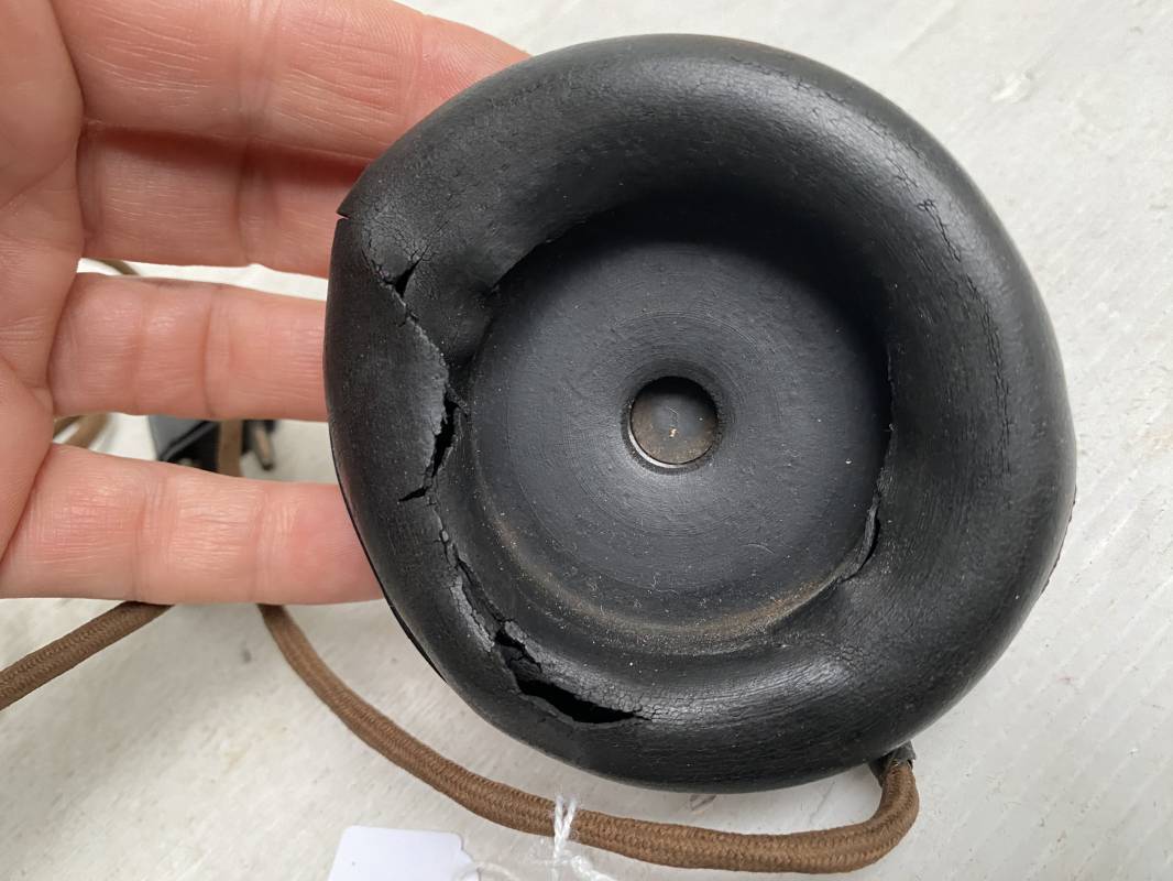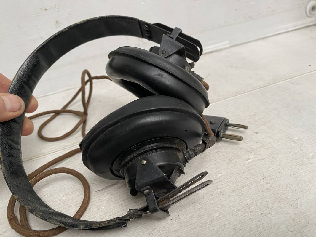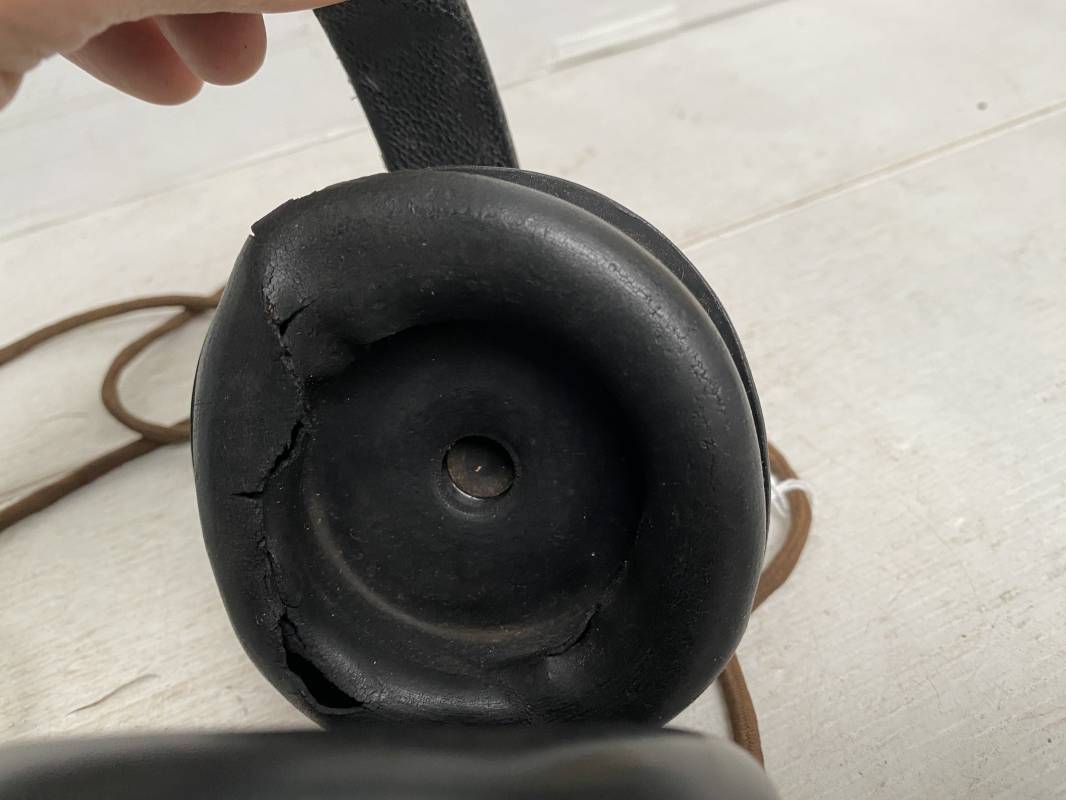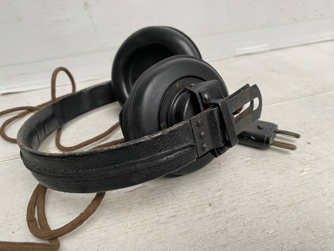Belle paire d'écouteurs d'un tankiste d ela Wehrmacht . Ces écouteurs ont été trouvés en brocante dans l'Est de la France . 100 % dans leur jus et intouchés . Cerclage métallique gainé en cuir noir . 2couteur avec marquage fabricant SABA , Type Dfh.b 1942 . Caoutchouc souple et d'origine . A noté déchirures sur un des écouteurs mais aucun manque .Cable gainé en coton brun avec fiche d'origine . Bel ensemble porté en bel état 1942/45 Ref 19057
