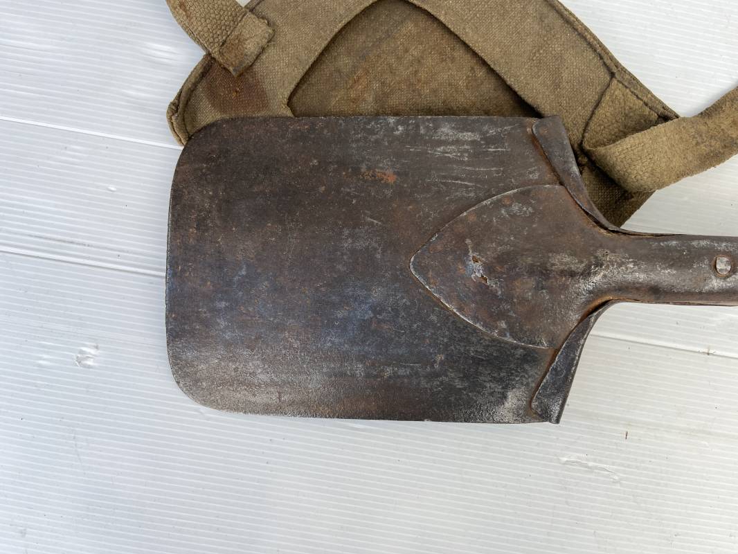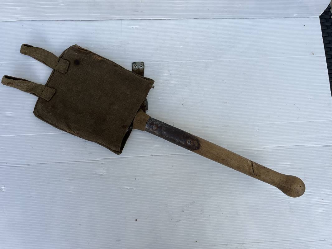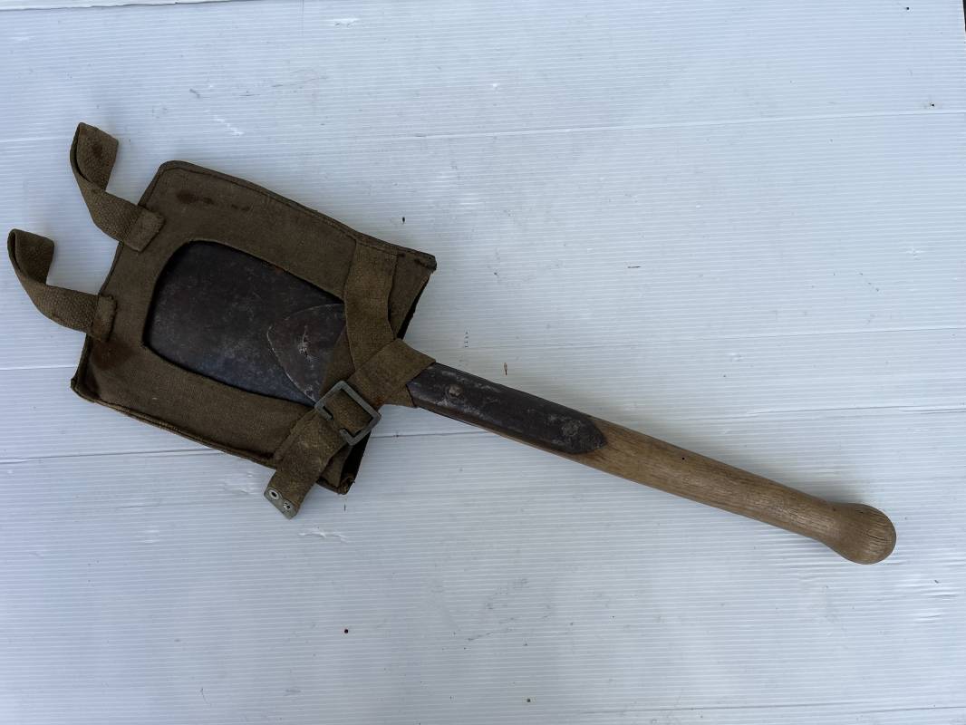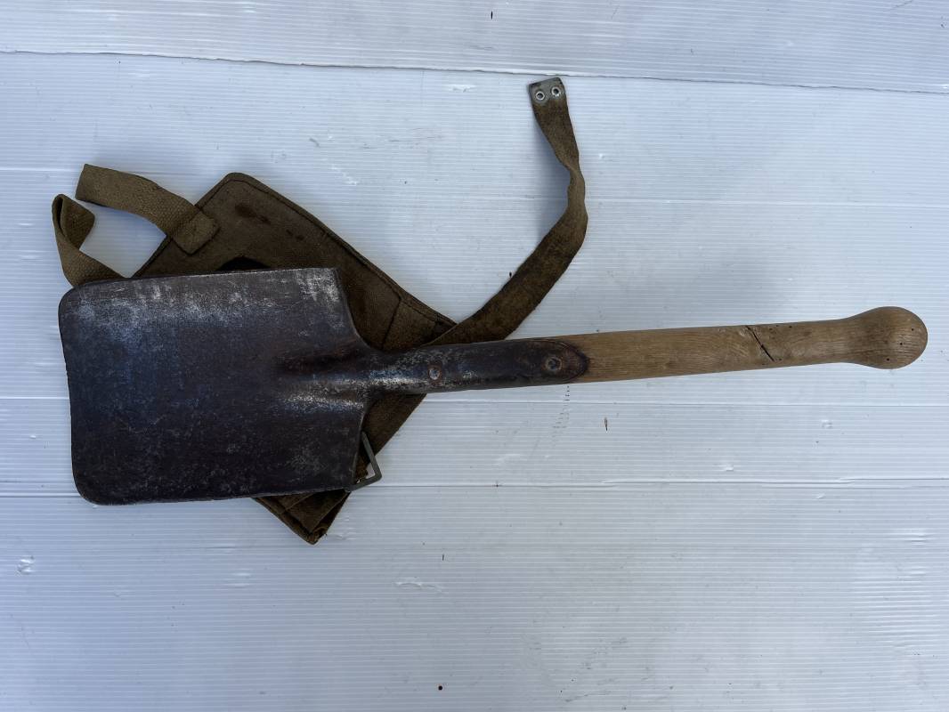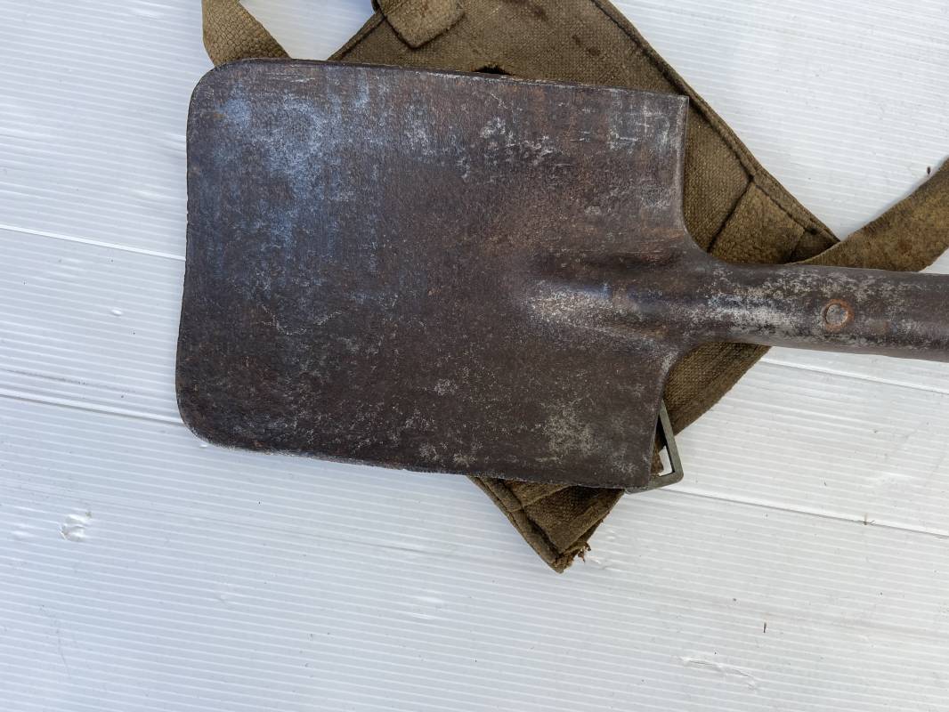 Pelle droite individuelle et son étui en toile verte . Modéle tropical et ersatz . Ce bel ensemble intouché a été trouvé en brocante dans le secteur de Coutances ( 50) Pelle acier. Manche en bois , légères traces de corrosion sur acier . Etui en forte toile verte . Lanière et passant de ceinturon en toile . Boucle métallique. Bel ensemble homogène, utilisé et dans son jus . bon état 100 % dans son jus et totalement intouché 1939/45. Ref 21486