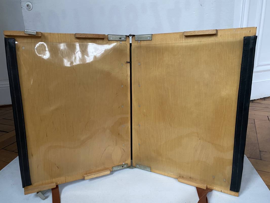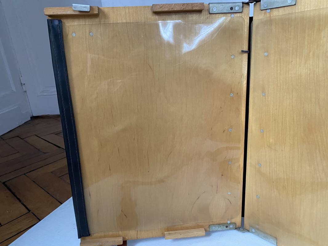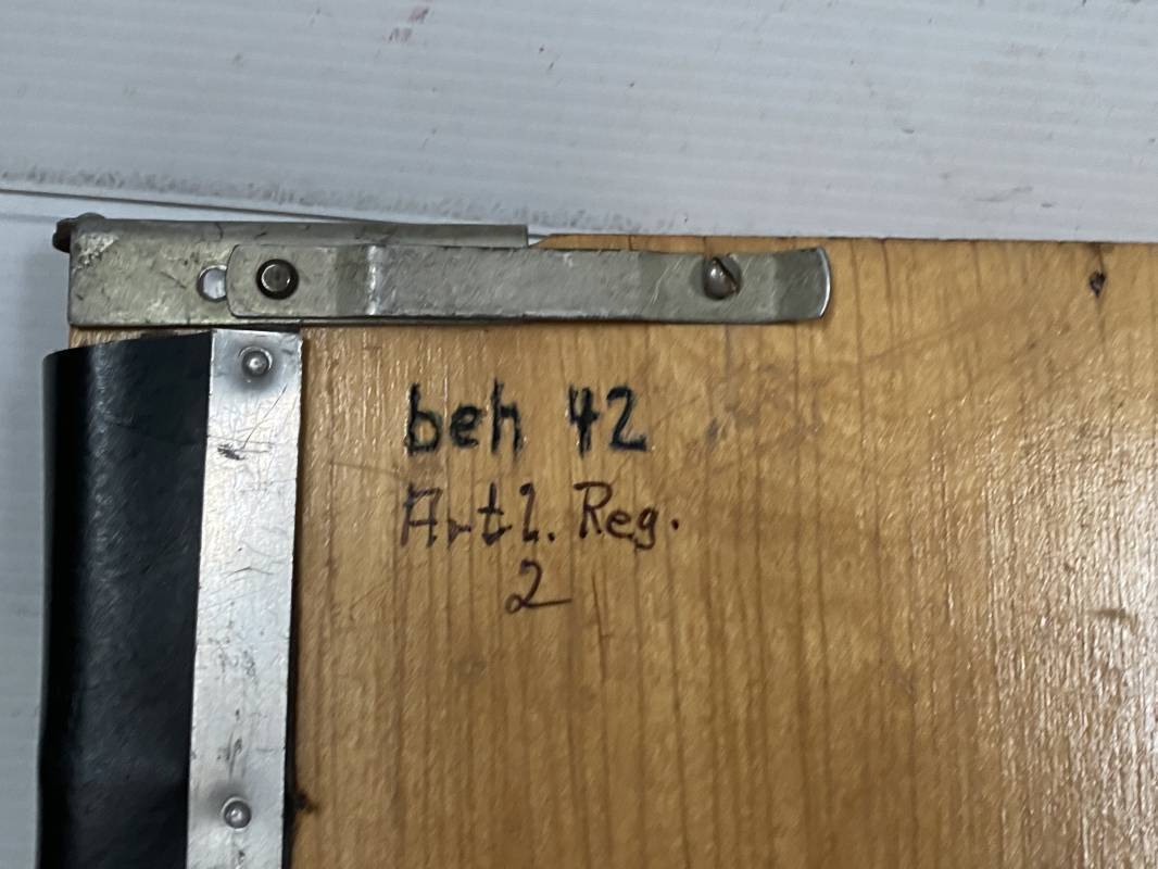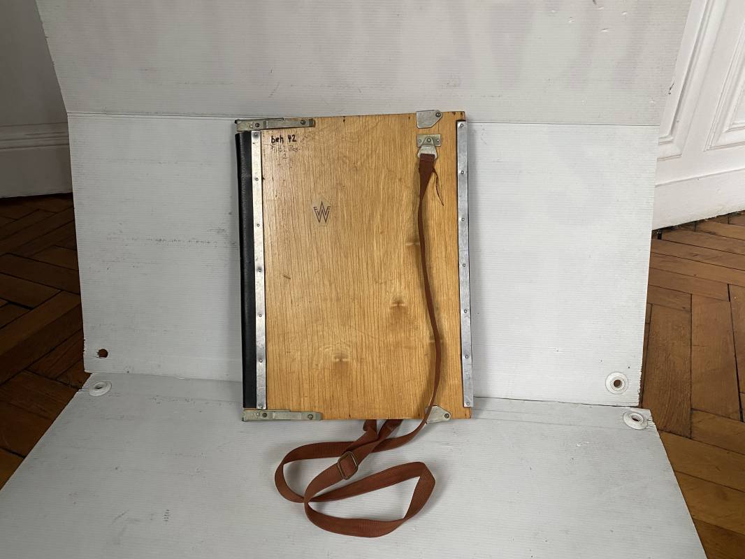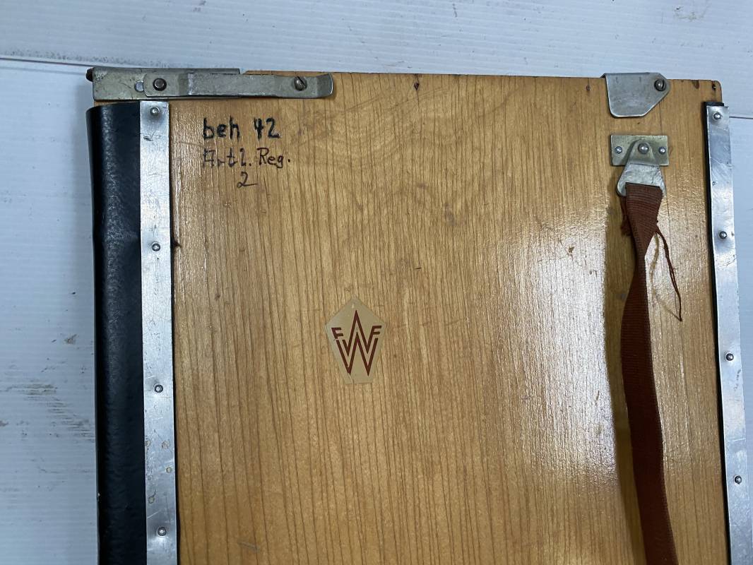 Rare planche à cartes d'un officier de la Wehrmacht. Deux panneaux bois pliants, dimensions (40x31cm) plié formant un plateau de 80x62 déplié. Intérieur avec plexis translucides. Marquage fabricant FWF. Marquages manuscrits beh 42 Artl Reg 2 .Sangle en toile pour le transport. Légèrement porté en parfait état. Bon équipement typique de l'officier de la Wehrmacht en campagne 1939/45. Ref 4908