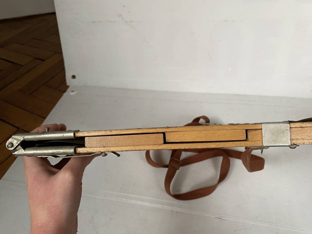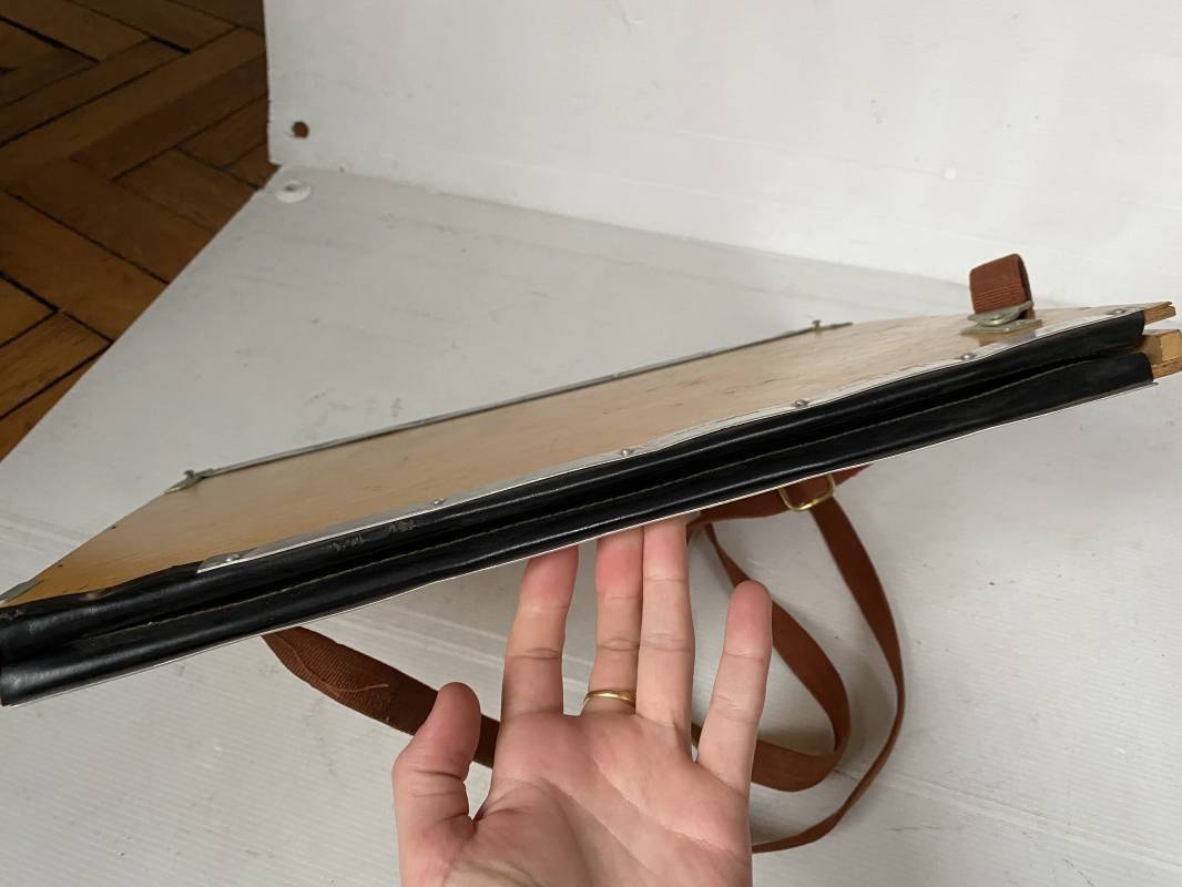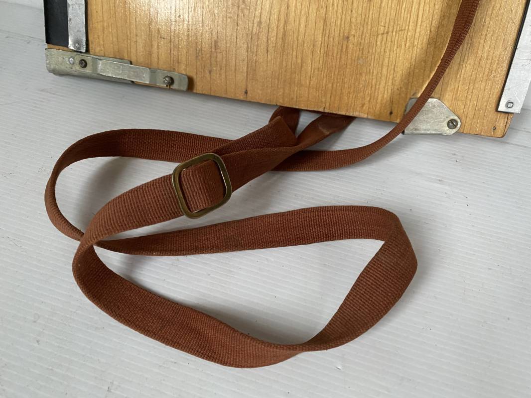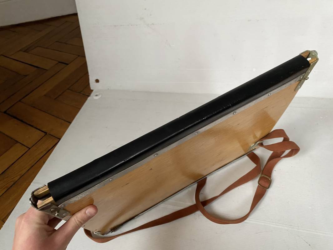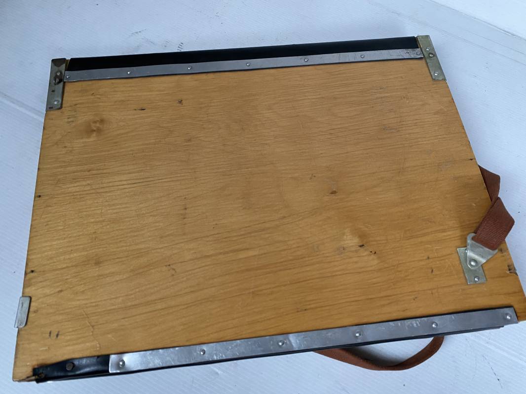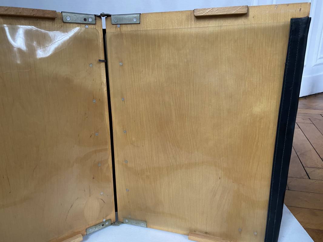 Rare planche à cartes d'un officier de la Wehrmacht. Deux panneaux bois pliants, dimensions (40x31cm) plié formant un plateau de 80x62 déplié. Intérieur avec plexis translucides. Marquage fabricant FWF. Marquages manuscrits beh 42 Artl Reg 2 .Sangle en toile pour le transport. Légèrement porté en parfait état. Bon équipement typique de l'officier de la Wehrmacht en campagne 1939/45. Ref 4908
