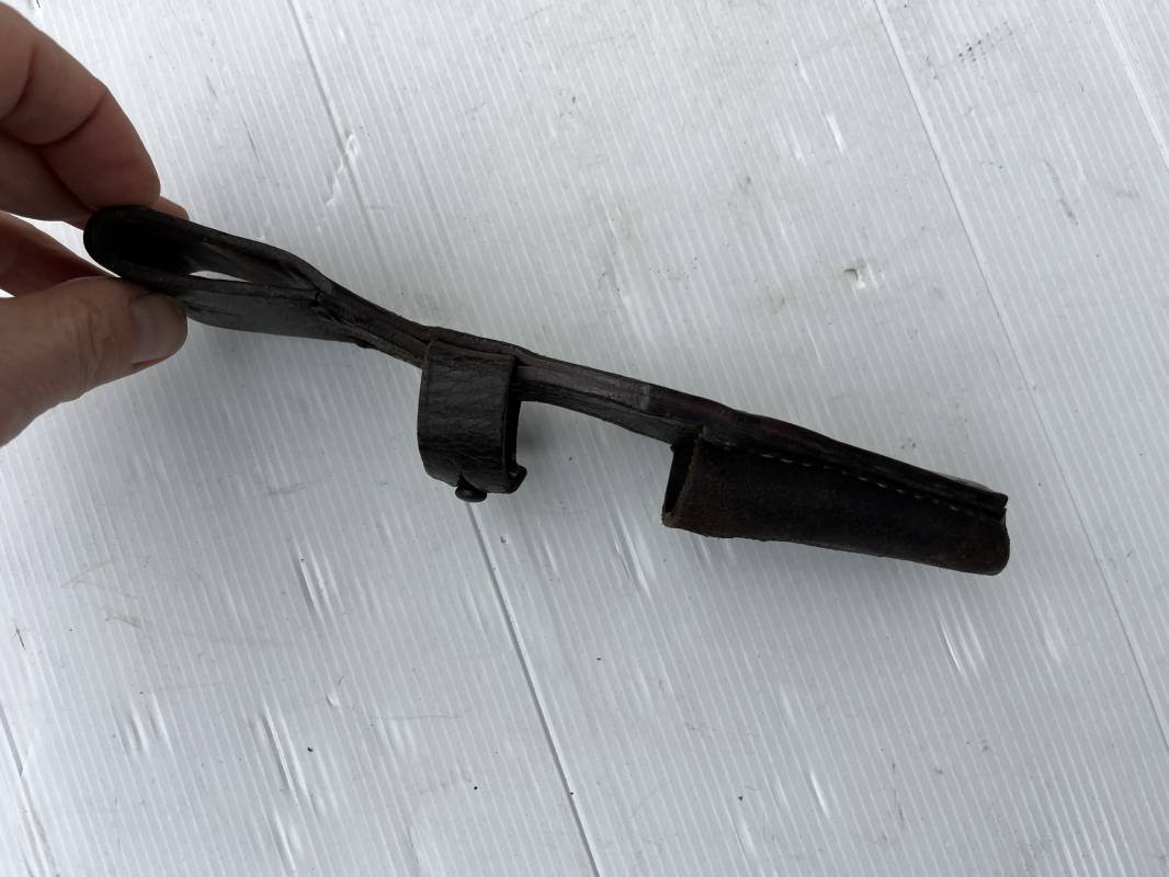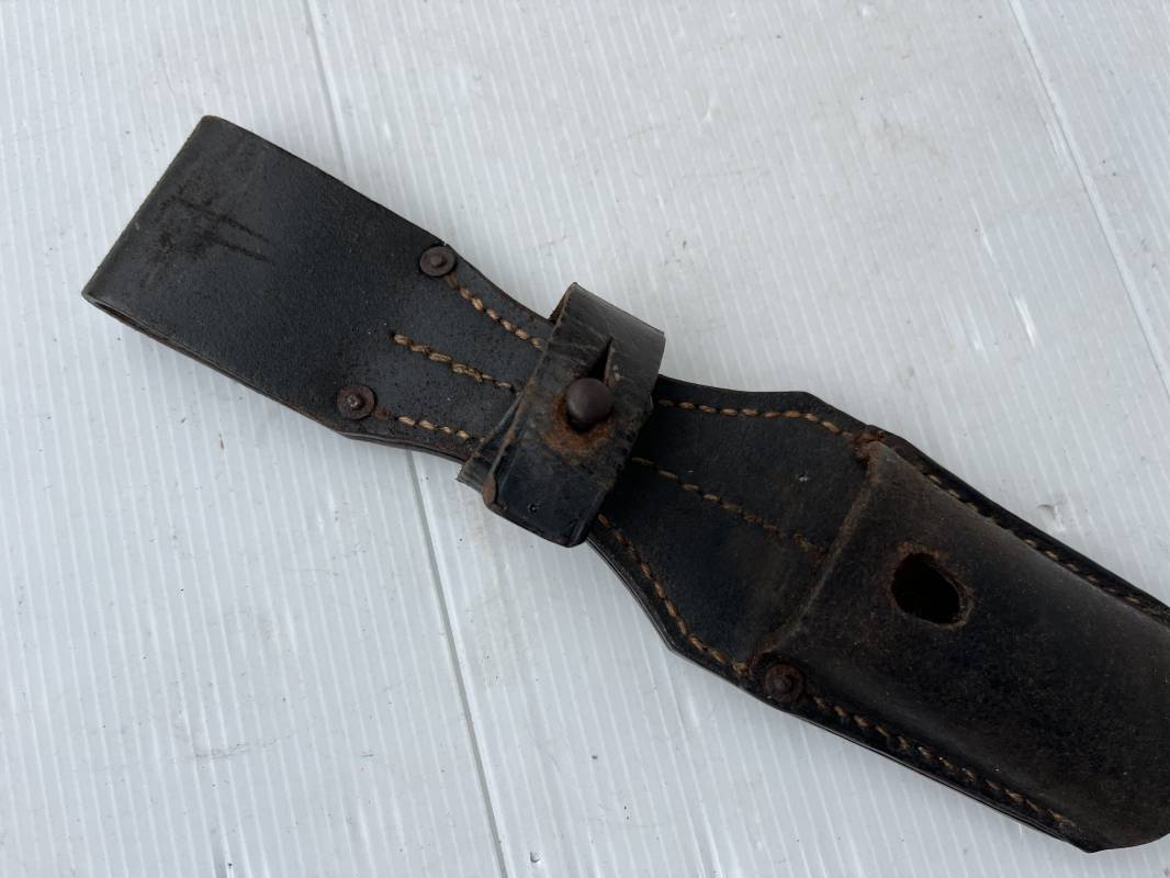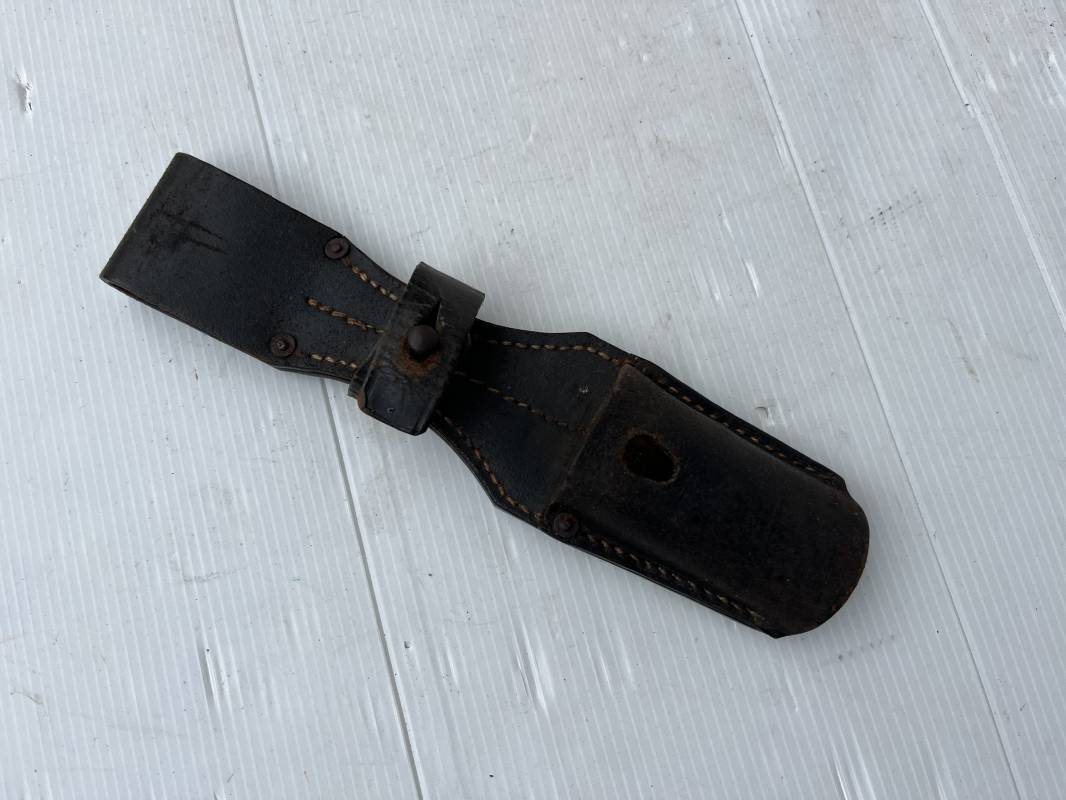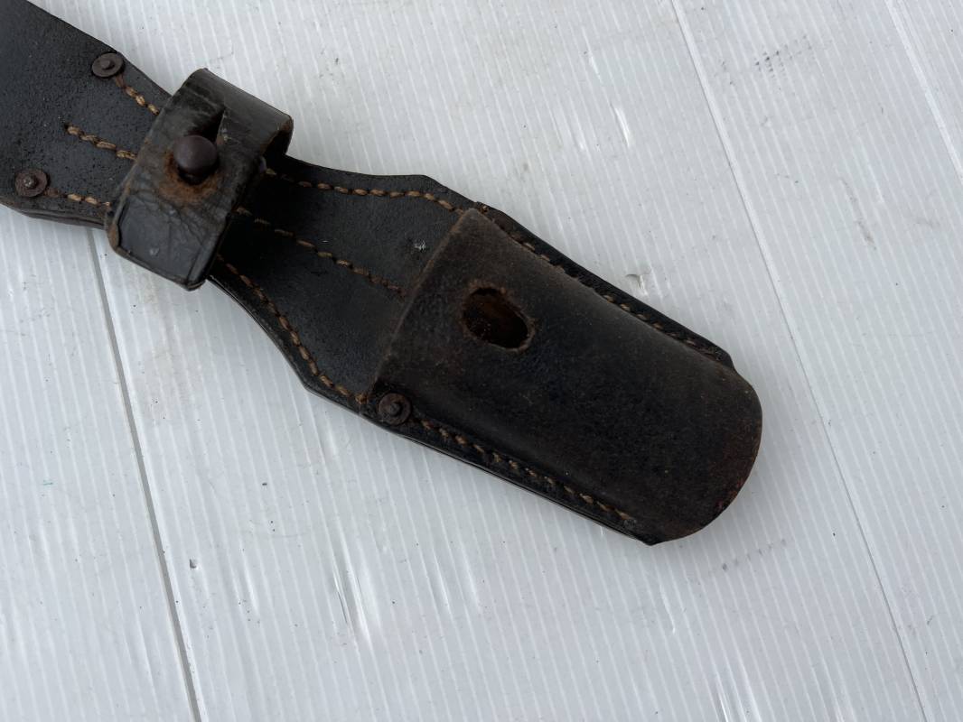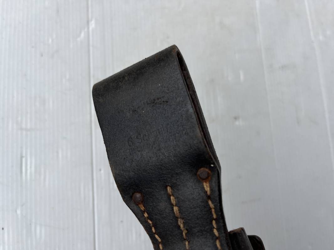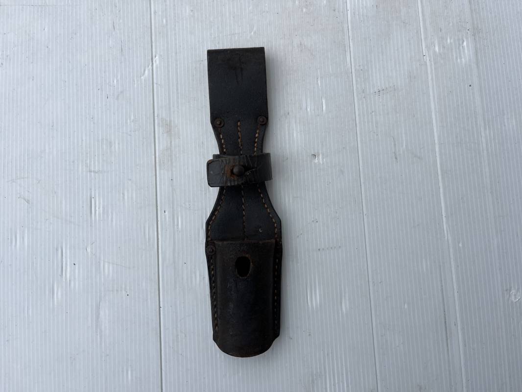 Trés beau porte baionnette 84/98 en cuir noir retourné . Rivets en fer . Passant cuir de ceinturon . Cuir souple . Marquage fabricant G.Schaub 1941 . Modele avec patelette en cuir et téton métallique . Parfait état , légérement porté . Ref 21770