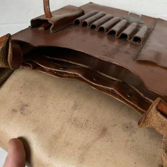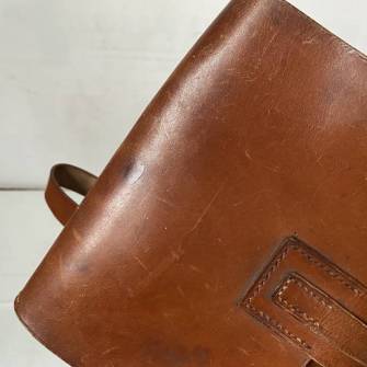 Très beau porte cartes modèle 1935 en cuir marron clair et sa liseuse intérieure. Passants de ceinturon en cuir. Boucles alu. Marquage fabricant A. Wald Haussen Kol N III 1936, cuir souple. Compartiments intérieurs et exterieurs pour stylos et réglettes. Liseuse en rhodoid translucide. Parfait état. Pourtour en cuir marron. Très bel ensemble homogène en parfait état 1935/38. Ref 17023