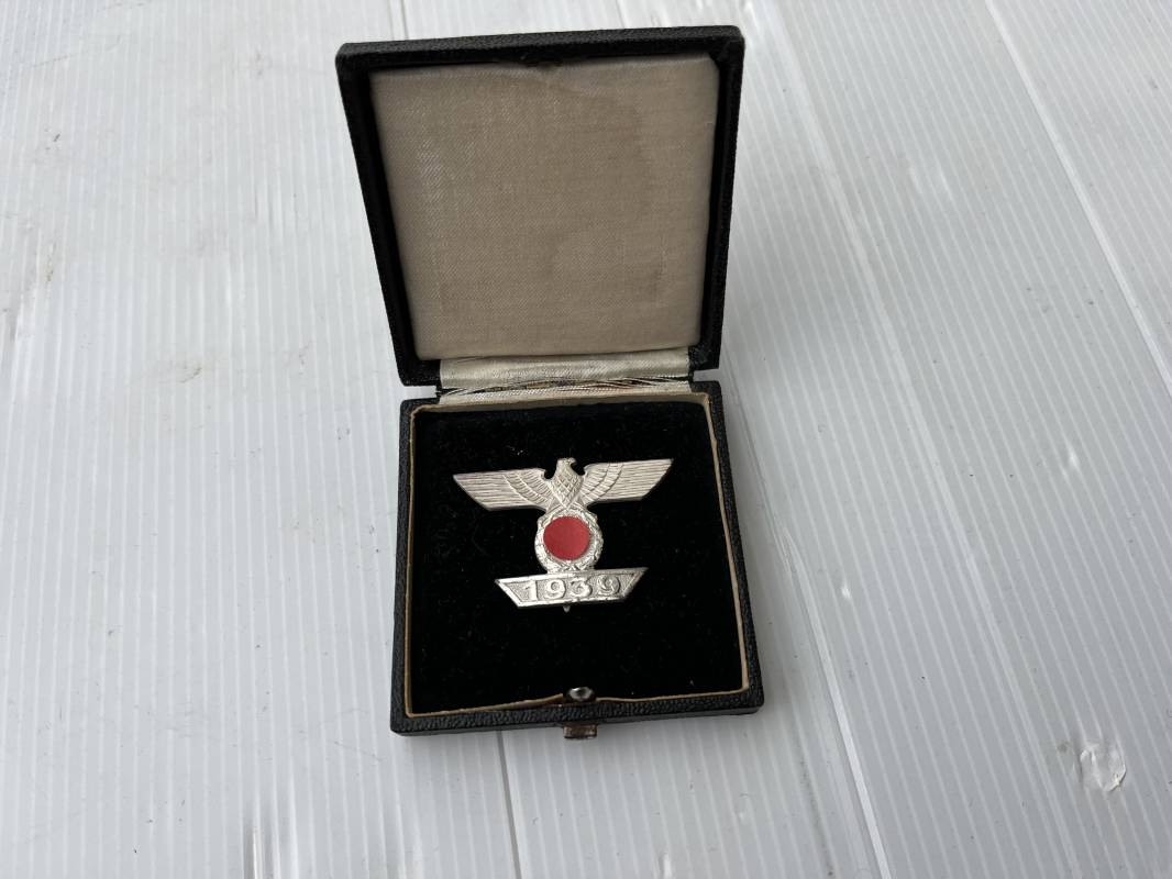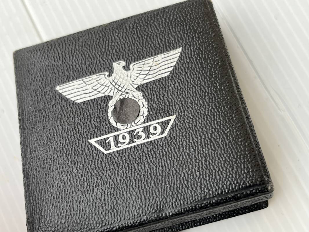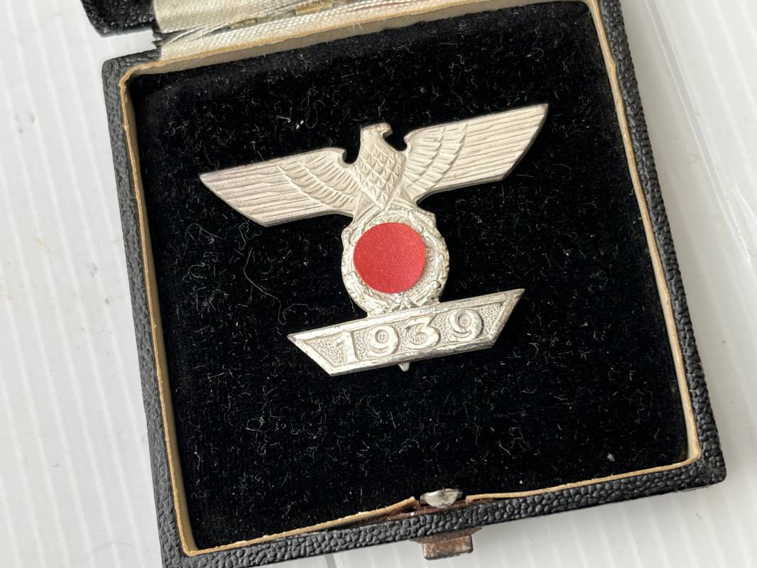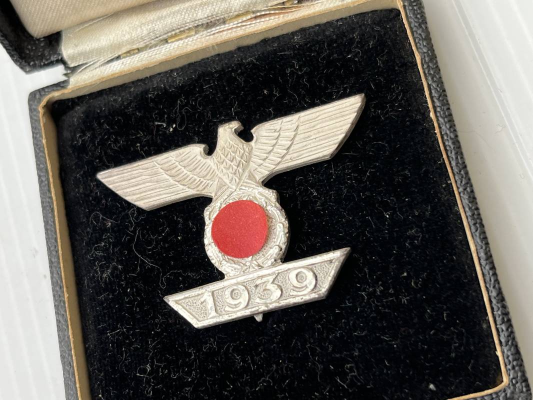 Rare rappel de croix de fer 1ére classe 1939 et son boitier . Rappel de trés belle qualité avec arètes polies , tres belle argenture au blanc de Berlin , attache et crochet au dos . Superbes reliefs . Rare boitier en carton recouvert papier grenelé noir , aigle sur le dessus , Bouton poussoir , intérieur doublé en velours noir et soie blanche . Trés bel ensemble en superbe état trouvé en succession familiale a Paris . Totalement intouché . Rare ensemble Ref 19854