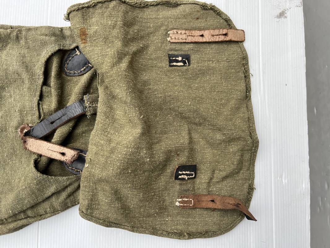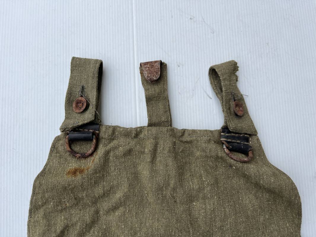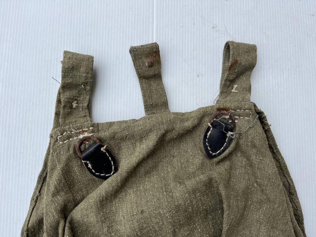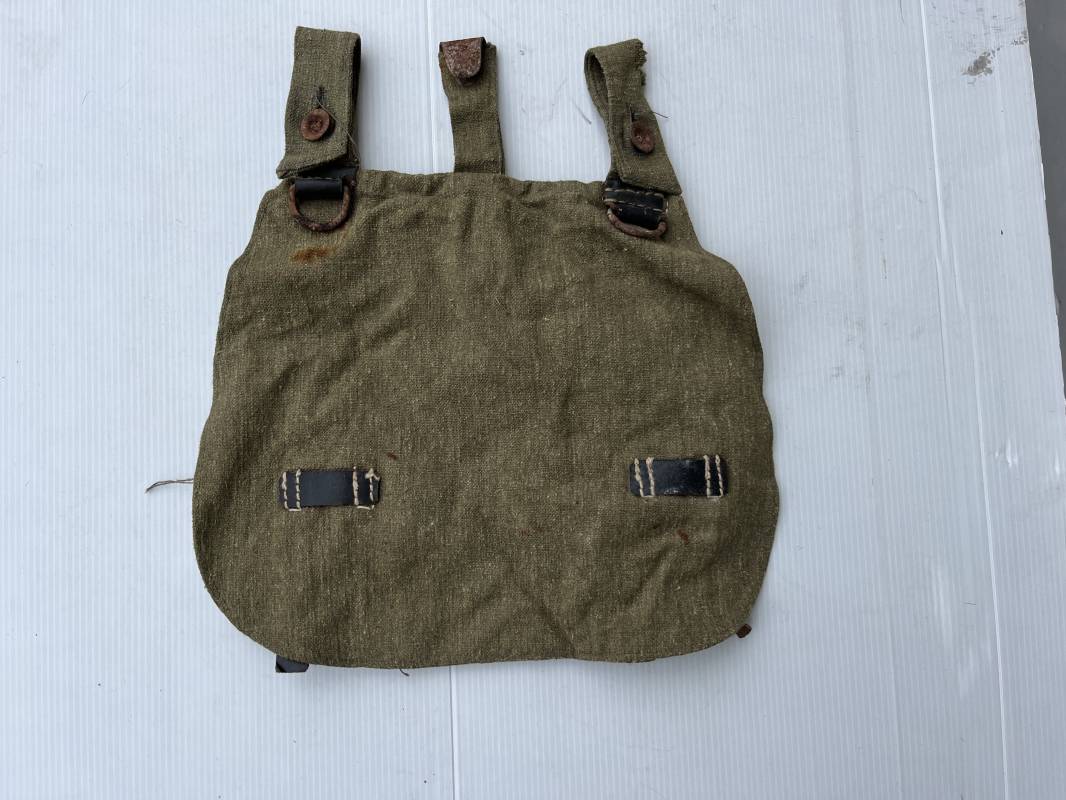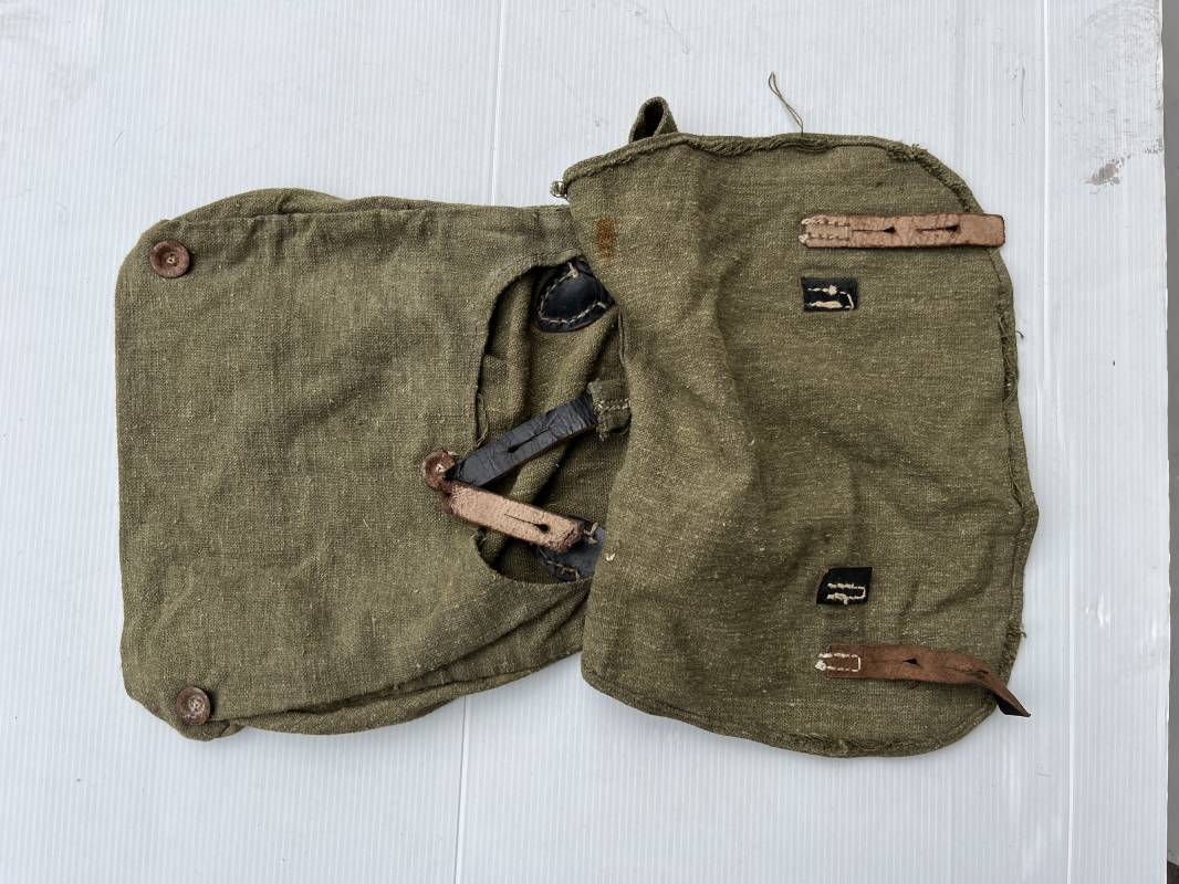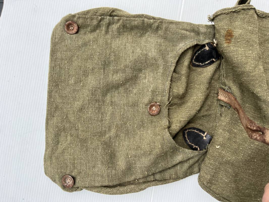 Beau sac a pain modéle 1931 . Forte toile de couleur verte . Passants et lanières cuir noir , anneaux et boutons fer , a noté traces de corrosion sur le metal , ce sac trouvé en brocante n a jamais été netoyé . Passants toile pour le port au ceinturon . Légèrement porté en bel état Ref 21964