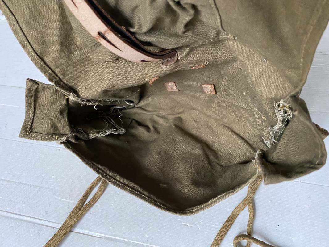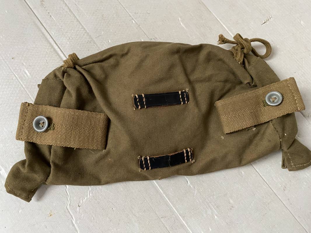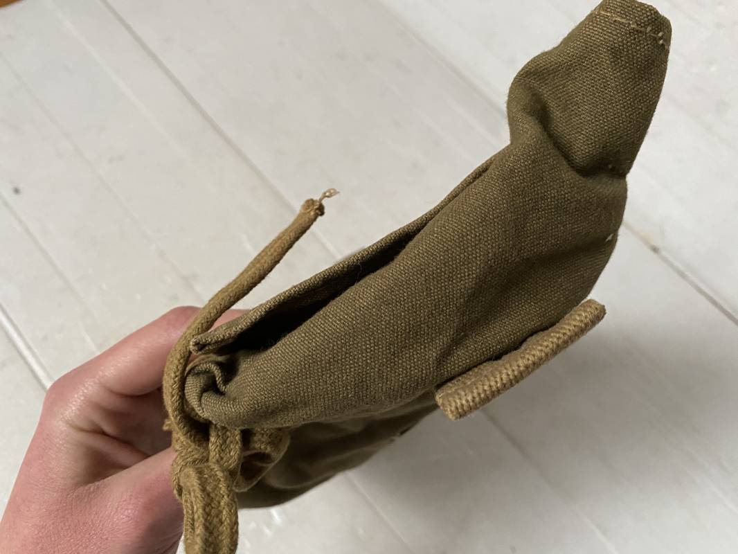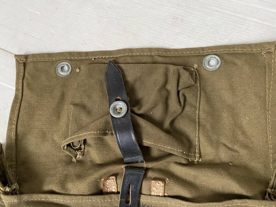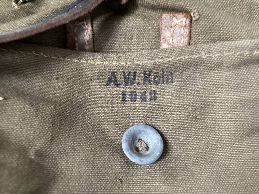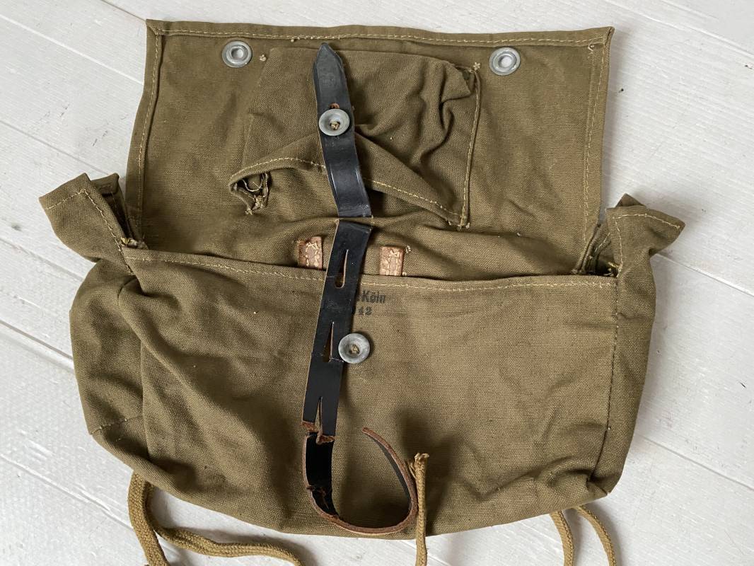 Trousse individuelle pour sac d'assaut (Sturm Gepack) de la Wehrmacht. Trousse en toile vert olive, deux passants toile de fixation au dos. Passants en cuir. Lanières toile. Boutons cuvette en zinc. Marquage fabricant Aw Koln 1942. Patelettes en cuir de fermeture dont une fragilisé (voir photo). Bel ensemble en parfait état. Légèrement porté en 1939/45. Ref 16364