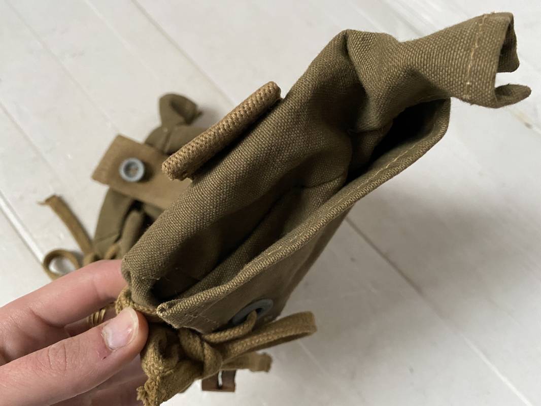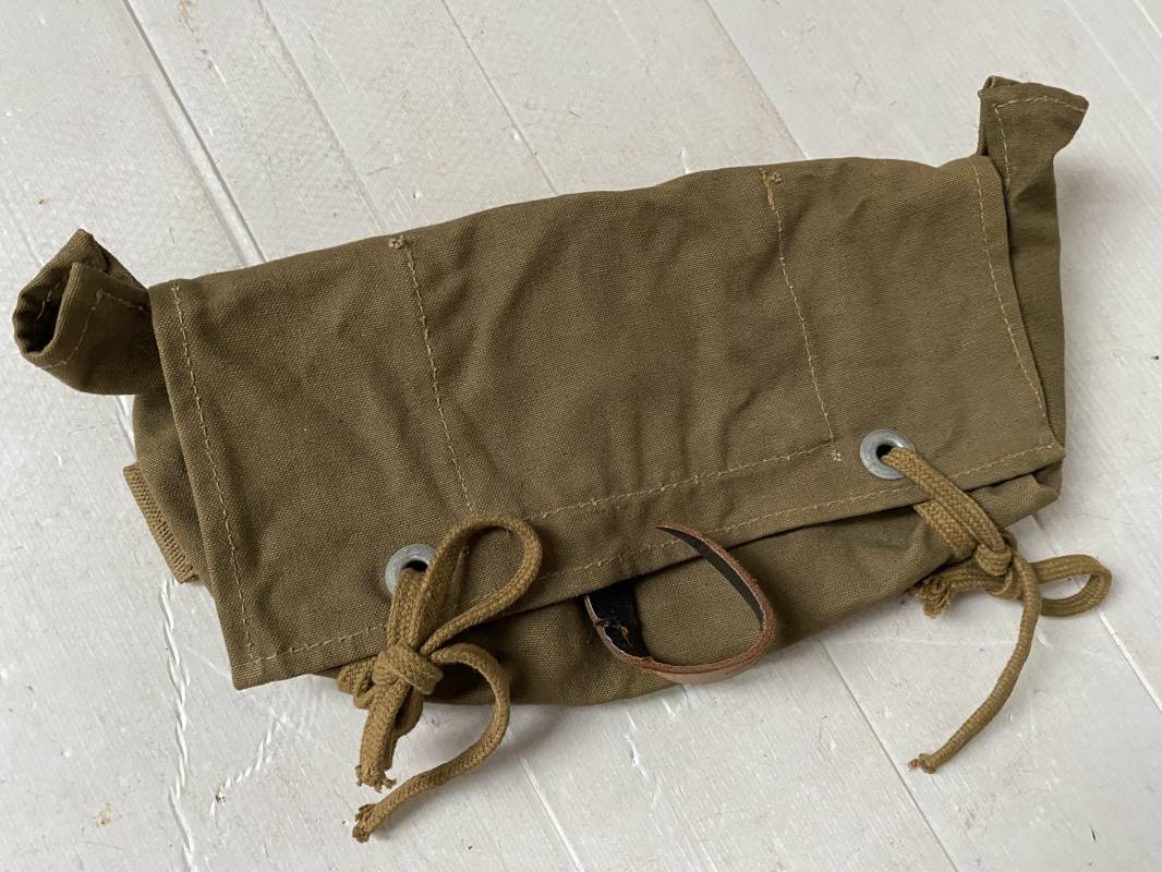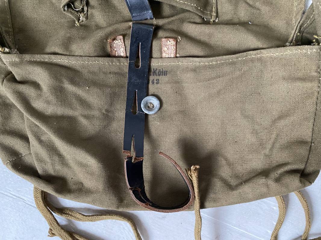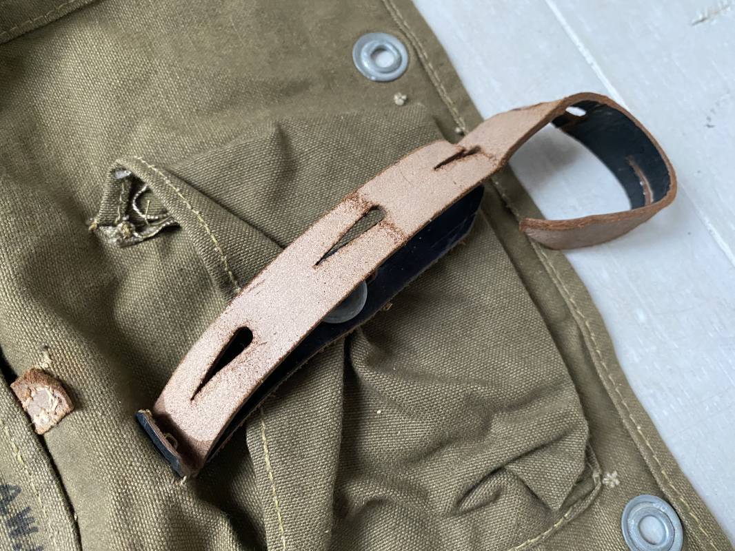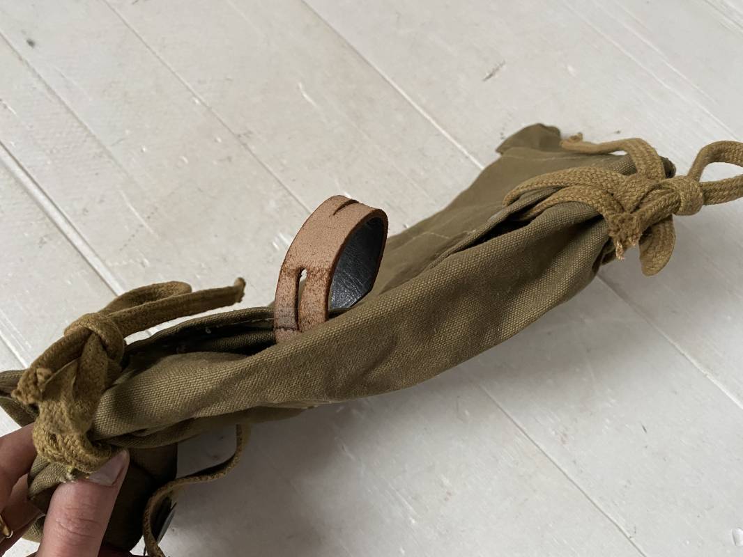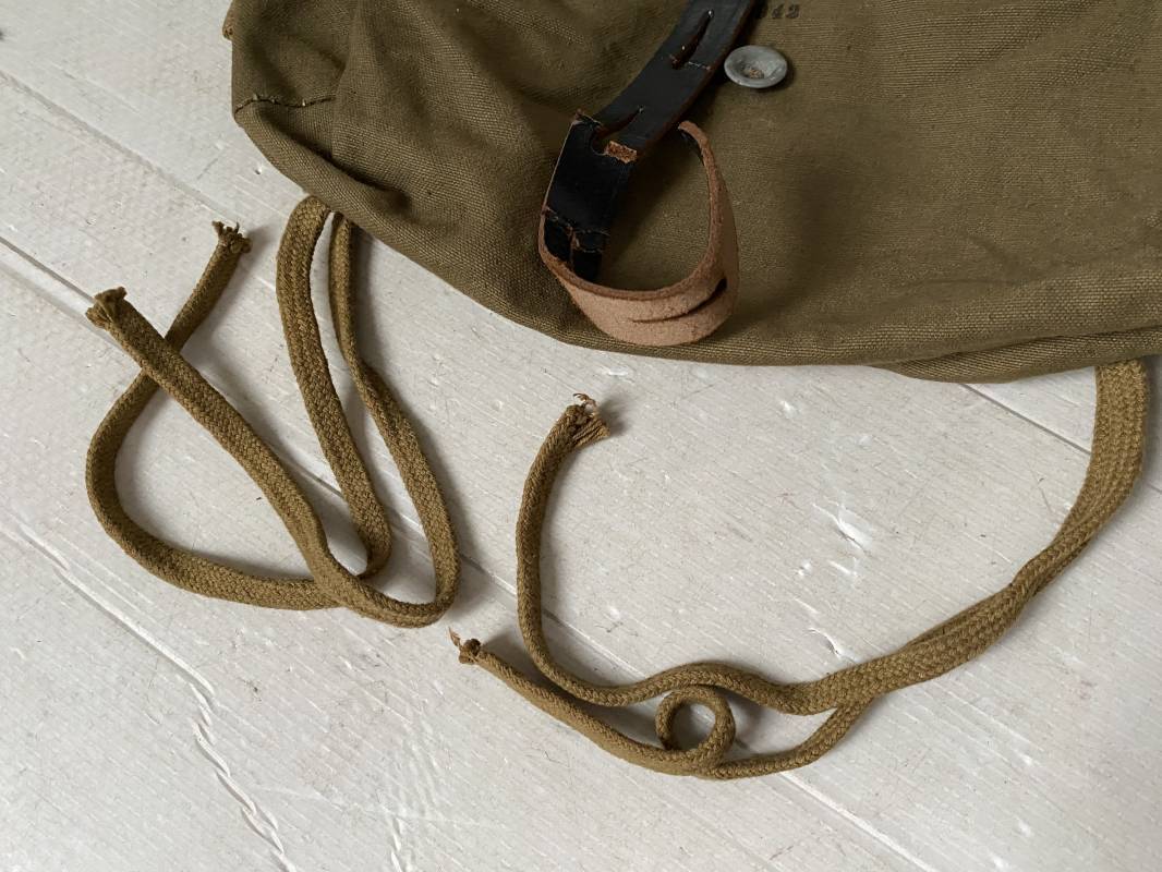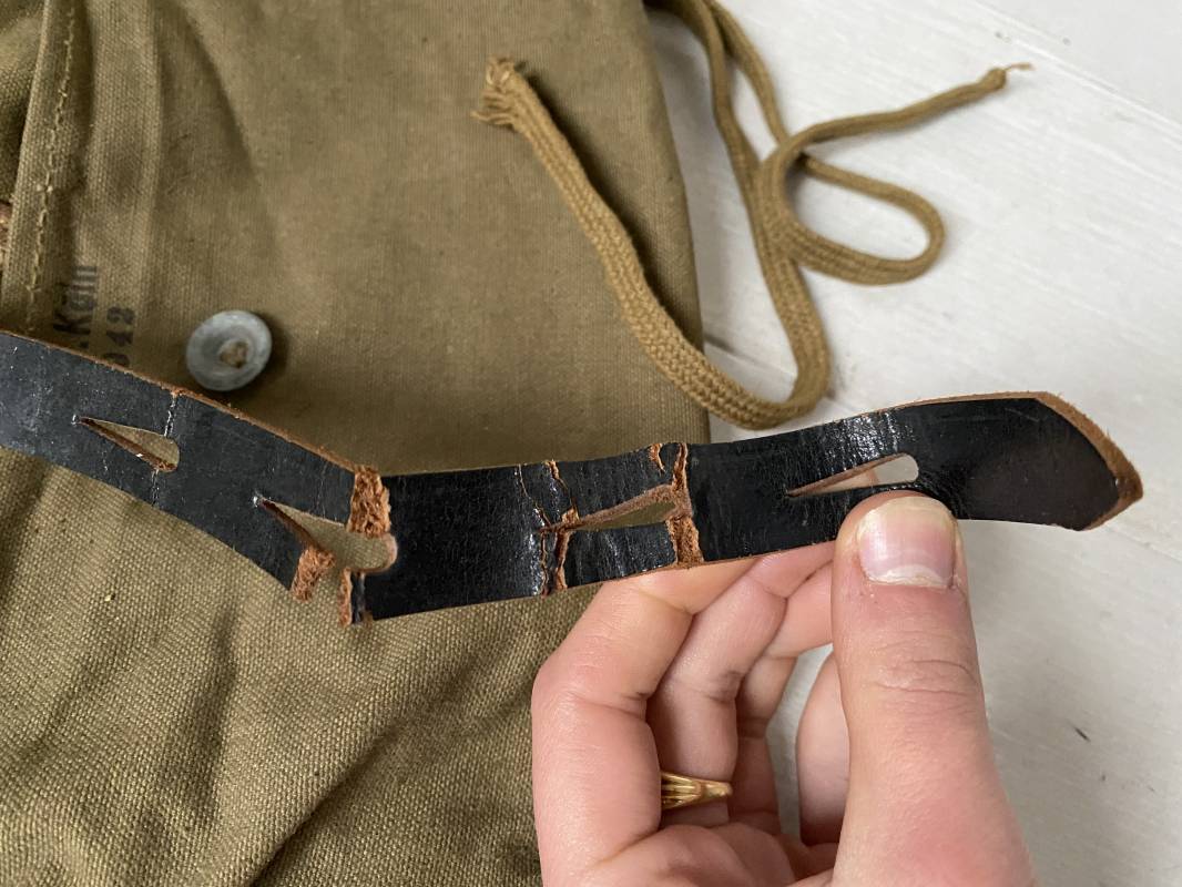 Trousse individuelle pour sac d'assaut (Sturm Gepack) de la Wehrmacht. Trousse en toile vert olive, deux passants toile de fixation au dos. Passants en cuir. Lanières toile. Boutons cuvette en zinc. Marquage fabricant Aw Koln 1942. Patelettes en cuir de fermeture dont une fragilisé (voir photo). Bel ensemble en parfait état. Légèrement porté en 1939/45. Ref 16364