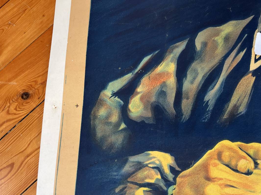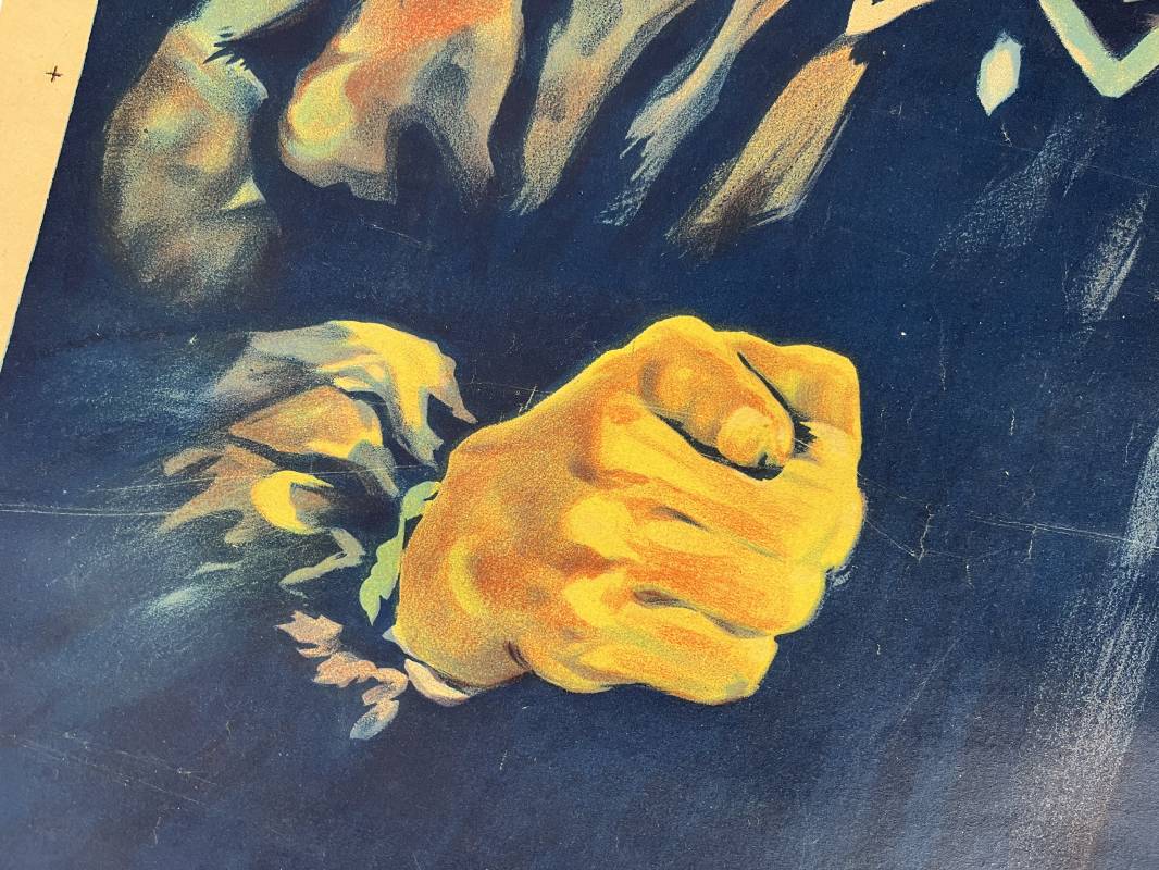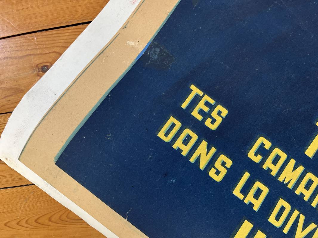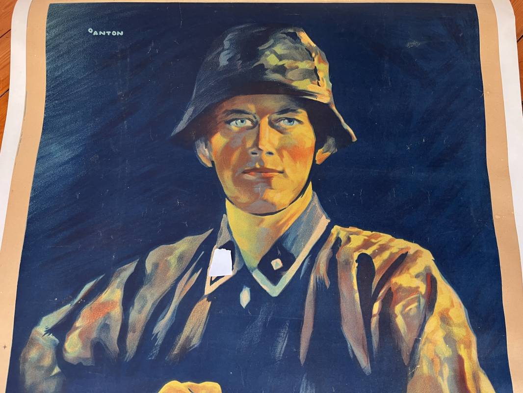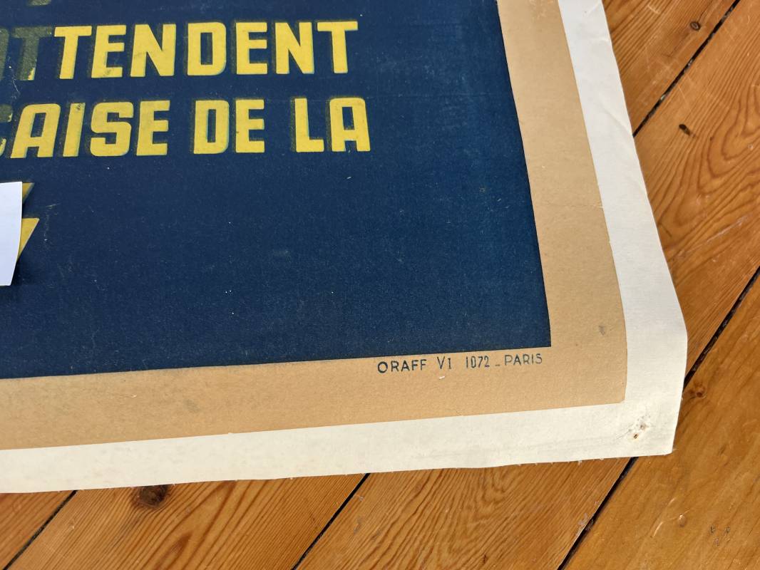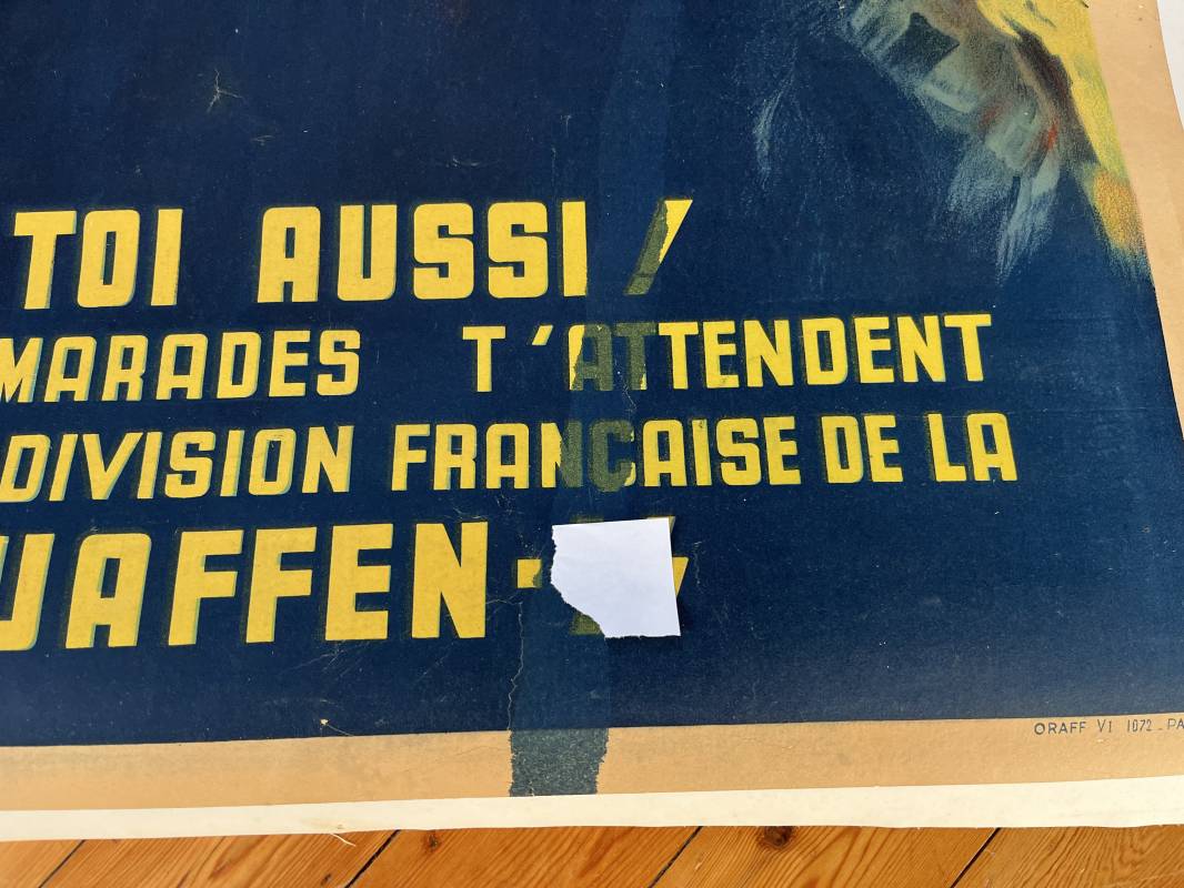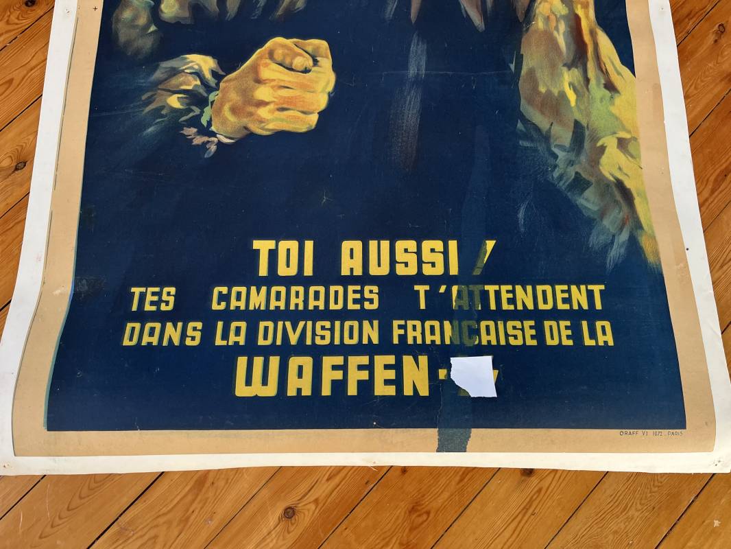 Trés rare affiche de recrutement de volontaire francais dans la Waffen SS . Division Charlemagne . ' Toi aussi ,tes camarades t attendent dans la division francaise de la Waffen SS ' Dimensions 790X1195 mm . Affiche entoilée , non plièe . Parfait état . Trés belles couleurs . Aucun manque ni dommage . Signé Anton . Imprimerie ORAFF VI 1072 Paris . Une des affiches de propagande les plus emblématique de la deuxième guerre mondiale §§ . Un document historique , véritable pièce de musée . Exceptionnel document d une grande rareté . 1943/44 Ref 19960