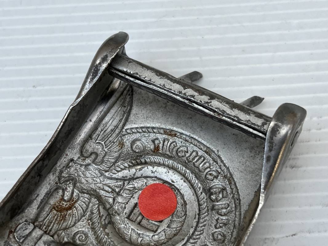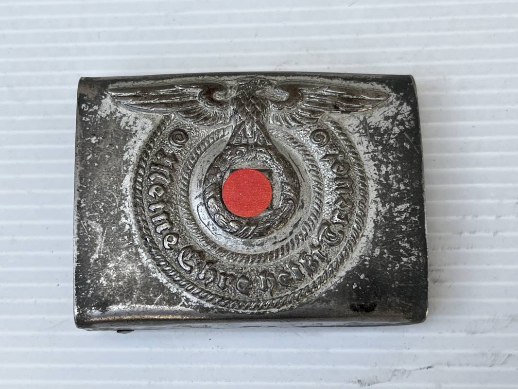 Très belle boucle Troupe de la Waffen SS . Boucle fer modèle 1940 ,Peinture gris argent d'origine. Passant et crochet métalliques. Fabrication de chez Overhoff . Légèrement porté en trés bel état Ref 7200