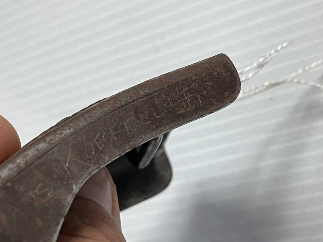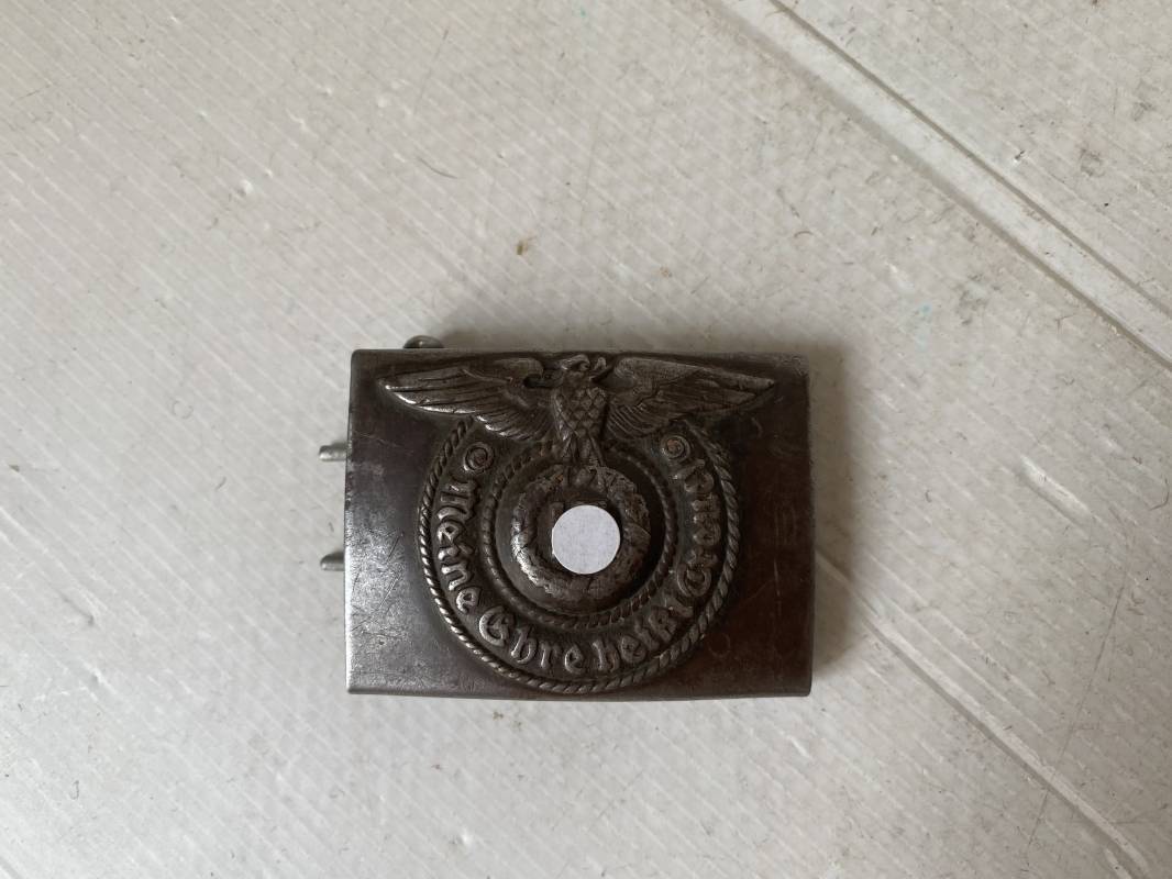 Rare boucle troupe de la Waffen SS en fer fabricant' Rodo' . Cette boucle est 100% dans son jus est a été retrouvée en Normandie. Dimensions 63x48mm. Très beaux reliefs. Boucle portée et patinée. La peinture verte extèrieure n'est plus présente. Trace de peinture à l'intérieur de la boucle. Marquage fabricant Rodo. Crochet et passant métalliques. Nom et prénom du soldat sur la tranche de la boucle (mention manuscrite) avec croix. Hans Koe Fell. Boucle 100% dans son jus 1942/44. Ref 16502