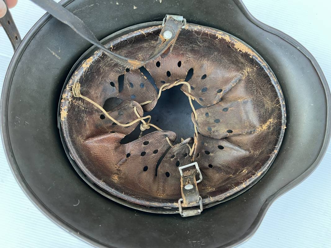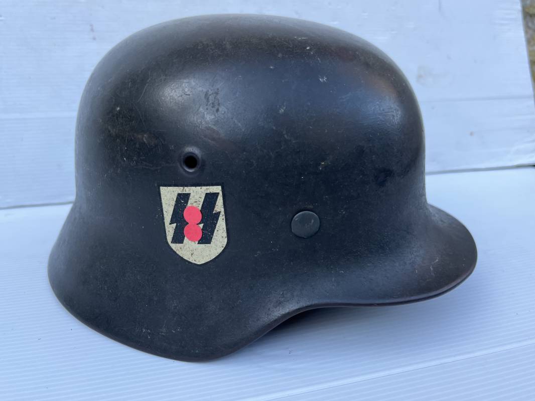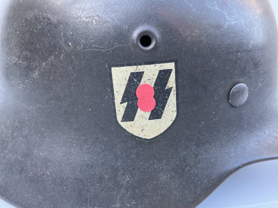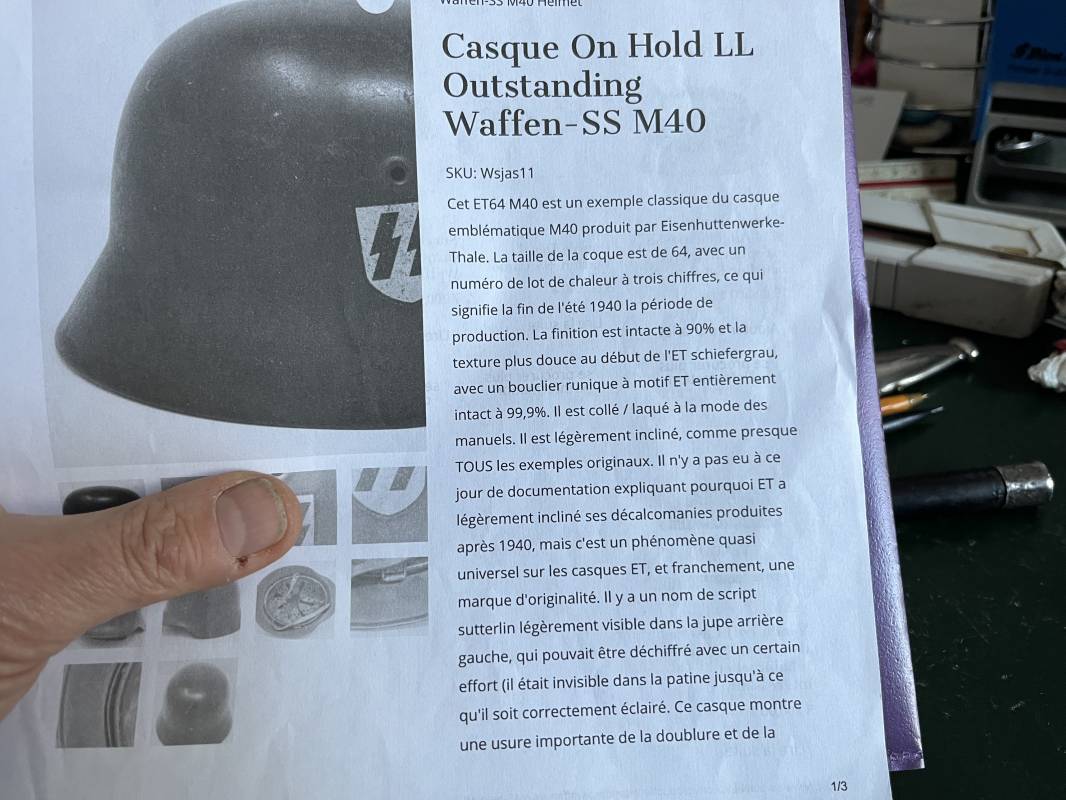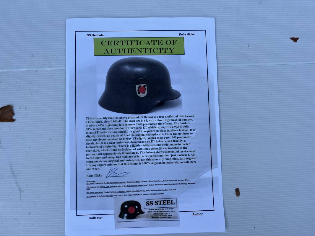 Exceptionnel casque modéle 1940 de la Waffen SS avec runen sur le coté gauche . Fabricant Eisenhuttenwerke Thale . Ce casque est dans un état exceptionnel 100 % intouché . . Certificat d authenticité et de vente de chez Steel Helmet USA Kelly Hicks ( un des plus grands specialistes des casques allemands au monde ) . . Authenticité absolue garantie pour ce casque . Peinture feldgrau lisse , non frottée non nettoyée . . Un insigne runen sur le coté droit a 100 % Insigne du modele de chez ET légèrement incliné .L inclinaison des runen est typique chez le fabricant ET . Marquage fabricant ET 64 numero nuquière 4 406 . Trois rivets avec contre rivets jamais démontés . Cerclage en zinc modele 1940 . Coiffe en cuir marron taille 56 , cuir souple patiné . Lace en coton d origine . Jugulaire en cuir noir , , boucle ALU a un ardillon , treize trous . Trés beau casque sans aucun défaut . Une pièce exceptionnel par son état et son jus . Ref 16179