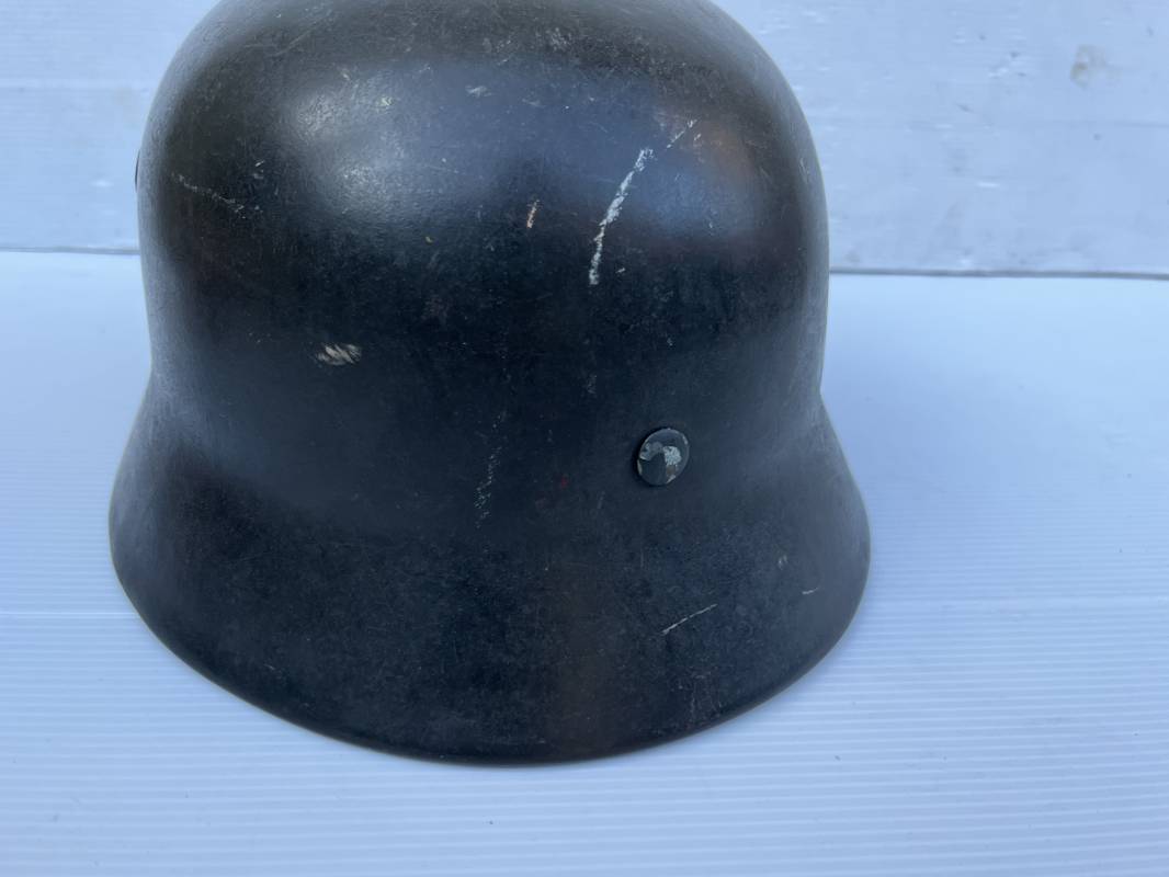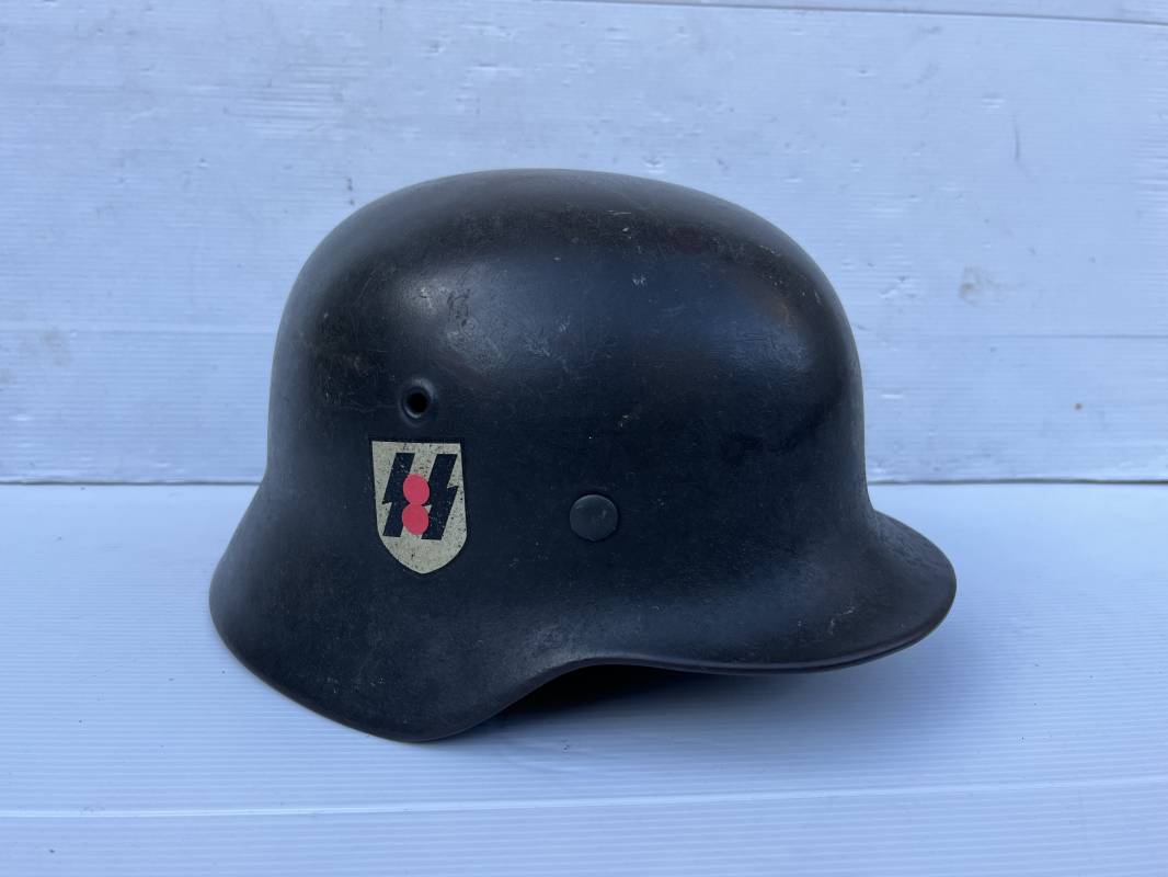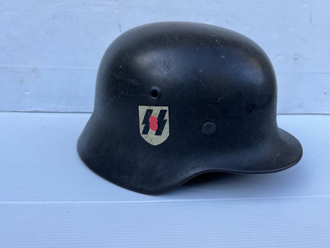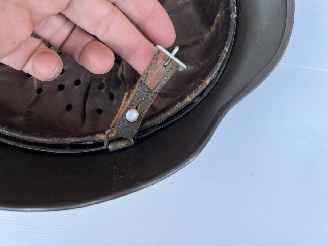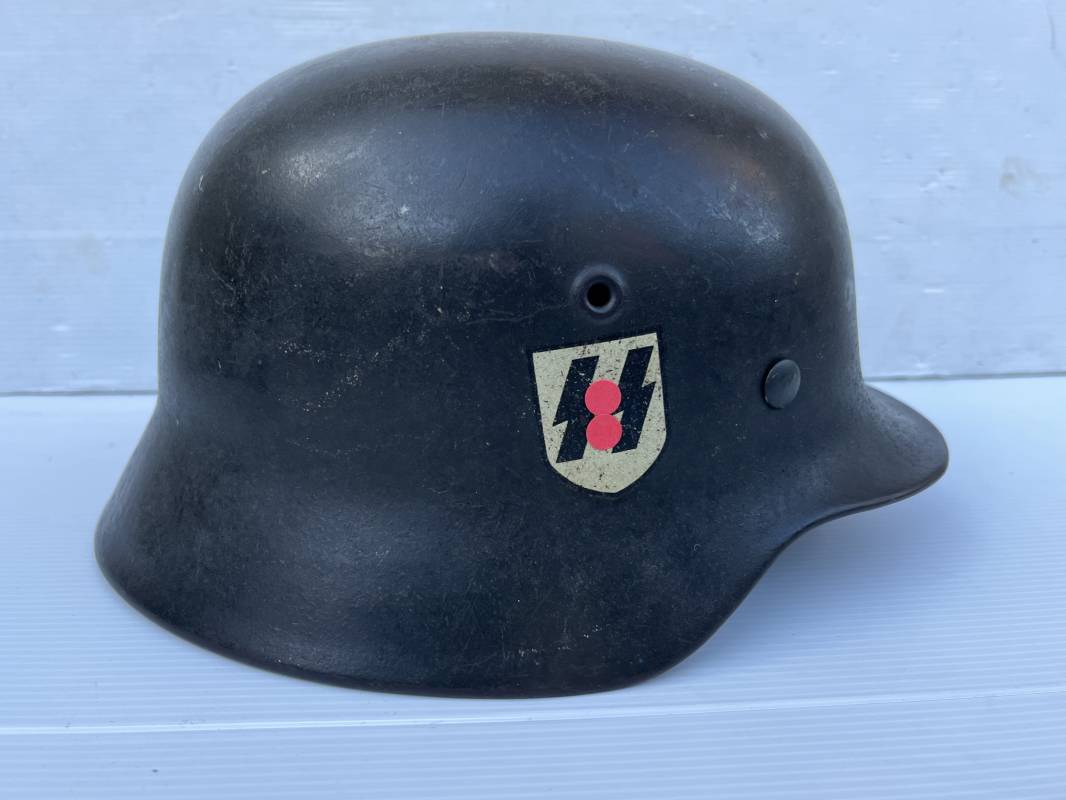Exceptionnel casque modéle 1940 de la Waffen SS avec runen sur le coté gauche . Fabricant Eisenhuttenwerke Thale . Ce casque est dans un état exceptionnel 100 % intouché . . Certificat d authenticité et de vente de chez Steel Helmet USA Kelly Hicks ( un des plus grands specialistes des casques allemands au monde ) . . Authenticité absolue garantie pour ce casque . Peinture feldgrau lisse , non frottée non nettoyée . . Un insigne runen sur le coté droit a 100 % Insigne du modele de chez ET légèrement incliné .L inclinaison des runen est typique chez le fabricant ET . Marquage fabricant ET 64 numero nuquière 4 406 . Trois rivets avec contre rivets jamais démontés . Cerclage en zinc modele 1940 . Coiffe en cuir marron taille 56 , cuir souple patiné . Lace en coton d origine . Jugulaire en cuir noir , , boucle ALU a un ardillon , treize trous . Trés beau casque sans aucun défaut . Une pièce exceptionnel par son état et son jus . Ref 16179