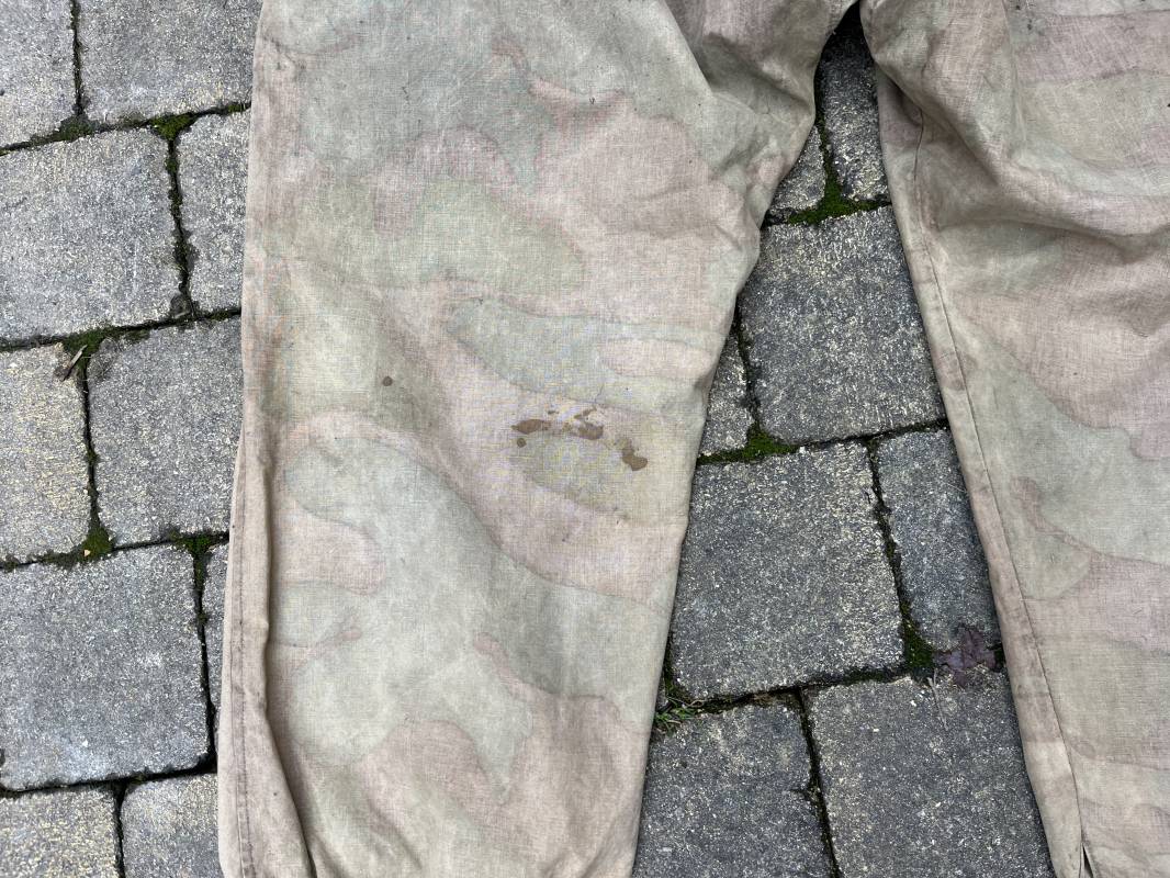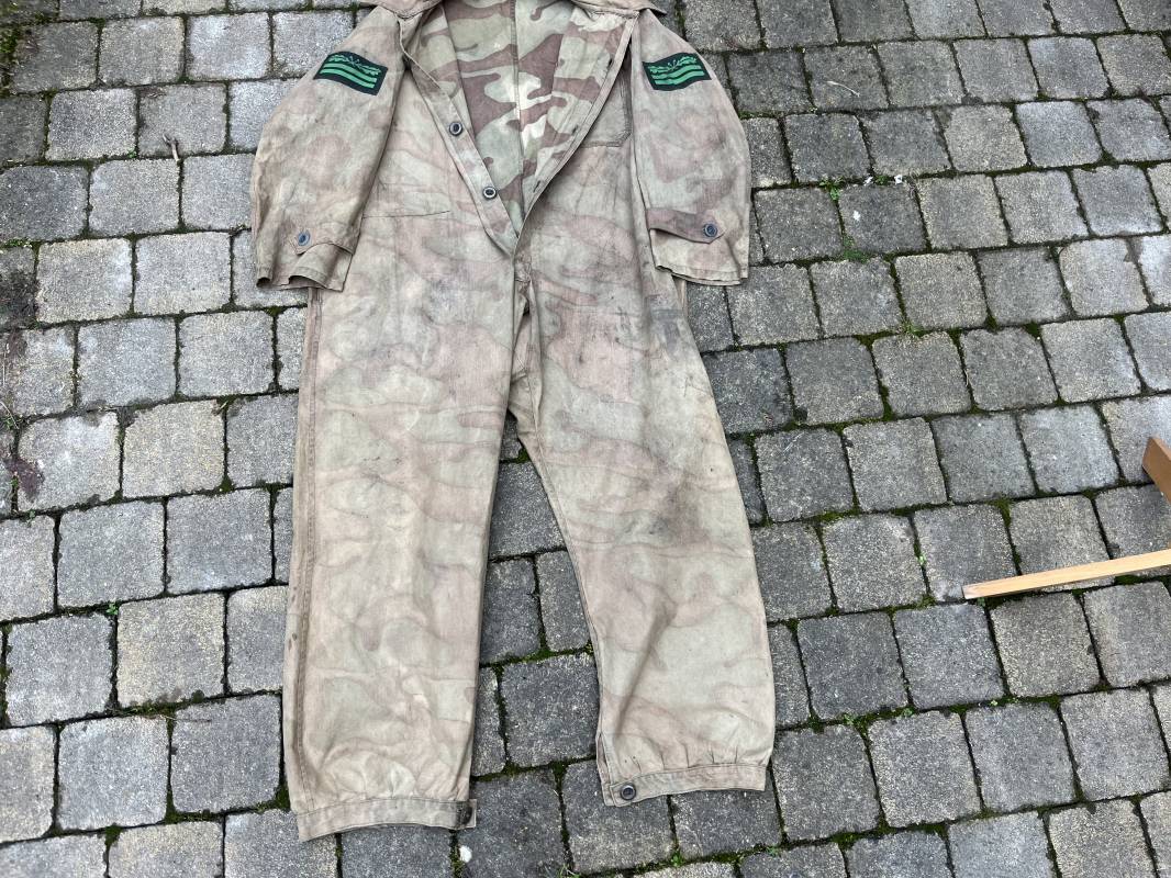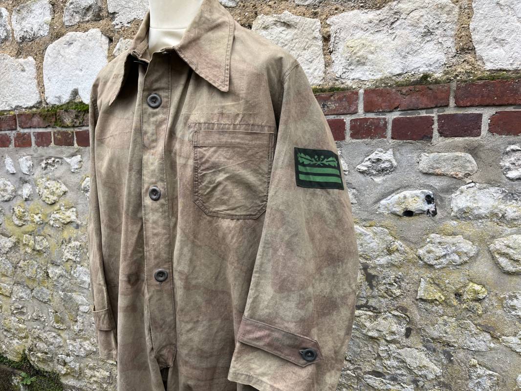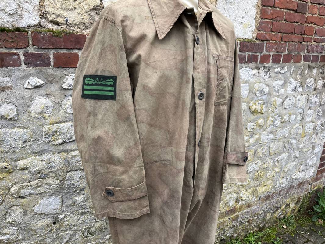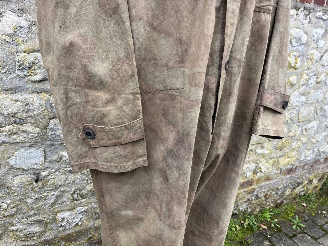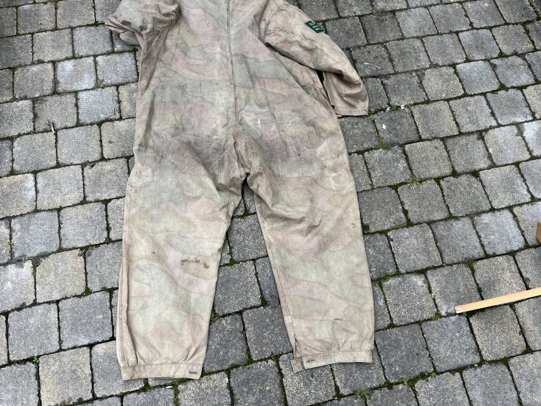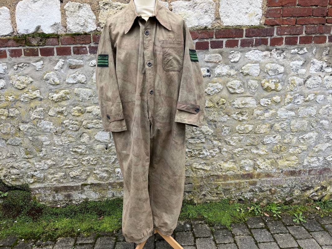 Rare combinaison pour troupe mécanisées de la Waffen SS en camouflage italien ( Telo mimetico mdle 1929 ) . Rare combinaison de confection locale en tissu coton imprimé camouflé . Ouverture frontale a quatre boutons métalliques . Une poche de poitrine , col en poite . Une fente laterale coté droit pour accés au pantalon . Deux pattes de serrages boutonnées aux enmanchures . Bas des jambes de forme bouffante avec boutons . Tous les boutons sont cousus d origine . Grades de manche du type imprimé en coton montés machine d origine au grade d officier ( SS Obersturmfuhrer ) Combinaison portée avec trace d usage . Petites taches d usage au cul et sur cuisse . Couleurs vives . Largeur épaules 47 cm , longueur totale 165 cm , manches 58 cm . Rare combinaison d un officier tankiste de la Waffen SS 1943/45 Ref 21538