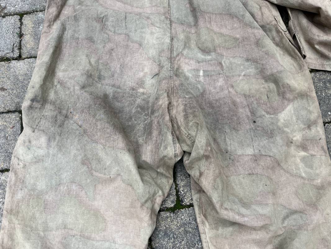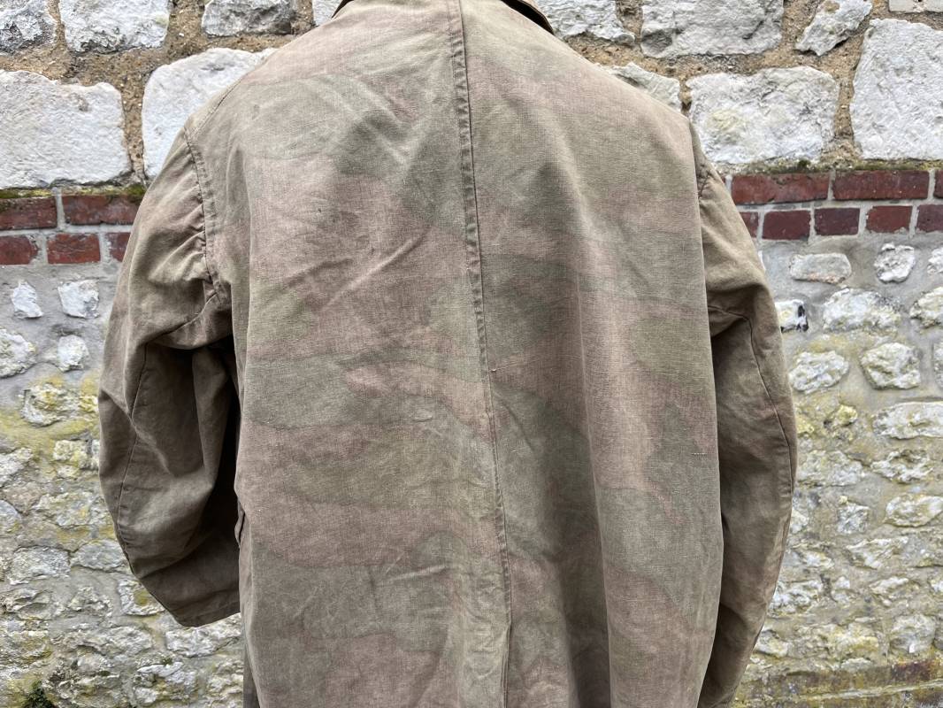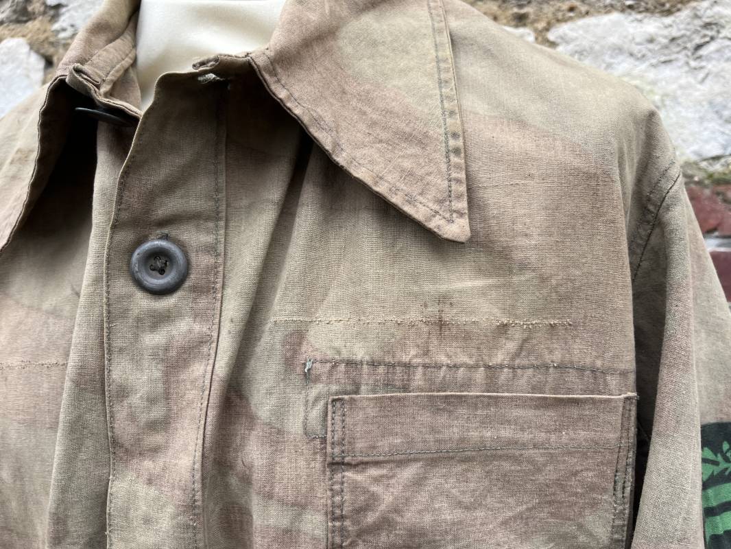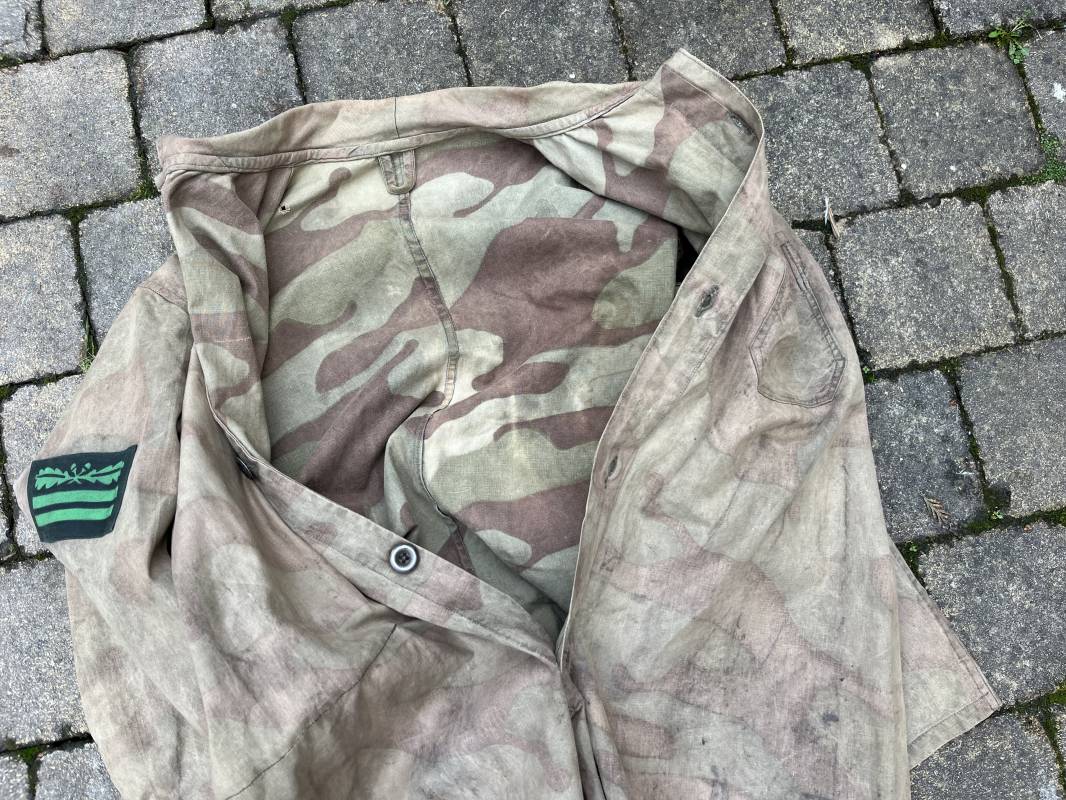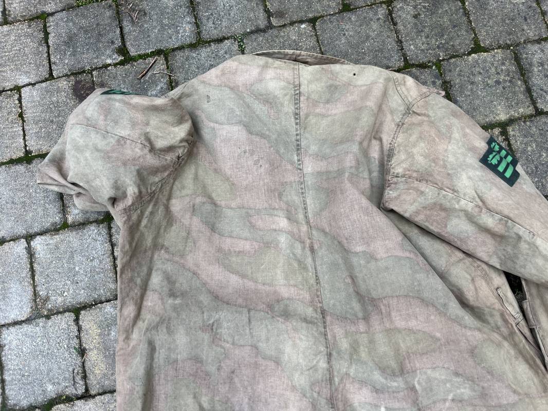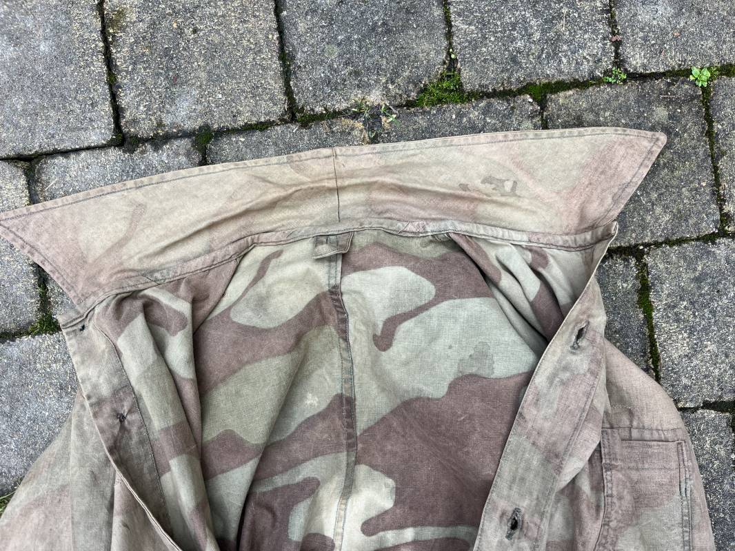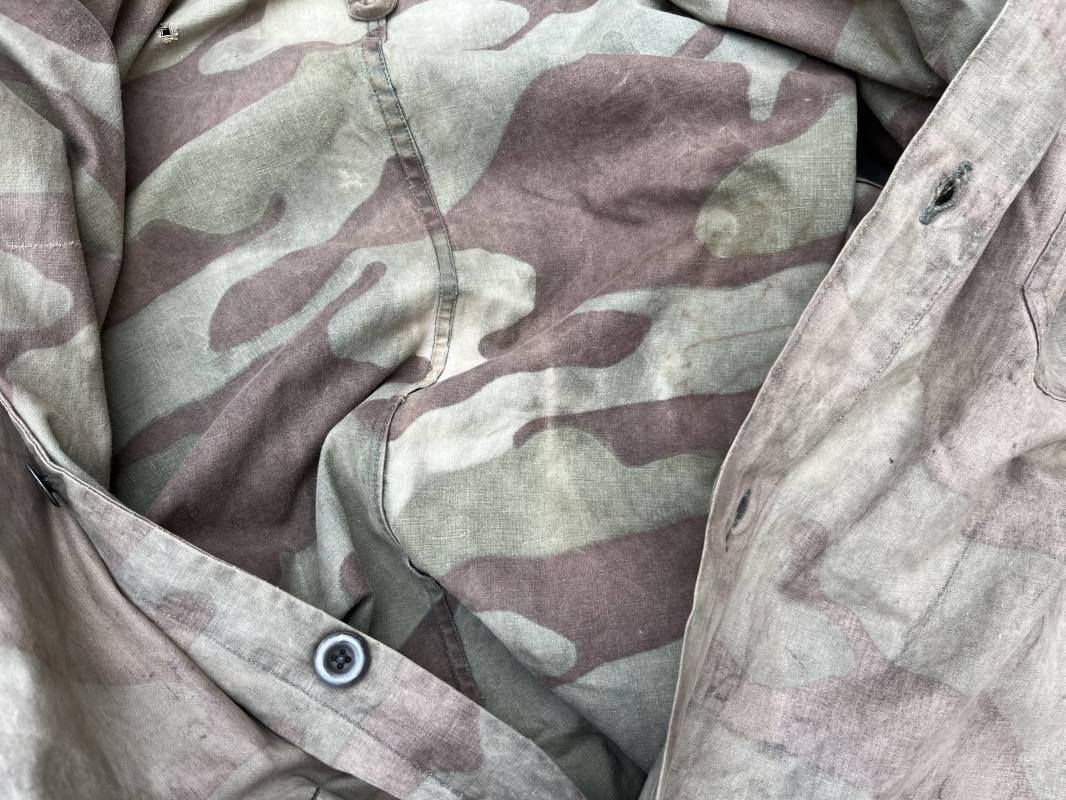 Rare combinaison pour troupe mécanisées de la Waffen SS en camouflage italien ( Telo mimetico mdle 1929 ) . Rare combinaison de confection locale en tissu coton imprimé camouflé . Ouverture frontale a quatre boutons métalliques . Une poche de poitrine , col en poite . Une fente laterale coté droit pour accés au pantalon . Deux pattes de serrages boutonnées aux enmanchures . Bas des jambes de forme bouffante avec boutons . Tous les boutons sont cousus d origine . Grades de manche du type imprimé en coton montés machine d origine au grade d officier ( SS Obersturmfuhrer ) Combinaison portée avec trace d usage . Petites taches d usage au cul et sur cuisse . Couleurs vives . Largeur épaules 47 cm , longueur totale 165 cm , manches 58 cm . Rare combinaison d un officier tankiste de la Waffen SS 1943/45 Ref 21538