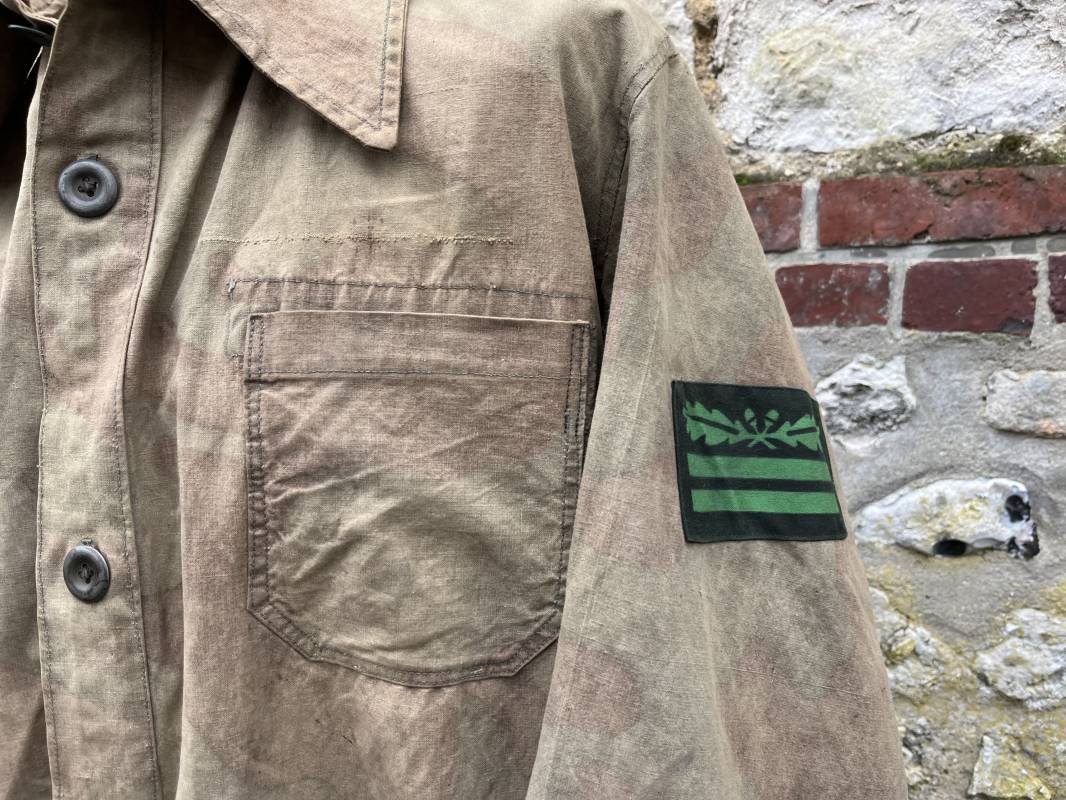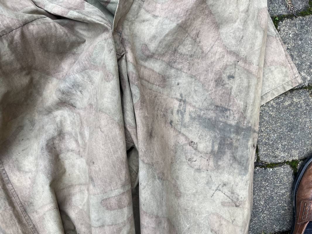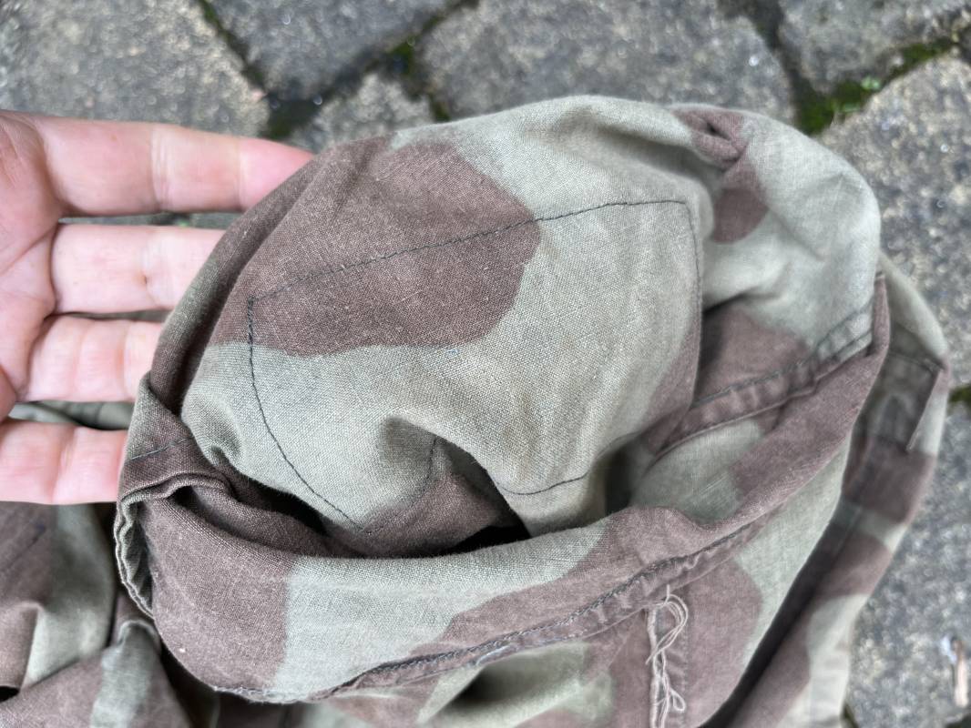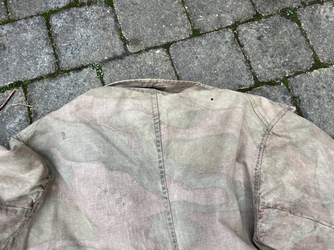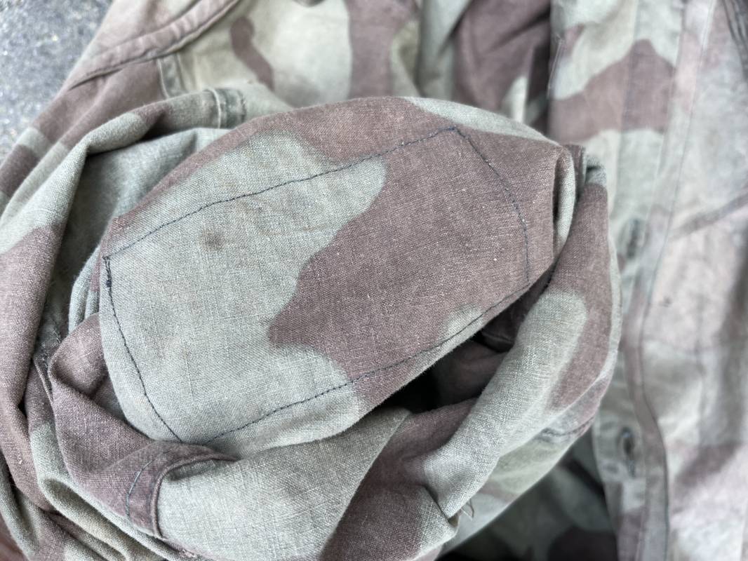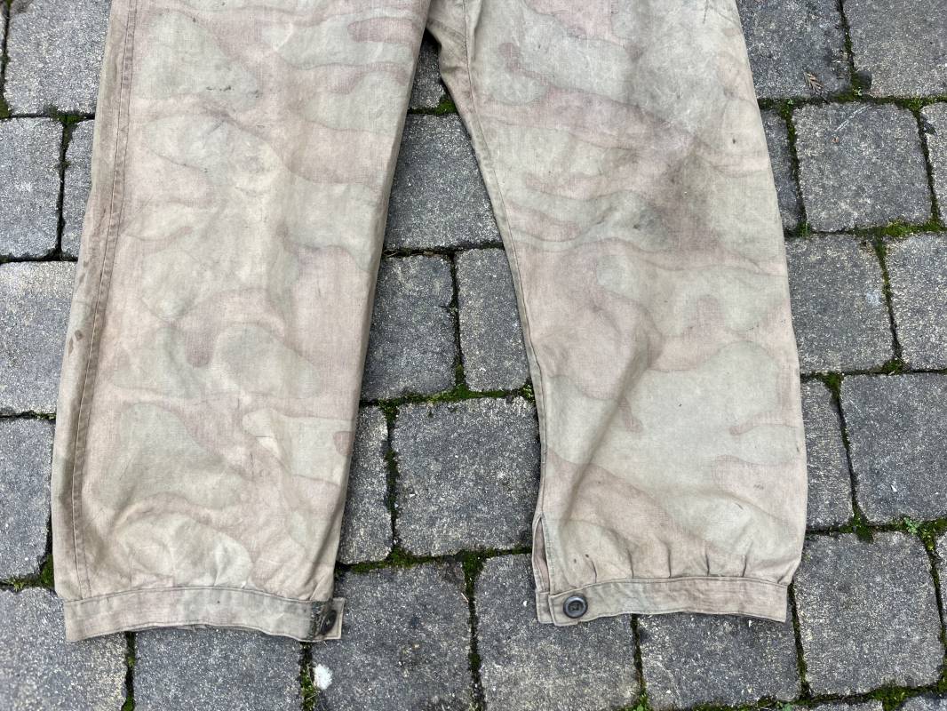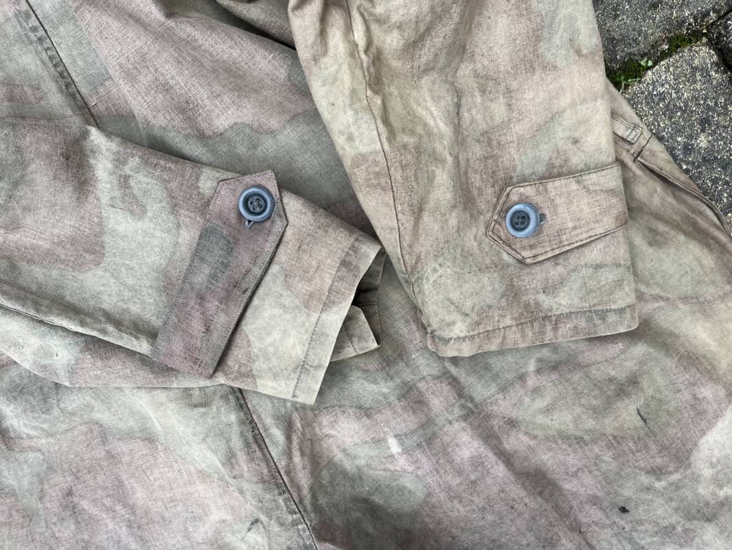 Rare combinaison pour troupe mécanisées de la Waffen SS en camouflage italien ( Telo mimetico mdle 1929 ) . Rare combinaison de confection locale en tissu coton imprimé camouflé . Ouverture frontale a quatre boutons métalliques . Une poche de poitrine , col en poite . Une fente laterale coté droit pour accés au pantalon . Deux pattes de serrages boutonnées aux enmanchures . Bas des jambes de forme bouffante avec boutons . Tous les boutons sont cousus d origine . Grades de manche du type imprimé en coton montés machine d origine au grade d officier ( SS Obersturmfuhrer ) Combinaison portée avec trace d usage . Petites taches d usage au cul et sur cuisse . Couleurs vives . Largeur épaules 47 cm , longueur totale 165 cm , manches 58 cm . Rare combinaison d un officier tankiste de la Waffen SS 1943/45 Ref 21538