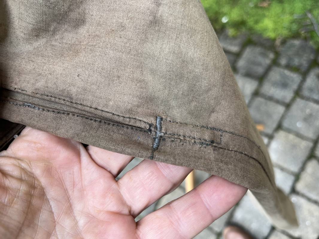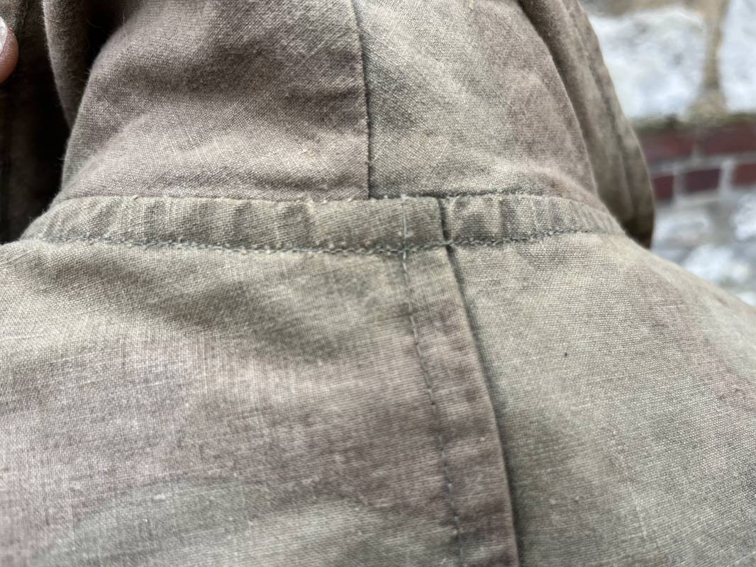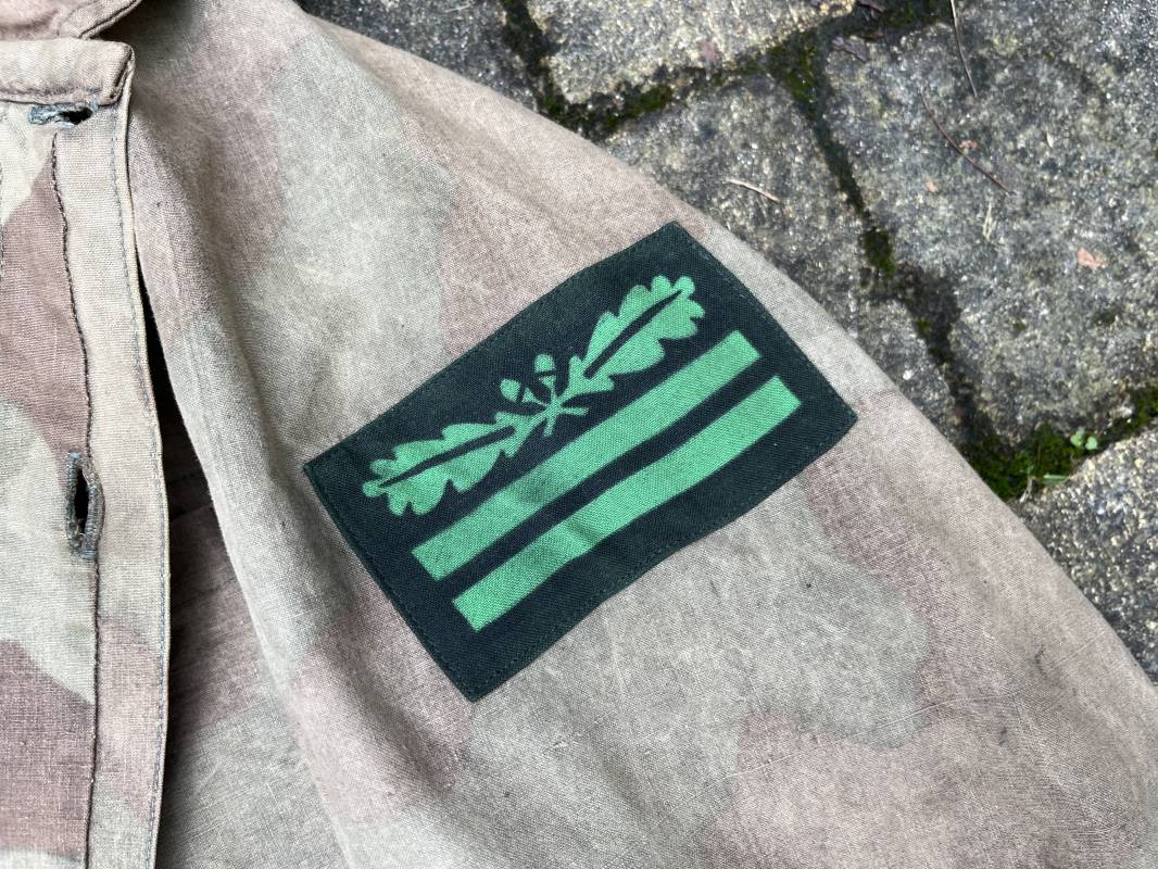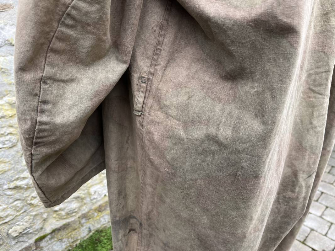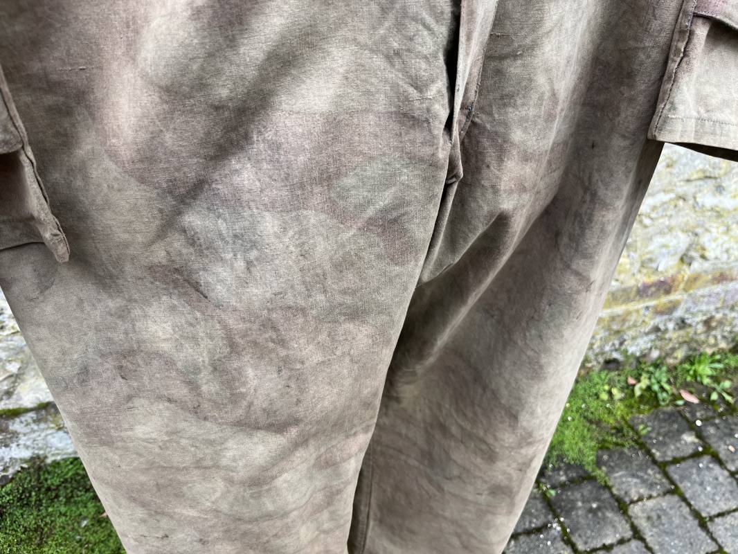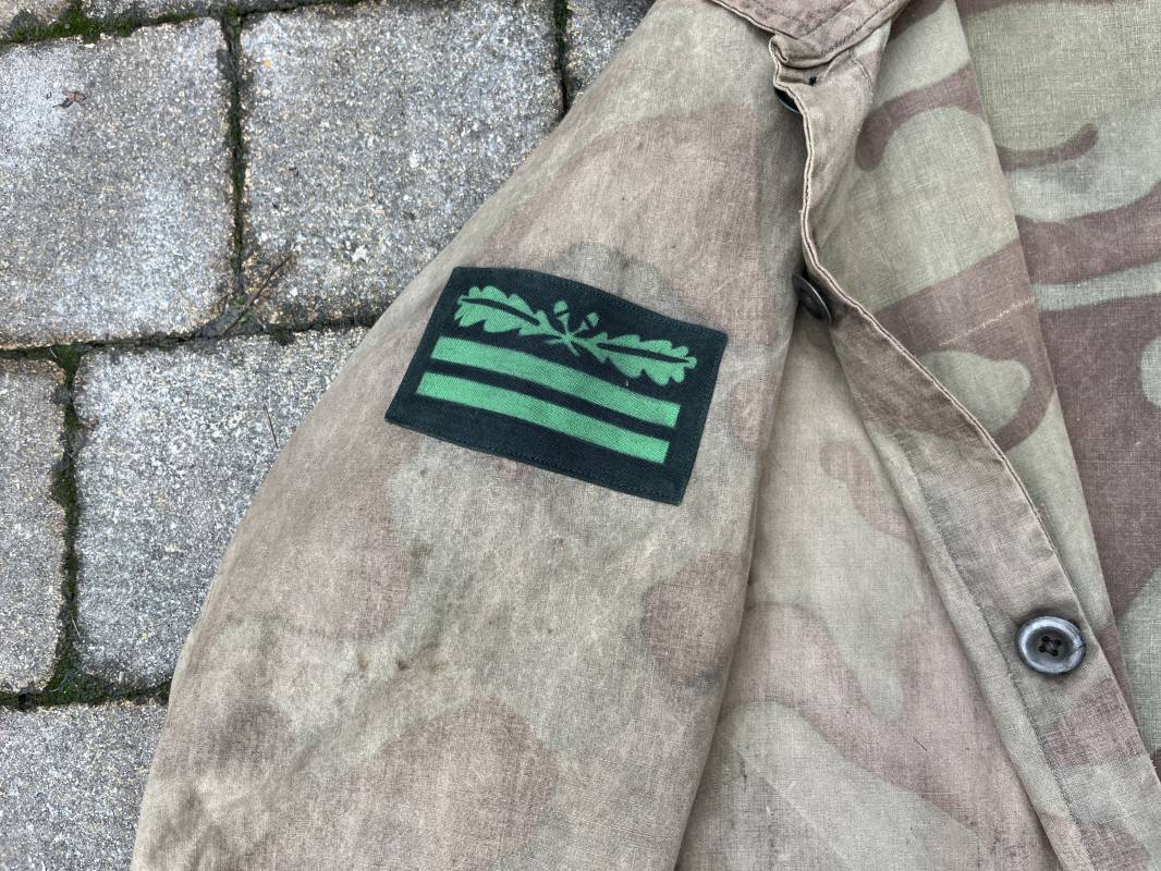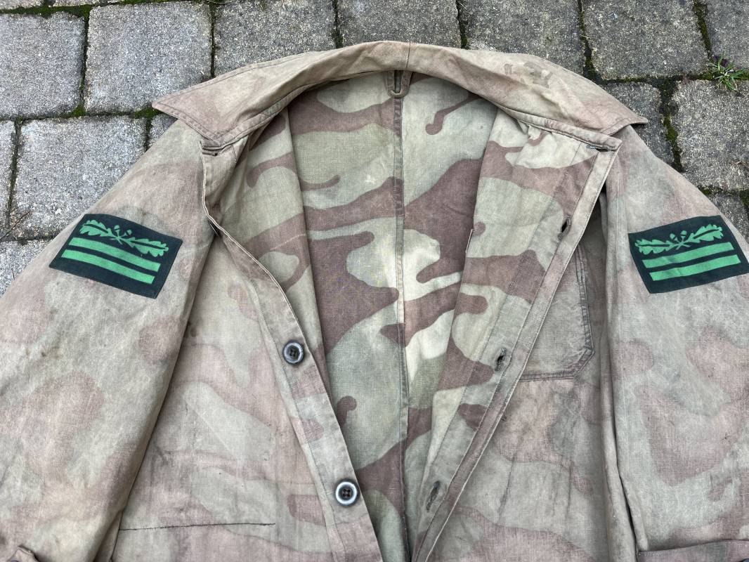 Rare combinaison pour troupe mécanisées de la Waffen SS en camouflage italien ( Telo mimetico mdle 1929 ) . Rare combinaison de confection locale en tissu coton imprimé camouflé . Ouverture frontale a quatre boutons métalliques . Une poche de poitrine , col en poite . Une fente laterale coté droit pour accés au pantalon . Deux pattes de serrages boutonnées aux enmanchures . Bas des jambes de forme bouffante avec boutons . Tous les boutons sont cousus d origine . Grades de manche du type imprimé en coton montés machine d origine au grade d officier ( SS Obersturmfuhrer ) Combinaison portée avec trace d usage . Petites taches d usage au cul et sur cuisse . Couleurs vives . Largeur épaules 47 cm , longueur totale 165 cm , manches 58 cm . Rare combinaison d un officier tankiste de la Waffen SS 1943/45 Ref 21538