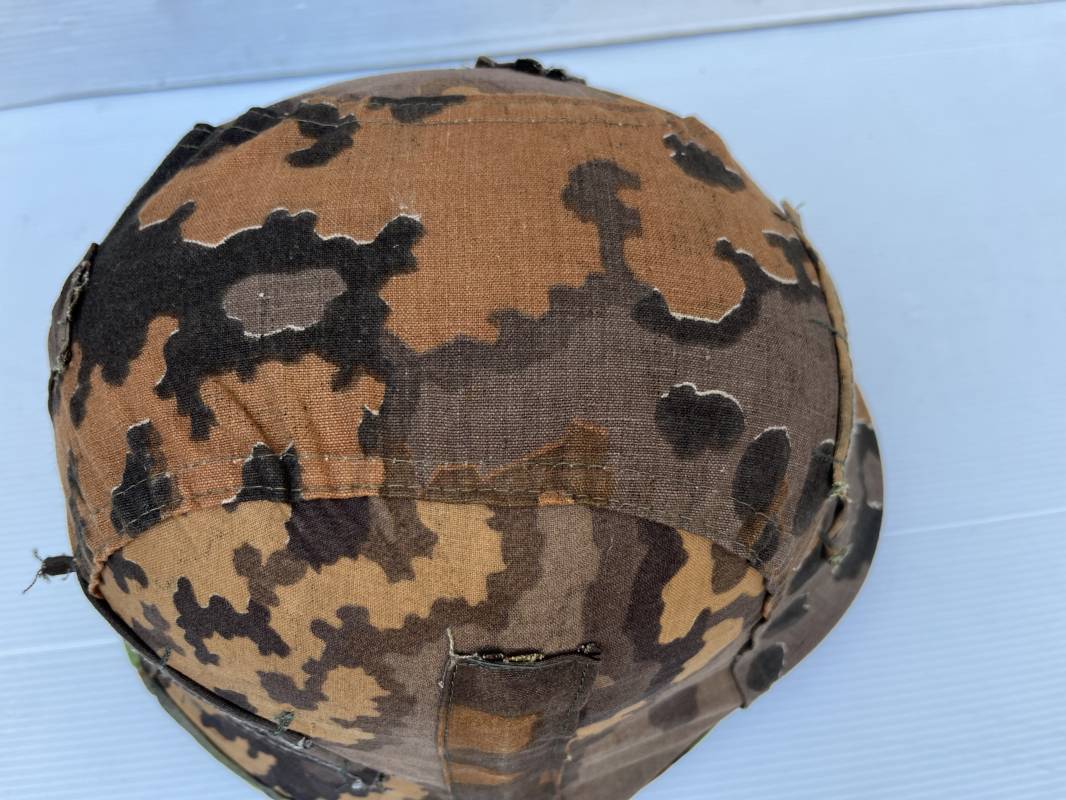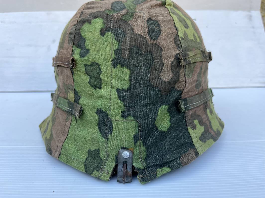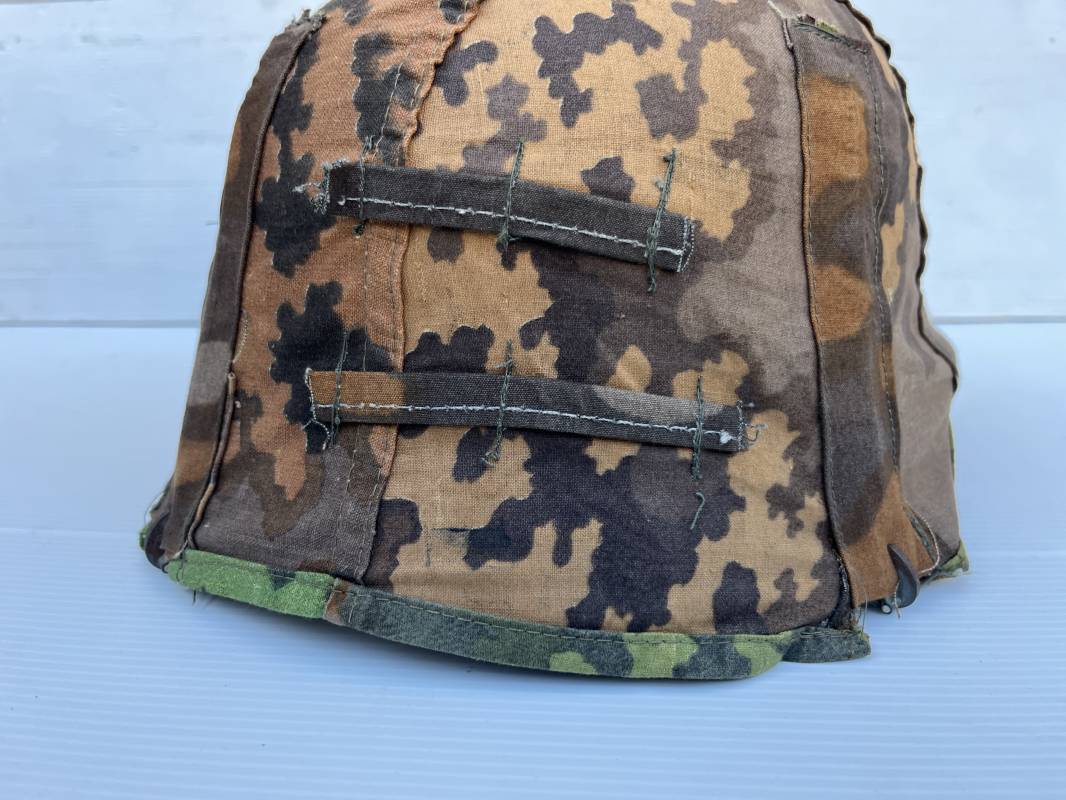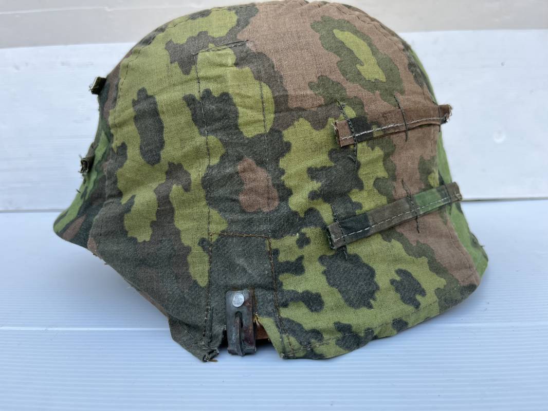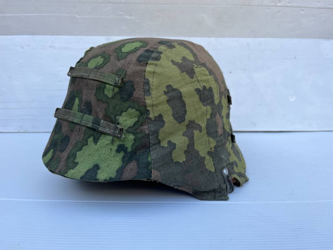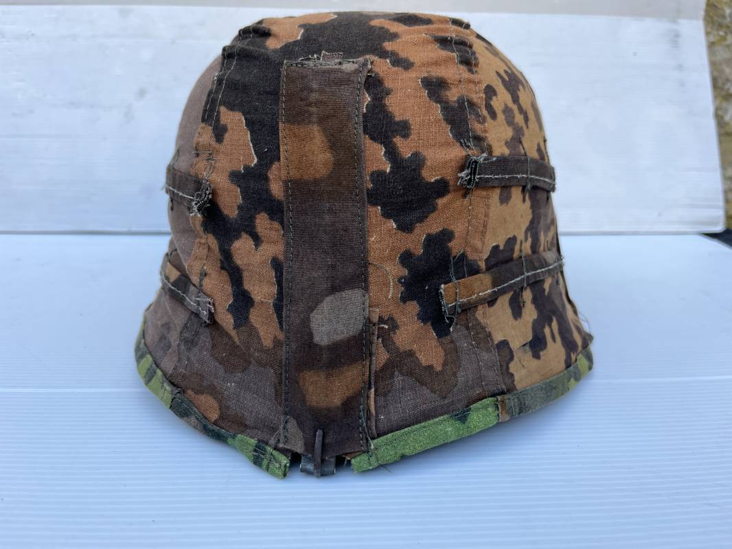 Trés rare couvre casque de la waffen SS du 3éme type avec brides de camouflage , confection Fin 1943/45 ; Camouflage réversible Printemps /automne type A et B modele 'feuilles de chéne' . Modele a trois crochets de fixation . Crochets en métal brut , rivets metalliques , ressorts métalliques d origines et fonctionnels .Taille de couvre casque' I' marquage encre sur l arriere du casque ( pour coque de casque 60/62 ) . Dans l annonce le couvre casque est presenté sur un casque coque 62 lequel casque ne fait pas partie de la vente . Le couvre casque est vendu SEUL sans le casque . Brides de camouflage Couvre casque trés légérement porté en superbe état . Trés bellees couleurs . Couvre casque sans aucun défaut . Une rarissime pièce définitive en collection . Authenticité garantie .Vendu avec certificat d authenticité . Ref 16807