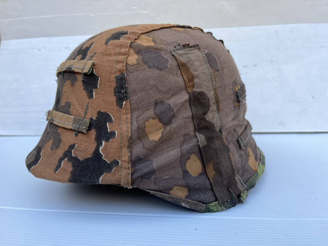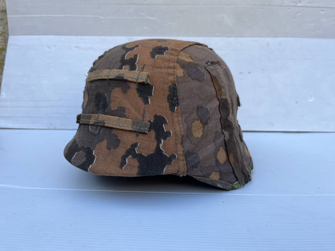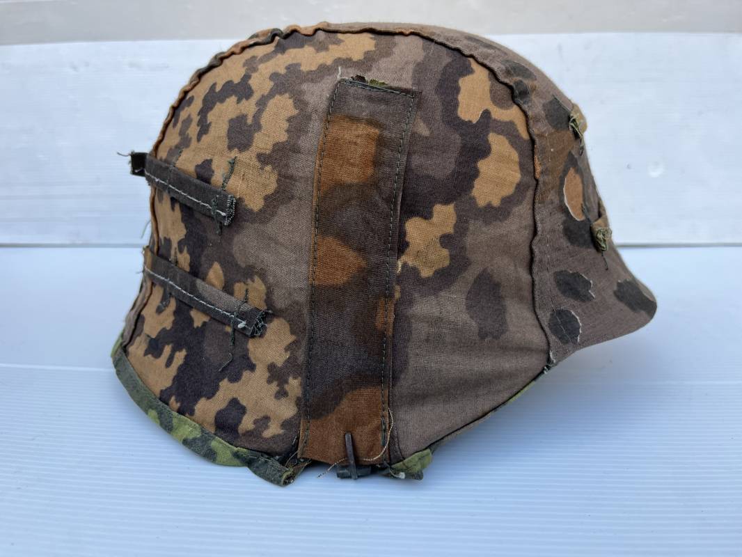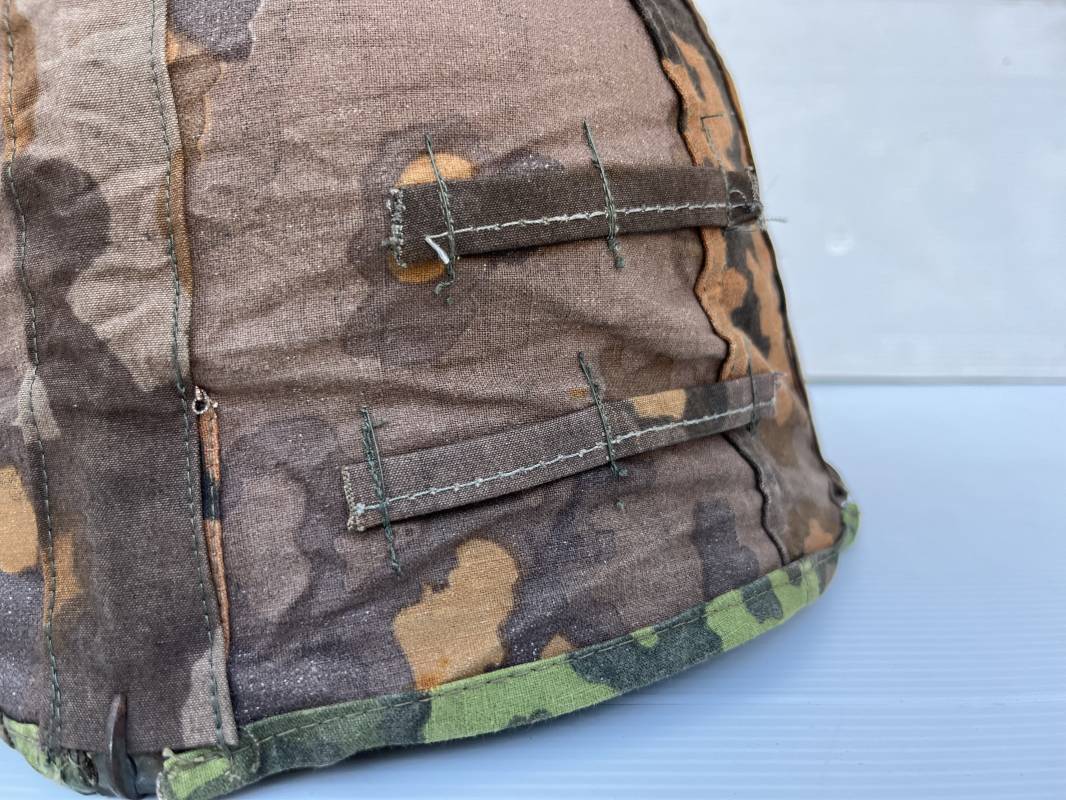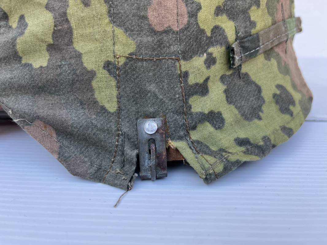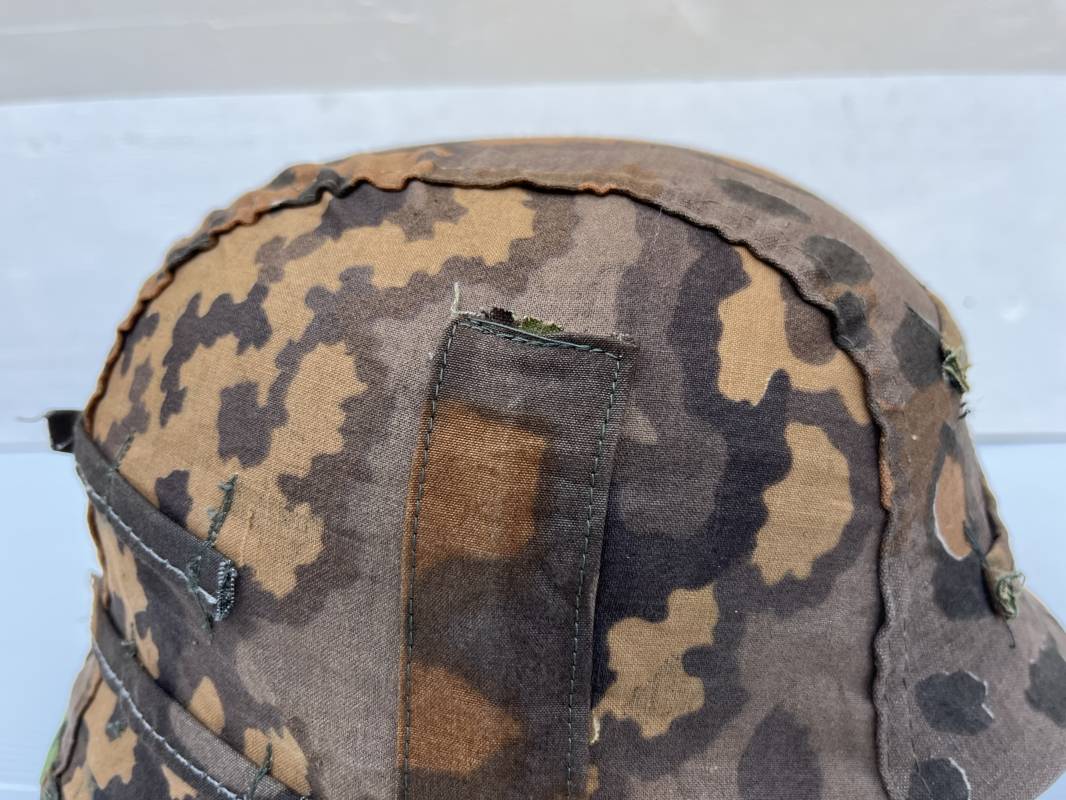 Trés rare couvre casque de la waffen SS du 3éme type avec brides de camouflage , confection Fin 1943/45 ; Camouflage réversible Printemps /automne type A et B modele 'feuilles de chéne' . Modele a trois crochets de fixation . Crochets en métal brut , rivets metalliques , ressorts métalliques d origines et fonctionnels .Taille de couvre casque' I' marquage encre sur l arriere du casque ( pour coque de casque 60/62 ) . Dans l annonce le couvre casque est presenté sur un casque coque 62 lequel casque ne fait pas partie de la vente . Le couvre casque est vendu SEUL sans le casque . Brides de camouflage Couvre casque trés légérement porté en superbe état . Trés bellees couleurs . Couvre casque sans aucun défaut . Une rarissime pièce définitive en collection . Authenticité garantie .Vendu avec certificat d authenticité . Ref 16807
