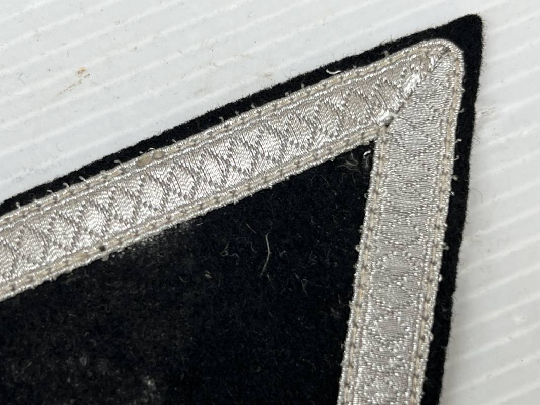 Chevron de bras en dras noir d un caporal de la Waffen SS ou tankiste ( tenue drap noir de la Heer ) Drap de fond noir . Chevron en fil d aluminium argent Legerement porté e,n parfait état Ref 21833