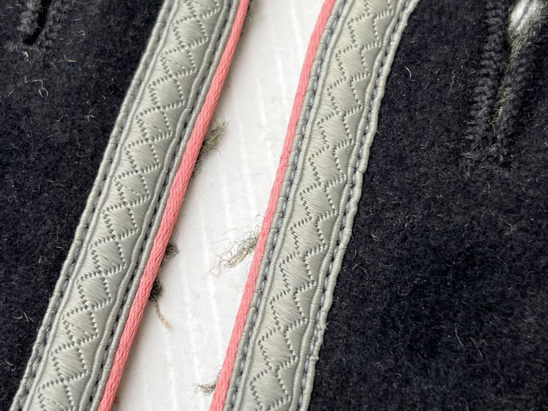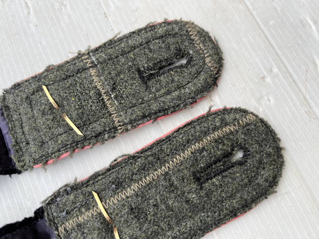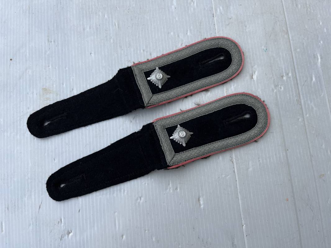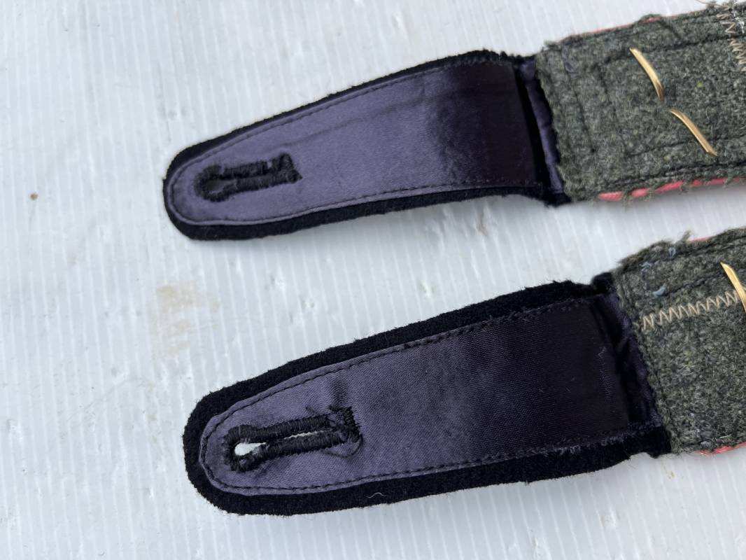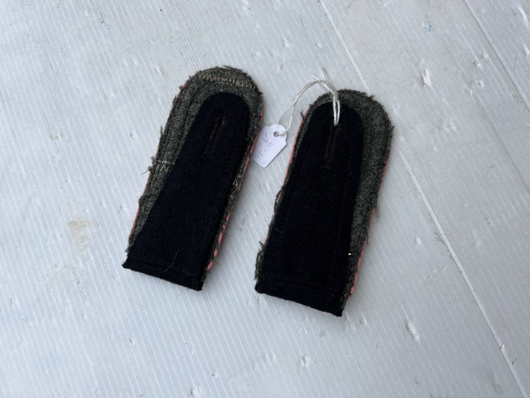 Rare paire de pattes d'épaules d'un sous officier panzer de la Waffen SS. Pattes d'épaules à rabat pour veste ou capote. Drap noir doublé en drap feldgrau. Liseré rayonne rose des panzer truppen , galons de sous officier en coton gris clair . Longueur 112 mm. Rabats doublés en satinnette noire violacée . Très légèrement porté en superbe état 1942/45. Ref 21638