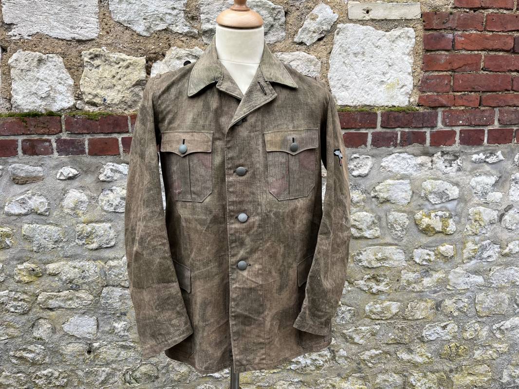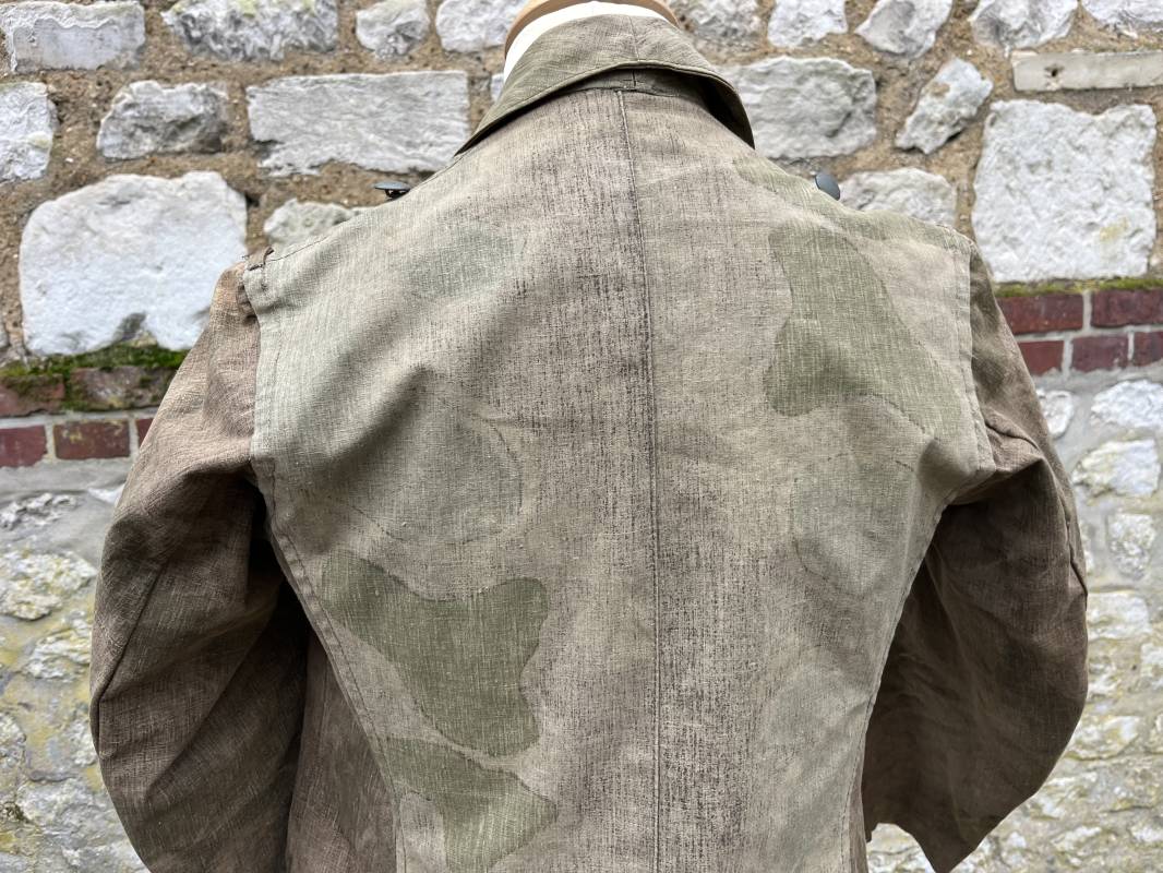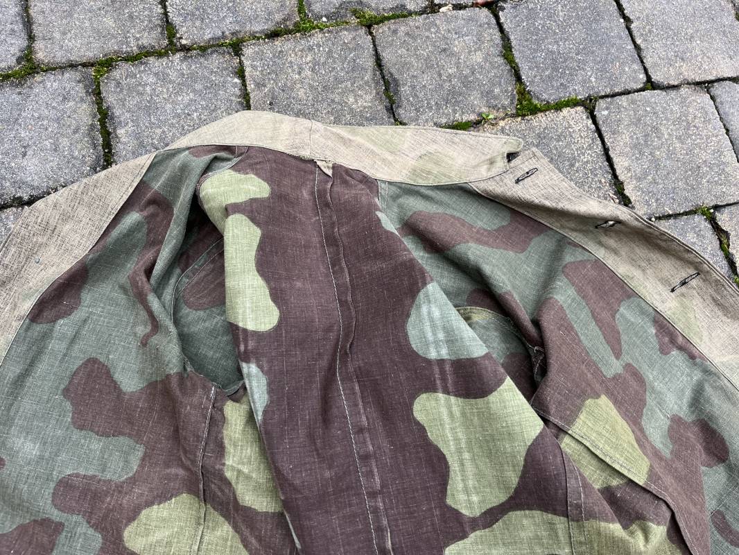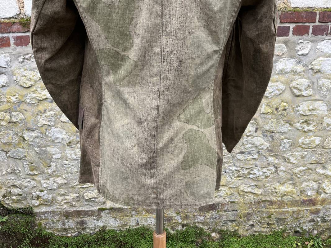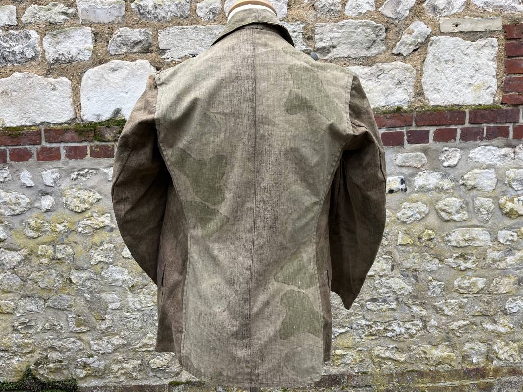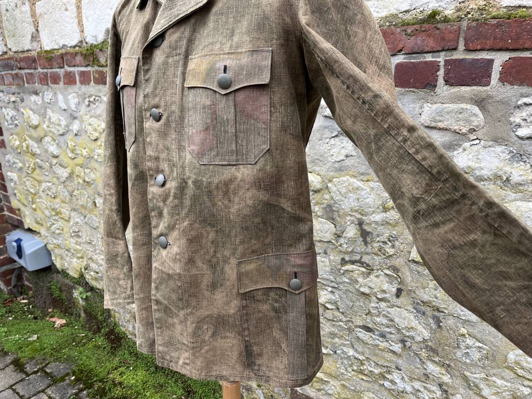 Rare Veste en toile de camouflage italien ( telo mimetico M1929) . Trés belle confection locale en toile camouflée . Montage avec fil vert . Veste Quatre poches a plis wateau , fermeture frontale à 6 boutons . Boutons métalliques grenelés peints en vert et cousus d origine . Col avec crochet metallique . Passants pour le port des epaulettes et boutons . Aigle de bras de modéle brodé coton gris , drap de fond noir , montage mains . Veste en parfait état . Légérement portée Largeur épaules 41 cm , longueur 76 cm , manches 61 cm . Veste typiques de unités de premières lignes de la W SS . Trés belle fabrication locale 1943/45 Ref 21550