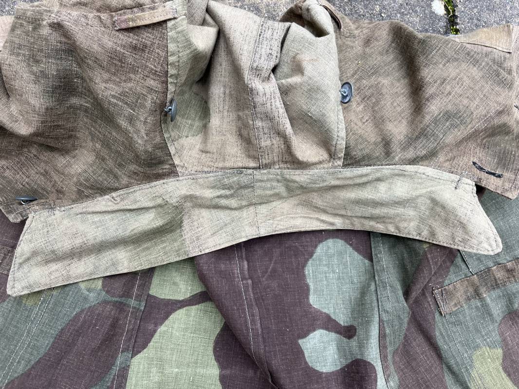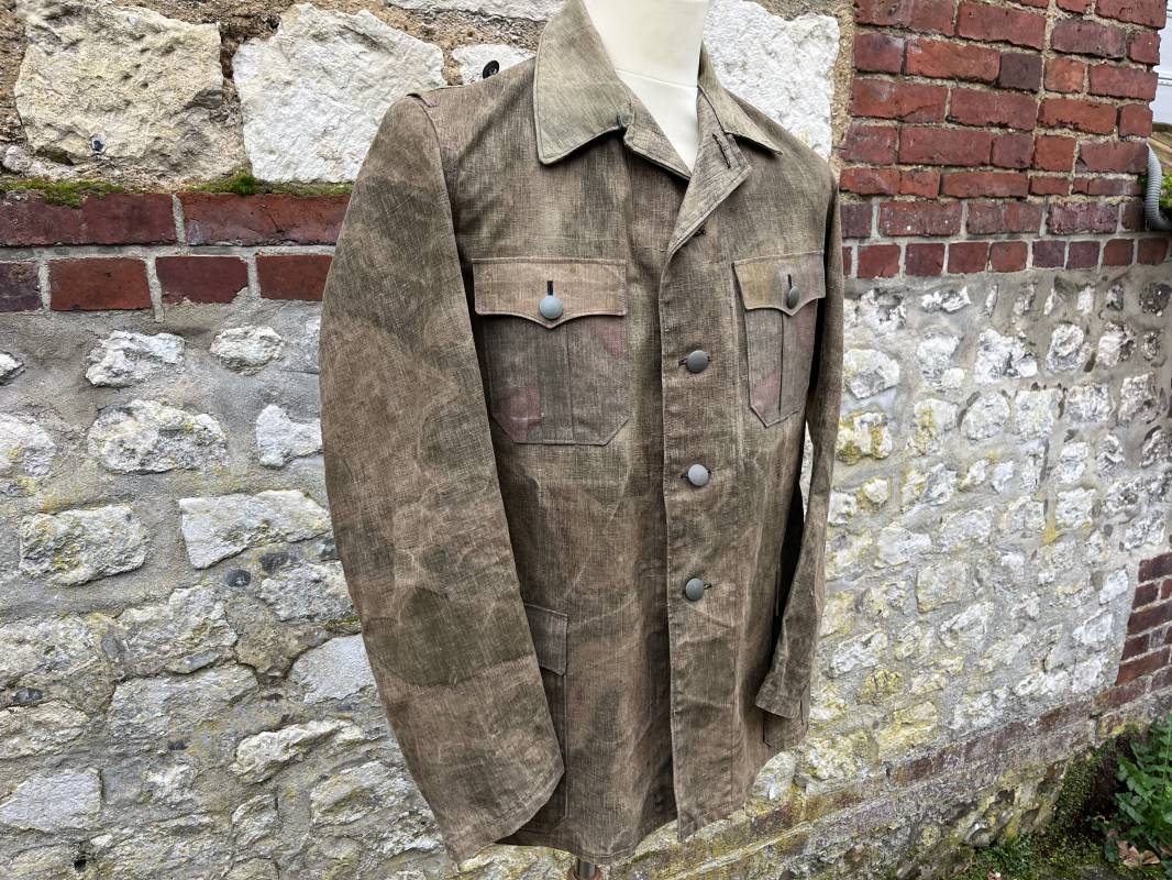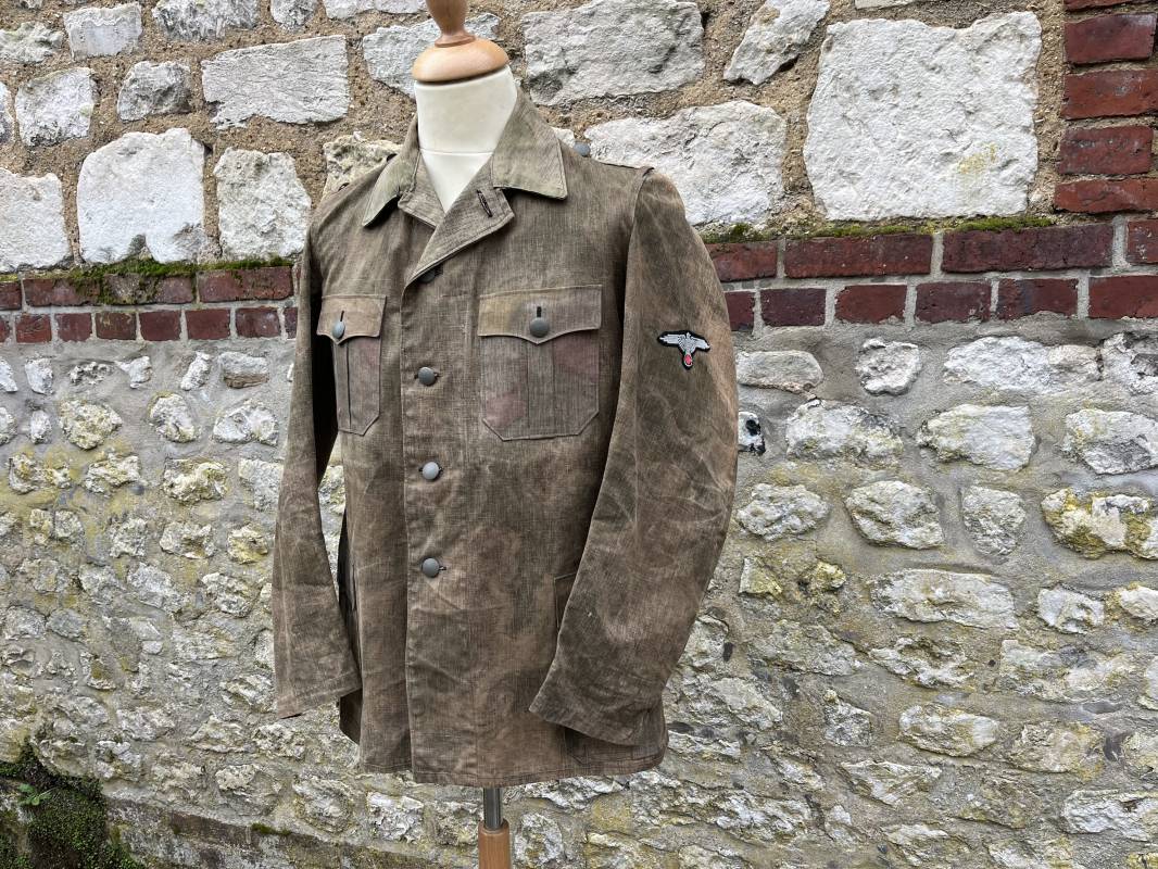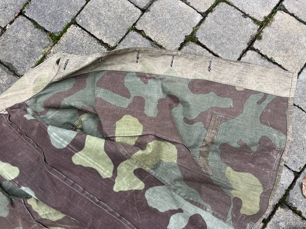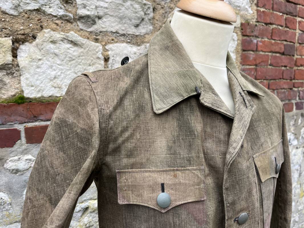 Rare Veste en toile de camouflage italien ( telo mimetico M1929) . Trés belle confection locale en toile camouflée . Montage avec fil vert . Veste Quatre poches a plis wateau , fermeture frontale à 6 boutons . Boutons métalliques grenelés peints en vert et cousus d origine . Col avec crochet metallique . Passants pour le port des epaulettes et boutons . Aigle de bras de modéle brodé coton gris , drap de fond noir , montage mains . Veste en parfait état . Légérement portée Largeur épaules 41 cm , longueur 76 cm , manches 61 cm . Veste typiques de unités de premières lignes de la W SS . Trés belle fabrication locale 1943/45 Ref 21550
