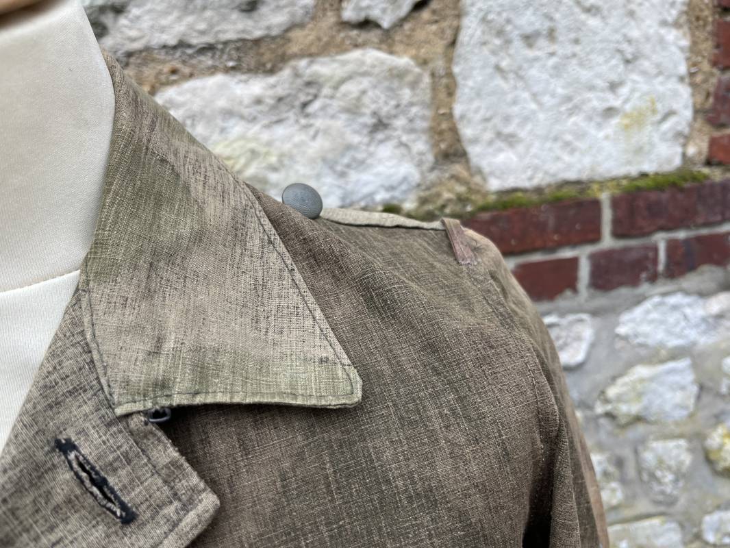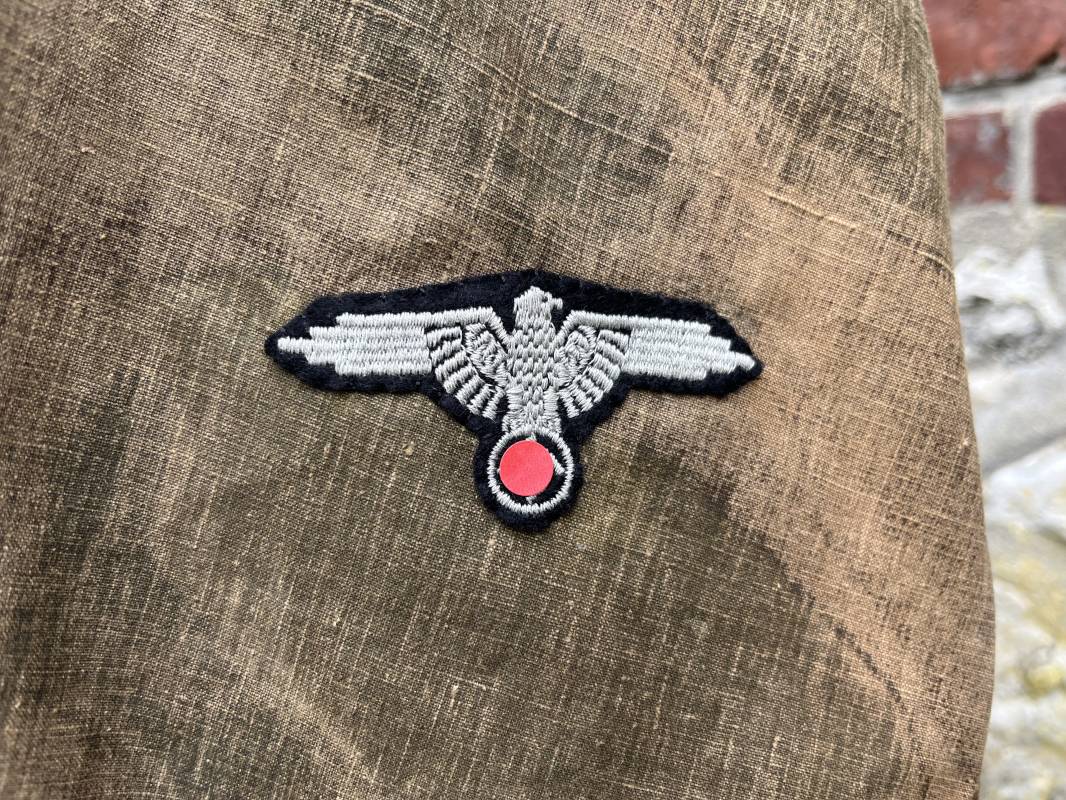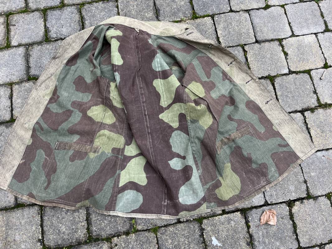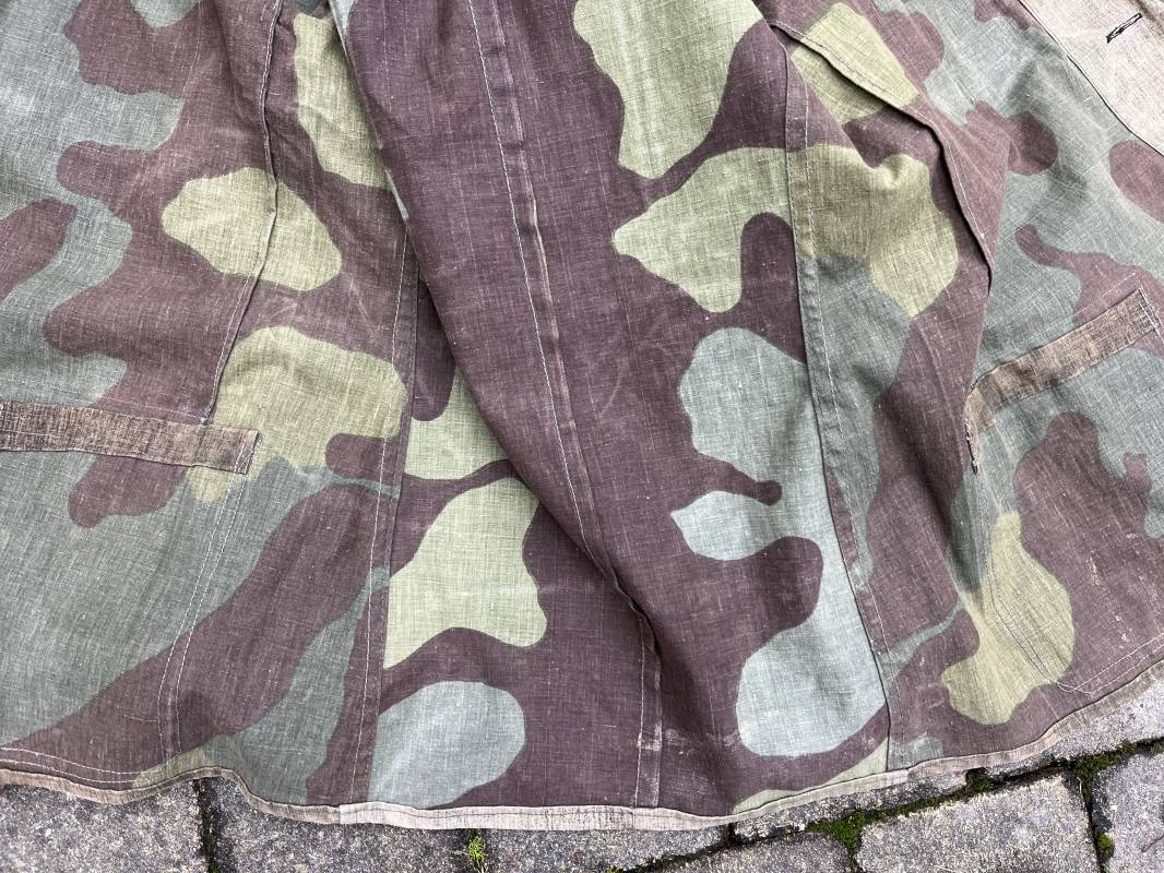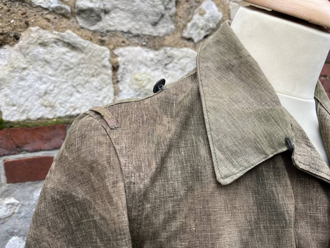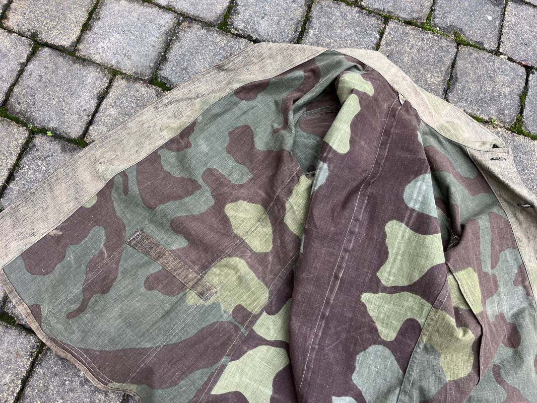 Rare Veste en toile de camouflage italien ( telo mimetico M1929) . Trés belle confection locale en toile camouflée . Montage avec fil vert . Veste Quatre poches a plis wateau , fermeture frontale à 6 boutons . Boutons métalliques grenelés peints en vert et cousus d origine . Col avec crochet metallique . Passants pour le port des epaulettes et boutons . Aigle de bras de modéle brodé coton gris , drap de fond noir , montage mains . Veste en parfait état . Légérement portée Largeur épaules 41 cm , longueur 76 cm , manches 61 cm . Veste typiques de unités de premières lignes de la W SS . Trés belle fabrication locale 1943/45 Ref 21550