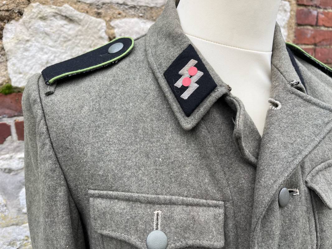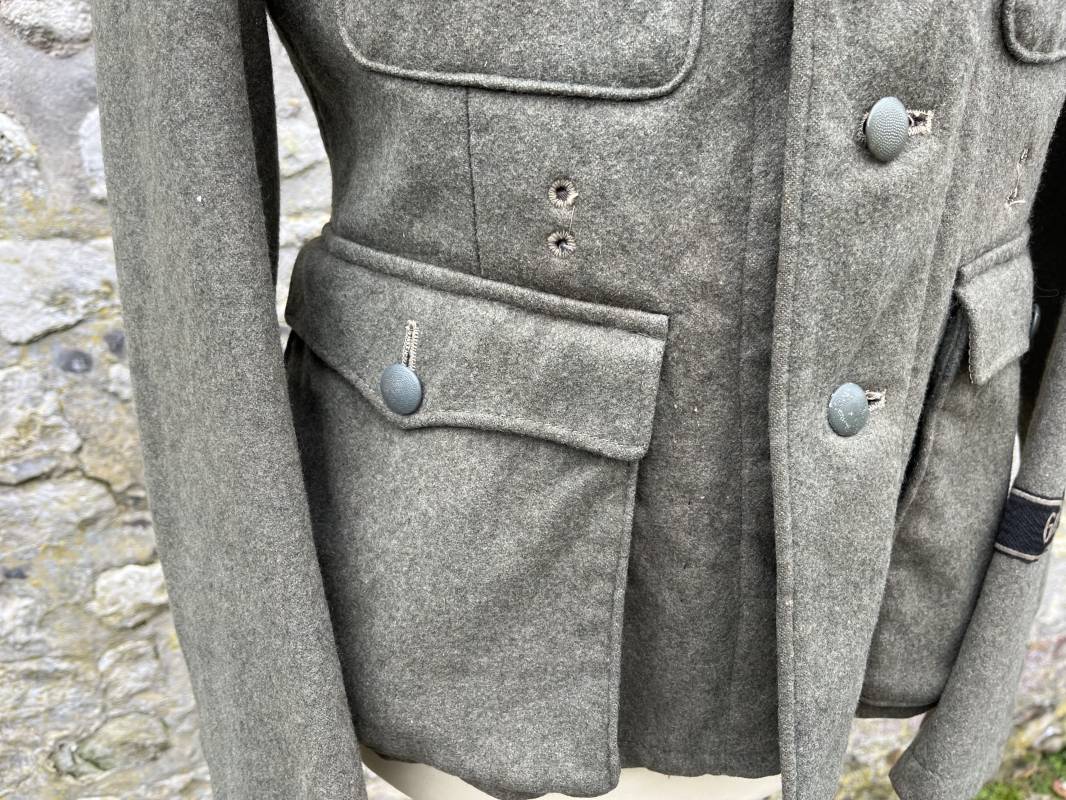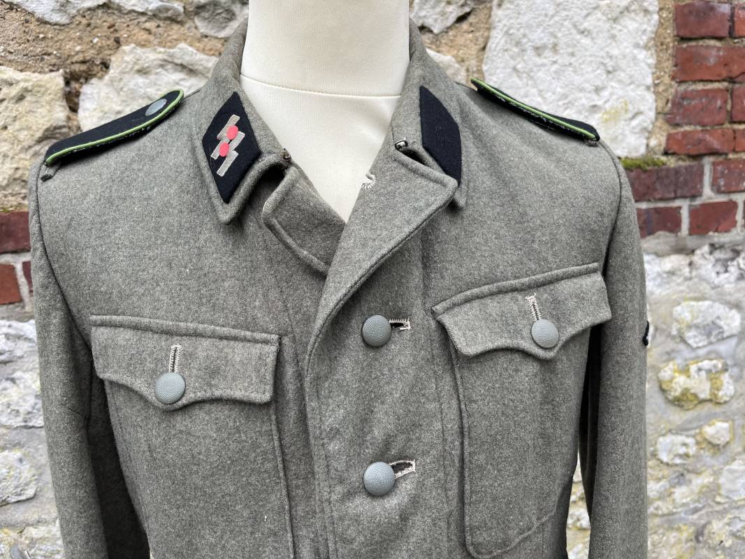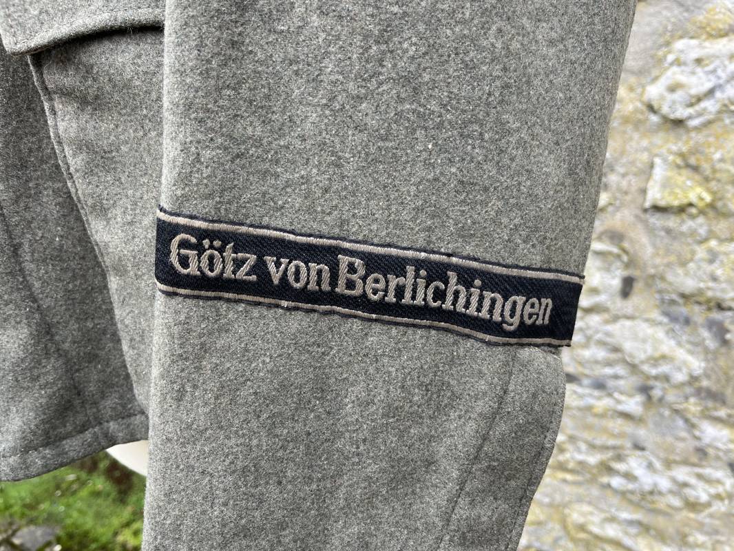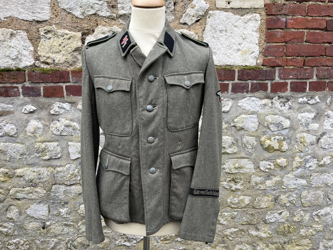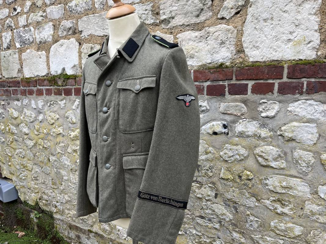 Rare veste troupe modéle 1942 en drap feldgrau d'un soldat panzer grenadier de la 17éme Division blindée 'Gotz Von Berlichingen' de la Waffen SS . Cette trés rare veste a été trouvée dans le secteur de Vernon ( 27 ) il y a 40 ans . Veste modéle 1942 de dotation de la Waffen SS : Fermeture frontale à cinq boutons métalliques et deux oeillets de fixation des crochets de ceinturon , Quatre poche à rabats en pointes boutonnés . Col avec coins de col troupe ( litzen) modéle brodé en fil de coton gris , montées mains . Revers de col en chevrons treillis vert . Aigle de bras troupe du modéle brodé coton gris , monté mains . Pattes d 'épaules à rabats modéle 1943 , liseré en rayonne 'vert pré' de panzer grenadier , intérieur doublé et renforcé en coton noir . Bande de bras de la 17 Panzer Division Gotz Von Berlichingen cousue sur la manche gauche , montage mains . Bande de bras du modéle de dotation tissée BEVO . Tous les boutons sont montés d 'origine . Intérieur doublé satinette grise . Poche a pansement et bouton . Marquage encre des taille Marquage code fabricant ' 525 ' Largeur épaules 43 cm , longueur 68 cm , manche 65 cm . Trés belle veste légérement portée en trés bel état .Drap trés frais . Veste non raccourcie , non modifiée . Uniforme définitif en collection . Rare uniforme des troupes combattantes de la Waffen SS durant la bataille de Normandie en été 1944 Ref 2510