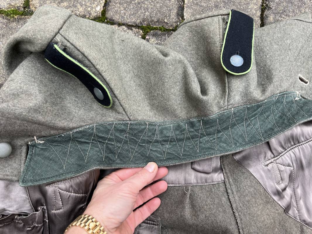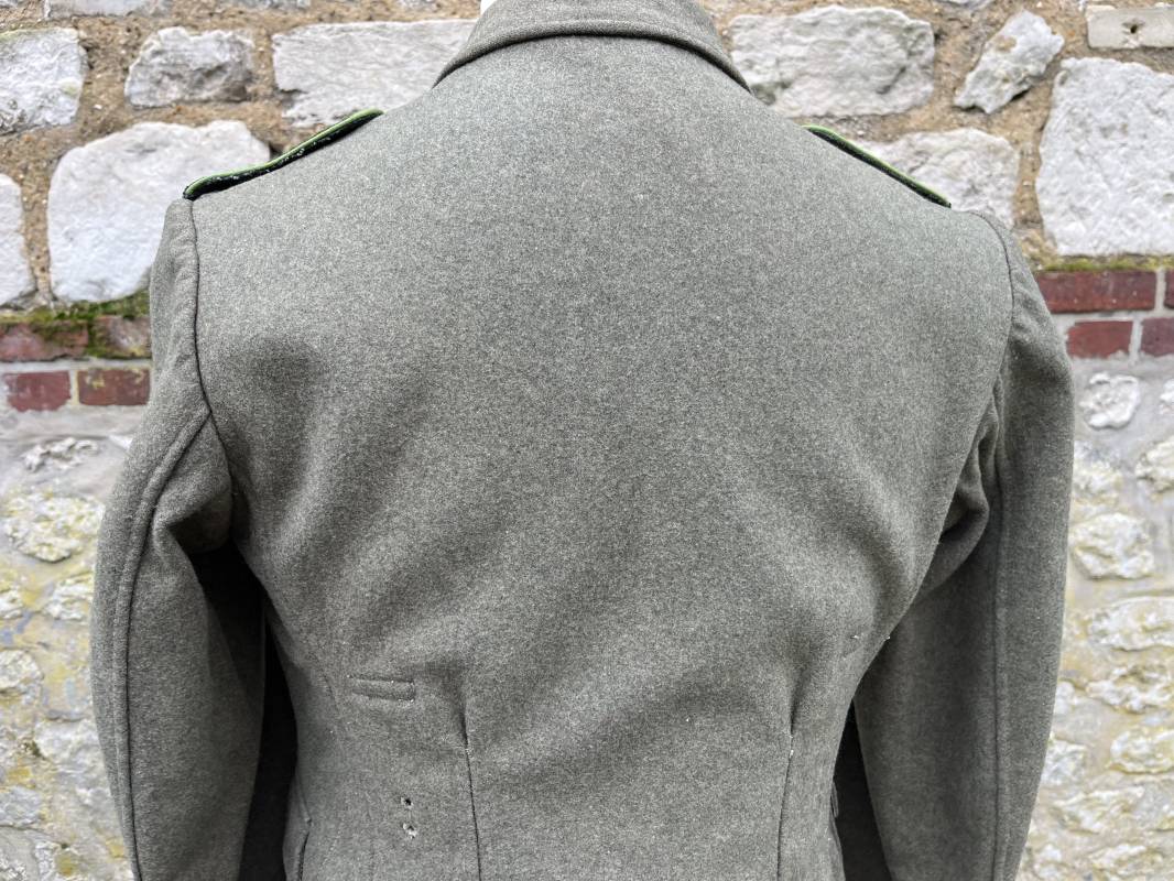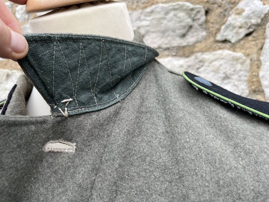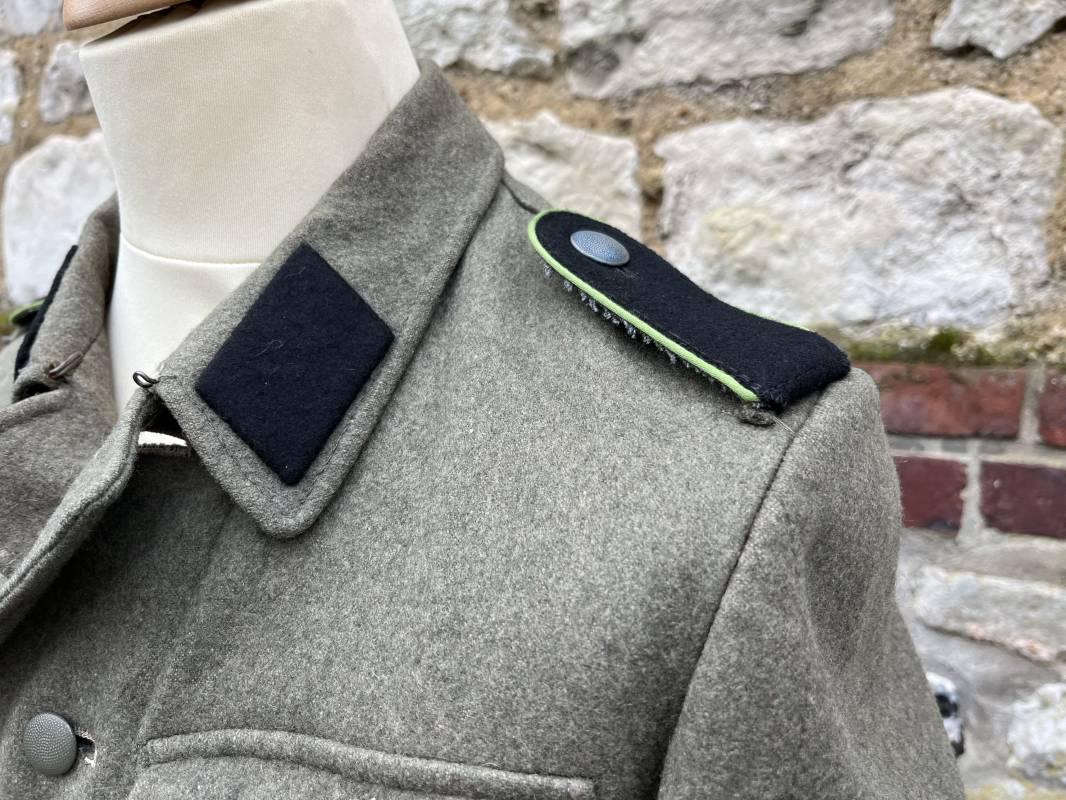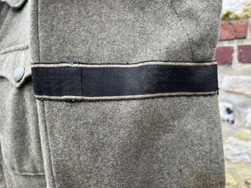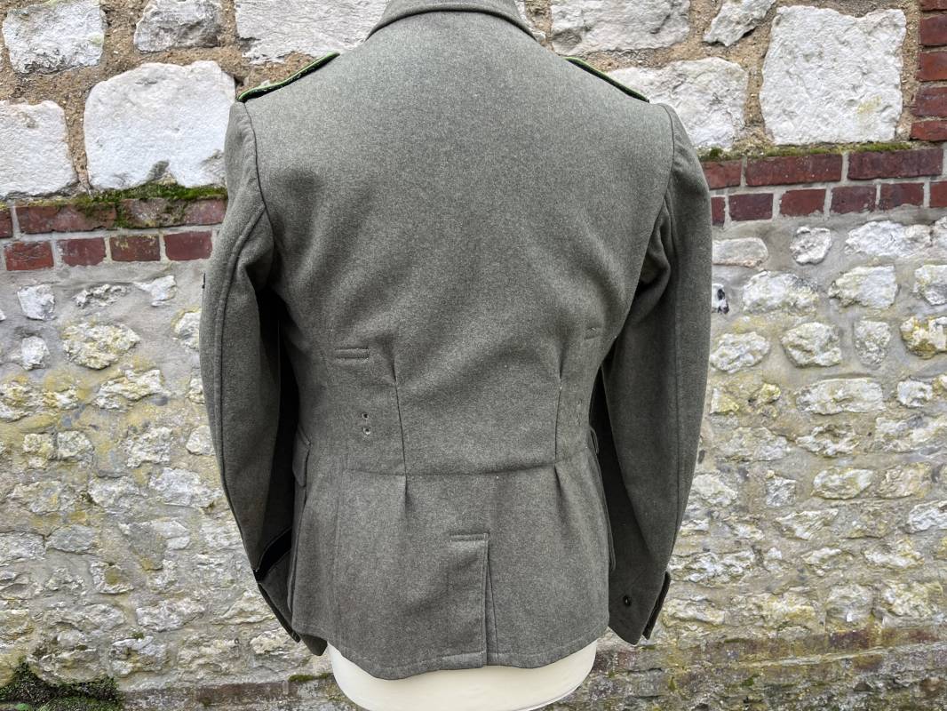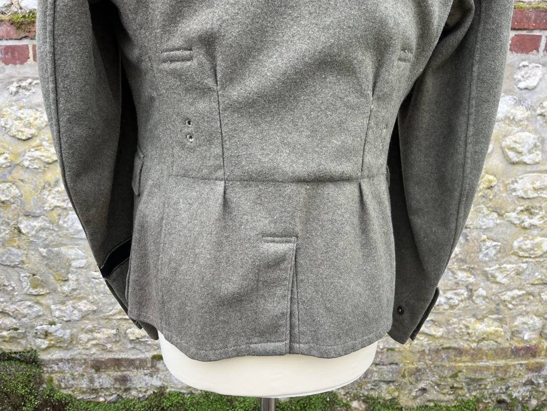 Rare veste troupe modéle 1942 en drap feldgrau d'un soldat panzer grenadier de la 17éme Division blindée 'Gotz Von Berlichingen' de la Waffen SS . Cette trés rare veste a été trouvée dans le secteur de Vernon ( 27 ) il y a 40 ans . Veste modéle 1942 de dotation de la Waffen SS : Fermeture frontale à cinq boutons métalliques et deux oeillets de fixation des crochets de ceinturon , Quatre poche à rabats en pointes boutonnés . Col avec coins de col troupe ( litzen) modéle brodé en fil de coton gris , montées mains . Revers de col en chevrons treillis vert . Aigle de bras troupe du modéle brodé coton gris , monté mains . Pattes d 'épaules à rabats modéle 1943 , liseré en rayonne 'vert pré' de panzer grenadier , intérieur doublé et renforcé en coton noir . Bande de bras de la 17 Panzer Division Gotz Von Berlichingen cousue sur la manche gauche , montage mains . Bande de bras du modéle de dotation tissée BEVO . Tous les boutons sont montés d 'origine . Intérieur doublé satinette grise . Poche a pansement et bouton . Marquage encre des taille Marquage code fabricant ' 525 ' Largeur épaules 43 cm , longueur 68 cm , manche 65 cm . Trés belle veste légérement portée en trés bel état .Drap trés frais . Veste non raccourcie , non modifiée . Uniforme définitif en collection . Rare uniforme des troupes combattantes de la Waffen SS durant la bataille de Normandie en été 1944 Ref 2510