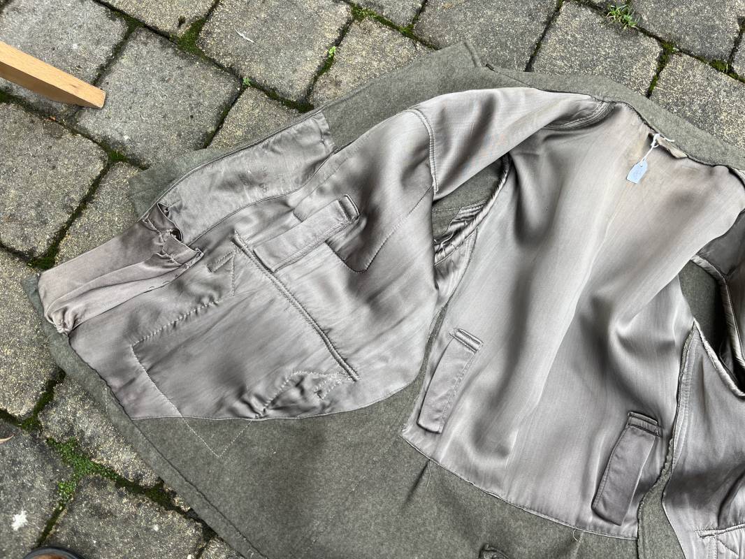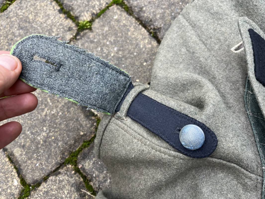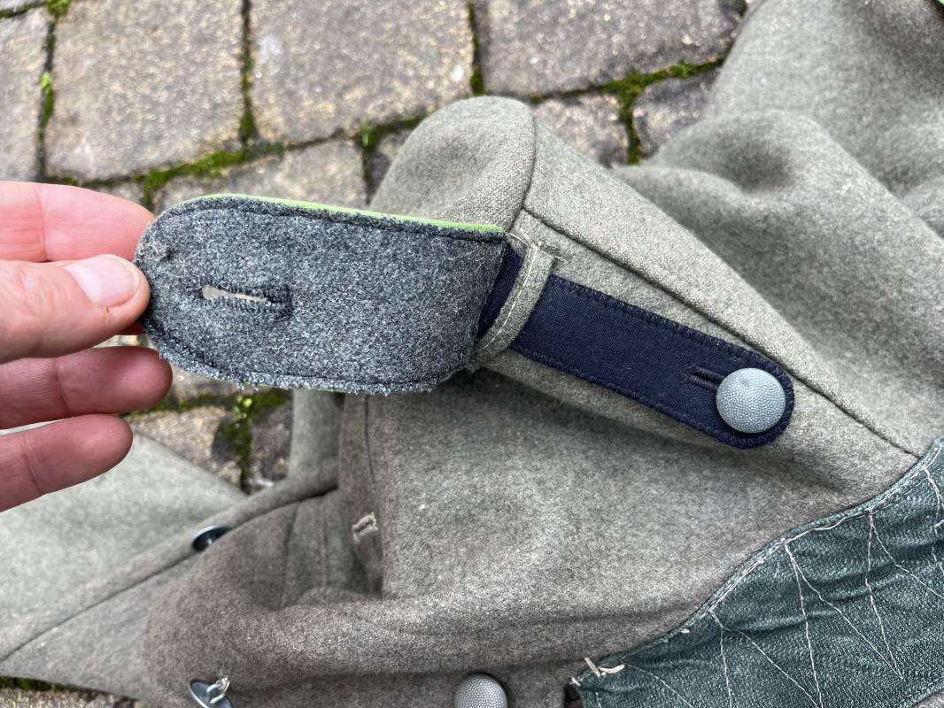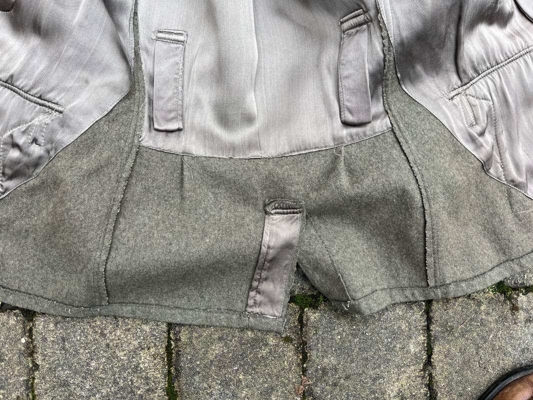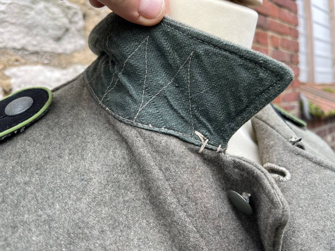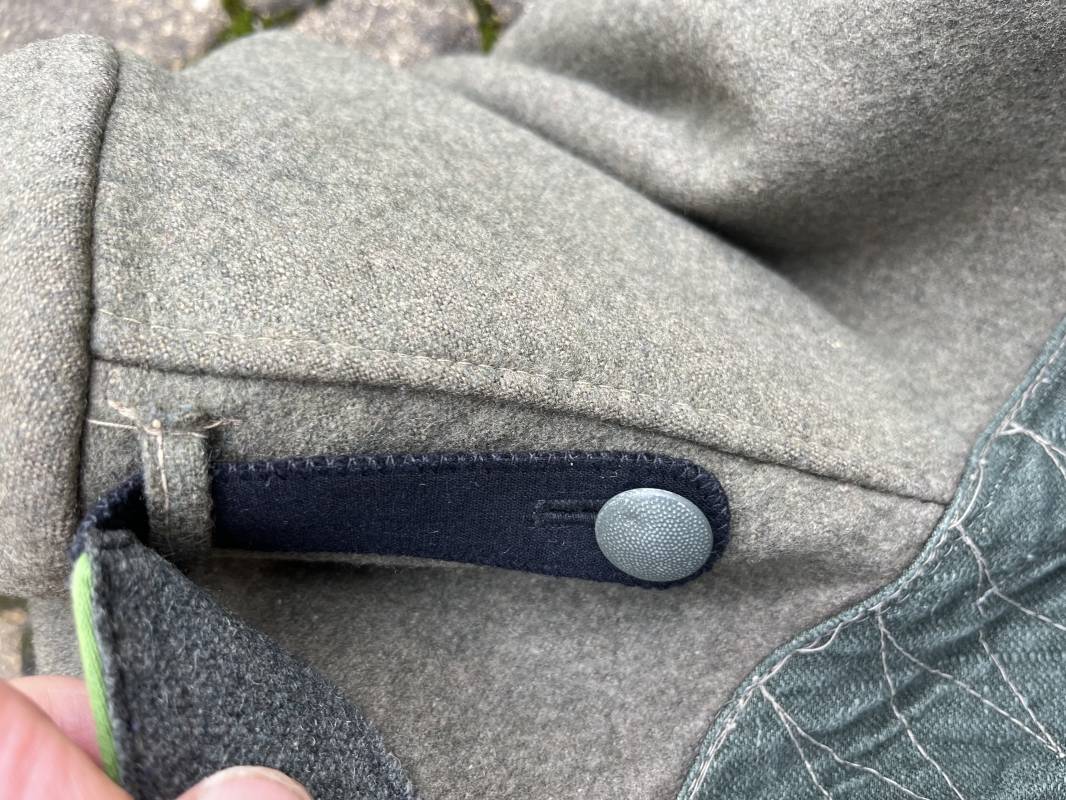 Rare veste troupe modéle 1942 en drap feldgrau d'un soldat panzer grenadier de la 17éme Division blindée 'Gotz Von Berlichingen' de la Waffen SS . Cette trés rare veste a été trouvée dans le secteur de Vernon ( 27 ) il y a 40 ans . Veste modéle 1942 de dotation de la Waffen SS : Fermeture frontale à cinq boutons métalliques et deux oeillets de fixation des crochets de ceinturon , Quatre poche à rabats en pointes boutonnés . Col avec coins de col troupe ( litzen) modéle brodé en fil de coton gris , montées mains . Revers de col en chevrons treillis vert . Aigle de bras troupe du modéle brodé coton gris , monté mains . Pattes d 'épaules à rabats modéle 1943 , liseré en rayonne 'vert pré' de panzer grenadier , intérieur doublé et renforcé en coton noir . Bande de bras de la 17 Panzer Division Gotz Von Berlichingen cousue sur la manche gauche , montage mains . Bande de bras du modéle de dotation tissée BEVO . Tous les boutons sont montés d 'origine . Intérieur doublé satinette grise . Poche a pansement et bouton . Marquage encre des taille Marquage code fabricant ' 525 ' Largeur épaules 43 cm , longueur 68 cm , manche 65 cm . Trés belle veste légérement portée en trés bel état .Drap trés frais . Veste non raccourcie , non modifiée . Uniforme définitif en collection . Rare uniforme des troupes combattantes de la Waffen SS durant la bataille de Normandie en été 1944 Ref 2510