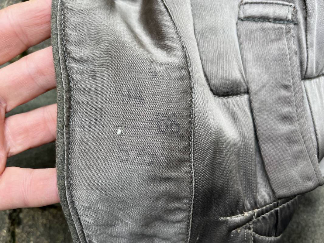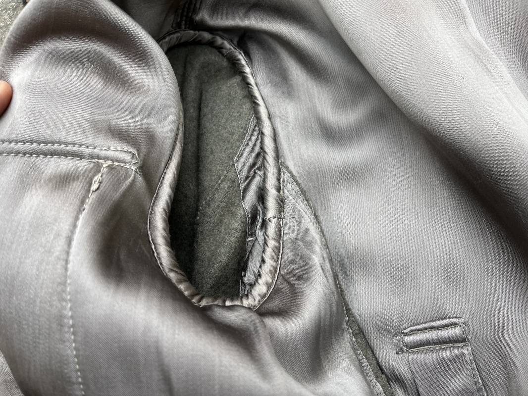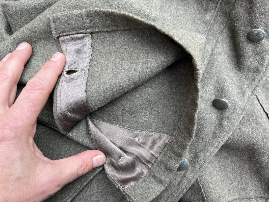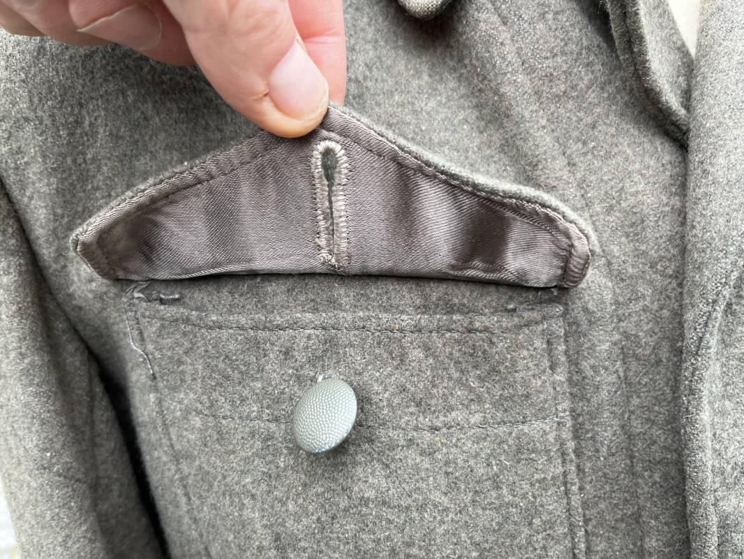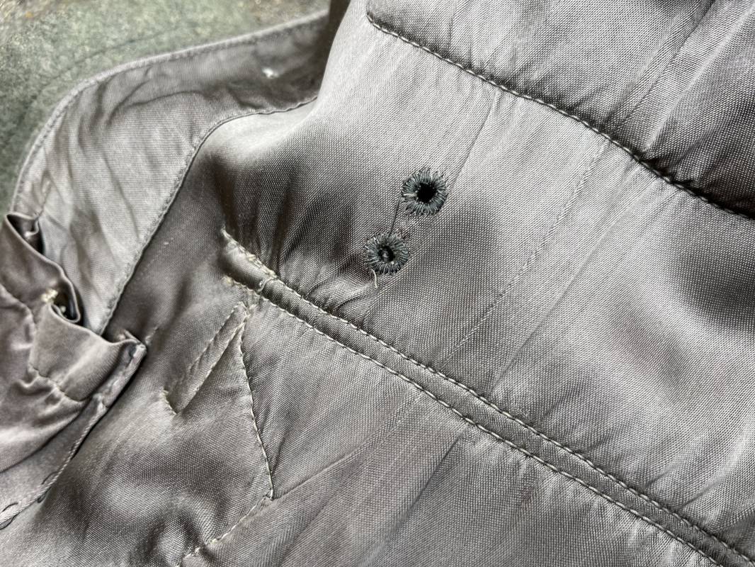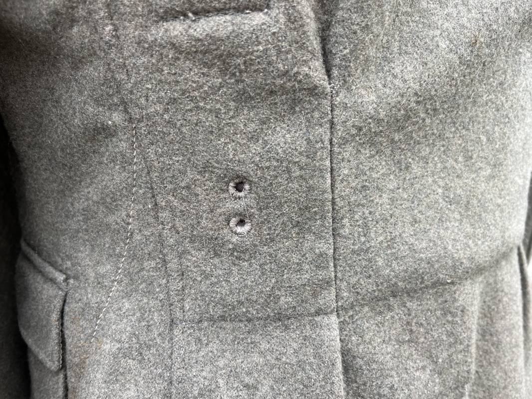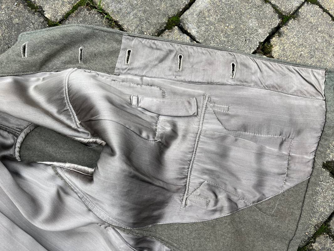 Rare veste troupe modéle 1942 en drap feldgrau d'un soldat panzer grenadier de la 17éme Division blindée 'Gotz Von Berlichingen' de la Waffen SS . Cette trés rare veste a été trouvée dans le secteur de Vernon ( 27 ) il y a 40 ans . Veste modéle 1942 de dotation de la Waffen SS : Fermeture frontale à cinq boutons métalliques et deux oeillets de fixation des crochets de ceinturon , Quatre poche à rabats en pointes boutonnés . Col avec coins de col troupe ( litzen) modéle brodé en fil de coton gris , montées mains . Revers de col en chevrons treillis vert . Aigle de bras troupe du modéle brodé coton gris , monté mains . Pattes d 'épaules à rabats modéle 1943 , liseré en rayonne 'vert pré' de panzer grenadier , intérieur doublé et renforcé en coton noir . Bande de bras de la 17 Panzer Division Gotz Von Berlichingen cousue sur la manche gauche , montage mains . Bande de bras du modéle de dotation tissée BEVO . Tous les boutons sont montés d 'origine . Intérieur doublé satinette grise . Poche a pansement et bouton . Marquage encre des taille Marquage code fabricant ' 525 ' Largeur épaules 43 cm , longueur 68 cm , manche 65 cm . Trés belle veste légérement portée en trés bel état .Drap trés frais . Veste non raccourcie , non modifiée . Uniforme définitif en collection . Rare uniforme des troupes combattantes de la Waffen SS durant la bataille de Normandie en été 1944 Ref 2510
