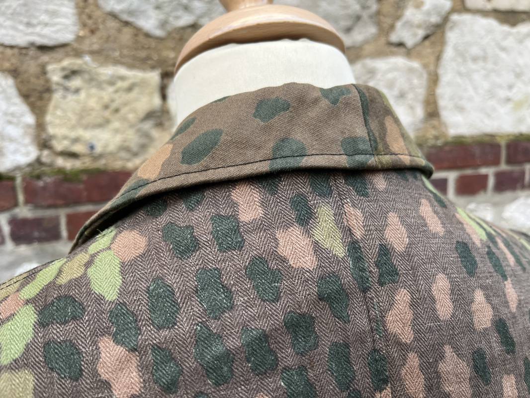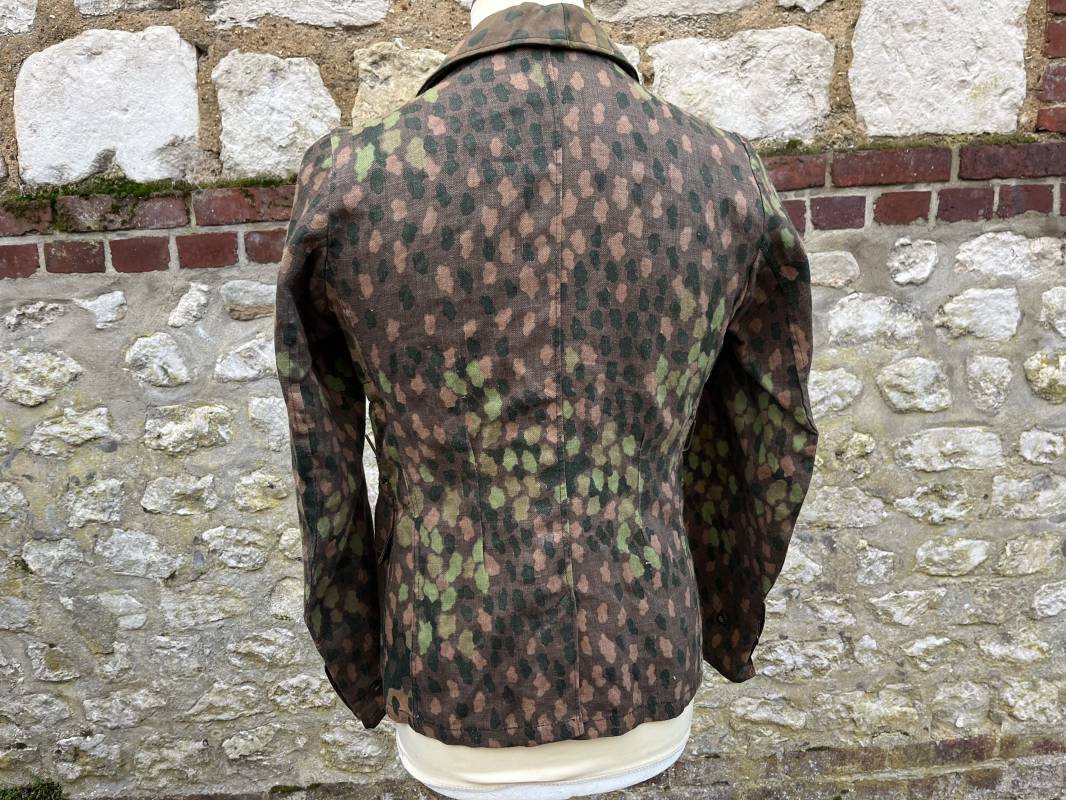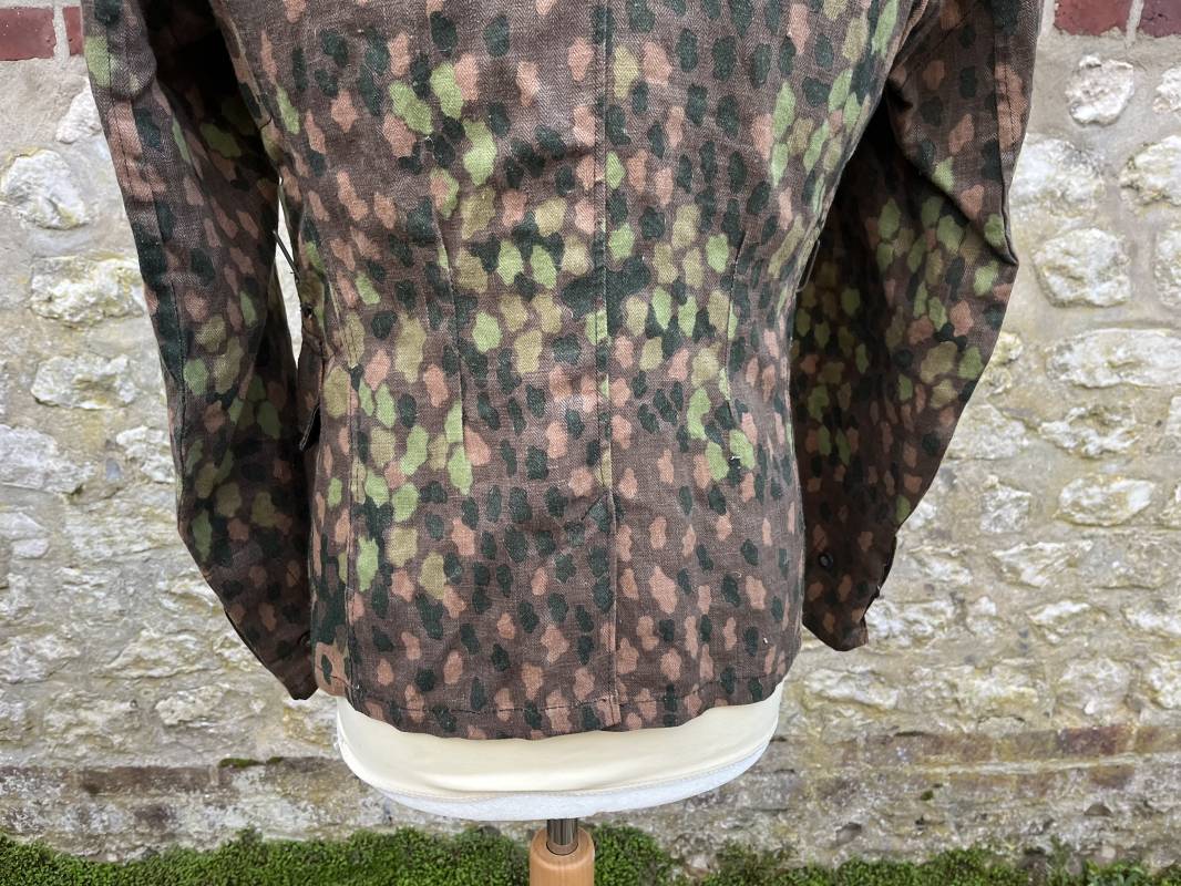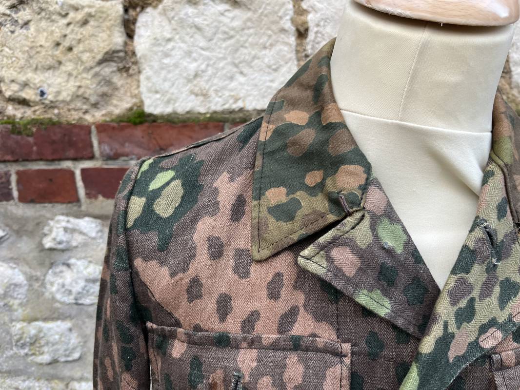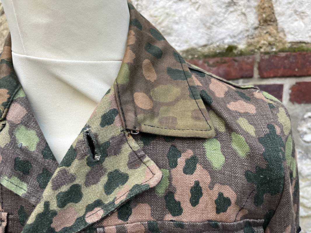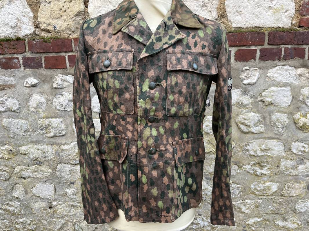 Rare veste troupe modéle 1943 en treillis chevrons camouflée type 'petits pois' de la Waffen SS . Cette trés rare veste est dans un état de conservation exceptionnel . Cette veste est confectionneé en tissu chevrons sauf le col qui est en tissu coton camouflé ! Rare montage mixte . Crochet métallique au col . Veste modéle 1943 de dotation de la Waffen SS : Fermeture frontale à cinq boutons métalliques et deux oeillets de fixation des crochets de ceinturon , deux crochets de ceinturon en fer peints en vert , Quatre poche à rabats droits boutonnés . Aigle de bras troupe du modéle brodé coton gris , monté mains . Tous les boutons sont montés d 'origine . Intérieur doublé satinette grise à chevrons typique des effets vestimentiaires de la WSS . Marquage encre des taille Marquage fabricant Bet;rA Largeur épaules 40 cm , longueur 67 cm , manche 60 cm . Trés belle veste dans un état de conservation exceptionnel . Couleurs de camouflage exceptionnel . Cette veste n a jamais ete reparée , restaurée ni transformée . Veste non raccourcie , non modifiée . Uniforme définitif en collection . Rare uniforme des troupes combattante s de la WSS 1944/45 Ref 18851