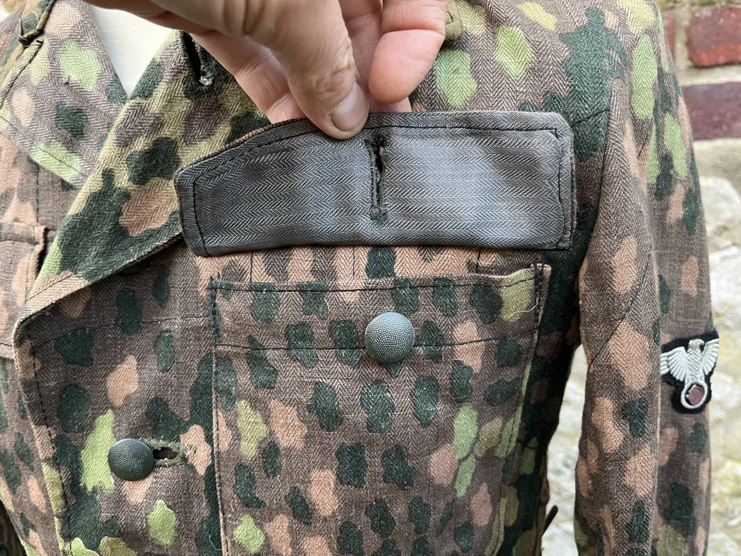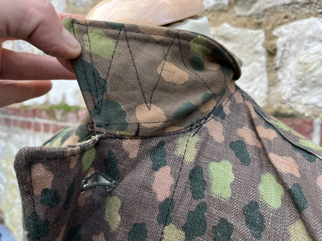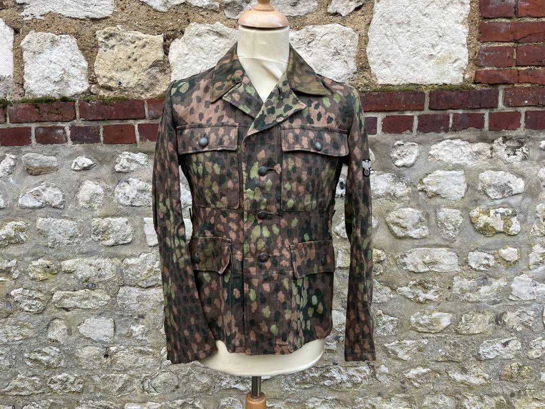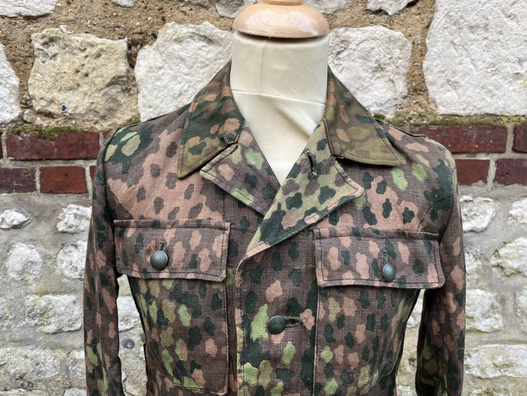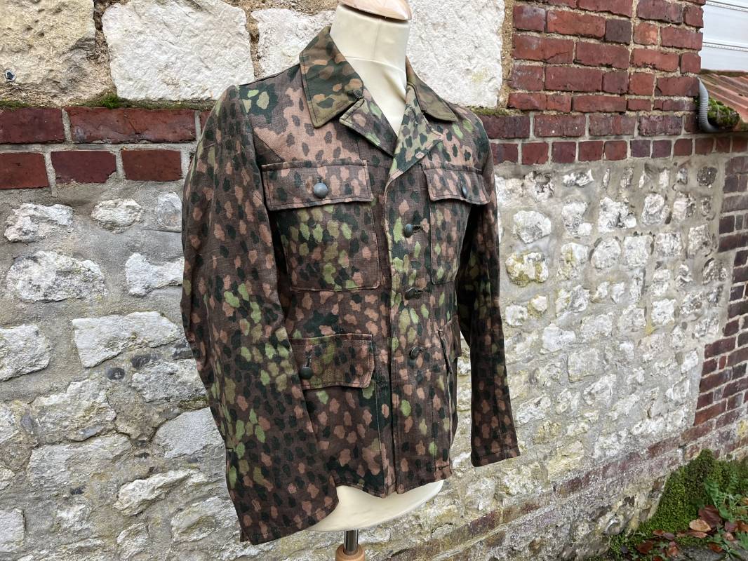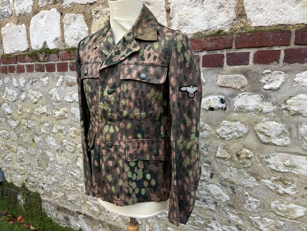 Rare veste troupe modéle 1943 en treillis chevrons camouflée type 'petits pois' de la Waffen SS . Cette trés rare veste est dans un état de conservation exceptionnel . Cette veste est confectionneé en tissu chevrons sauf le col qui est en tissu coton camouflé ! Rare montage mixte . Crochet métallique au col . Veste modéle 1943 de dotation de la Waffen SS : Fermeture frontale à cinq boutons métalliques et deux oeillets de fixation des crochets de ceinturon , deux crochets de ceinturon en fer peints en vert , Quatre poche à rabats droits boutonnés . Aigle de bras troupe du modéle brodé coton gris , monté mains . Tous les boutons sont montés d 'origine . Intérieur doublé satinette grise à chevrons typique des effets vestimentiaires de la WSS . Marquage encre des taille Marquage fabricant Bet;rA Largeur épaules 40 cm , longueur 67 cm , manche 60 cm . Trés belle veste dans un état de conservation exceptionnel . Couleurs de camouflage exceptionnel . Cette veste n a jamais ete reparée , restaurée ni transformée . Veste non raccourcie , non modifiée . Uniforme définitif en collection . Rare uniforme des troupes combattante s de la WSS 1944/45 Ref 18851