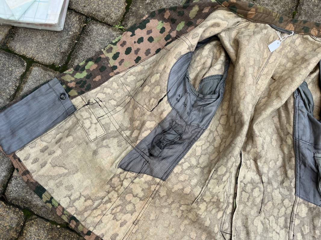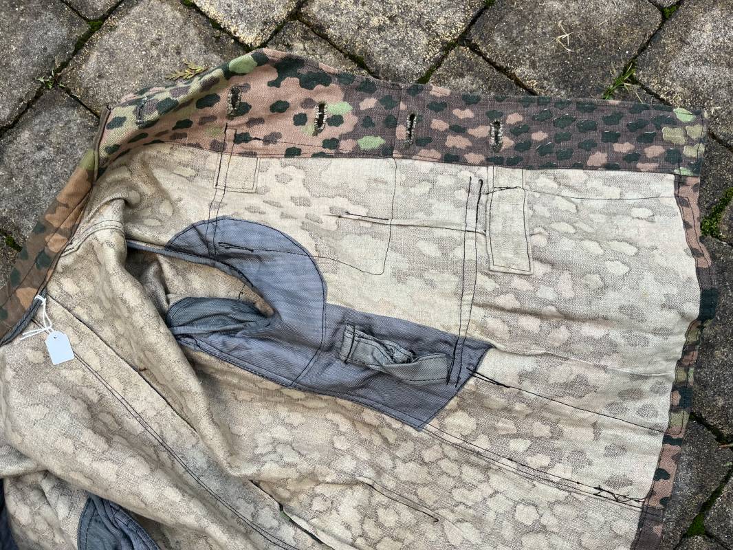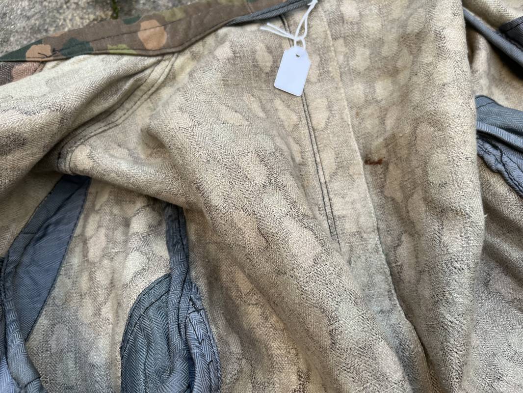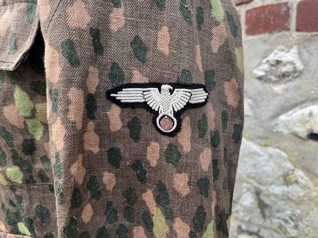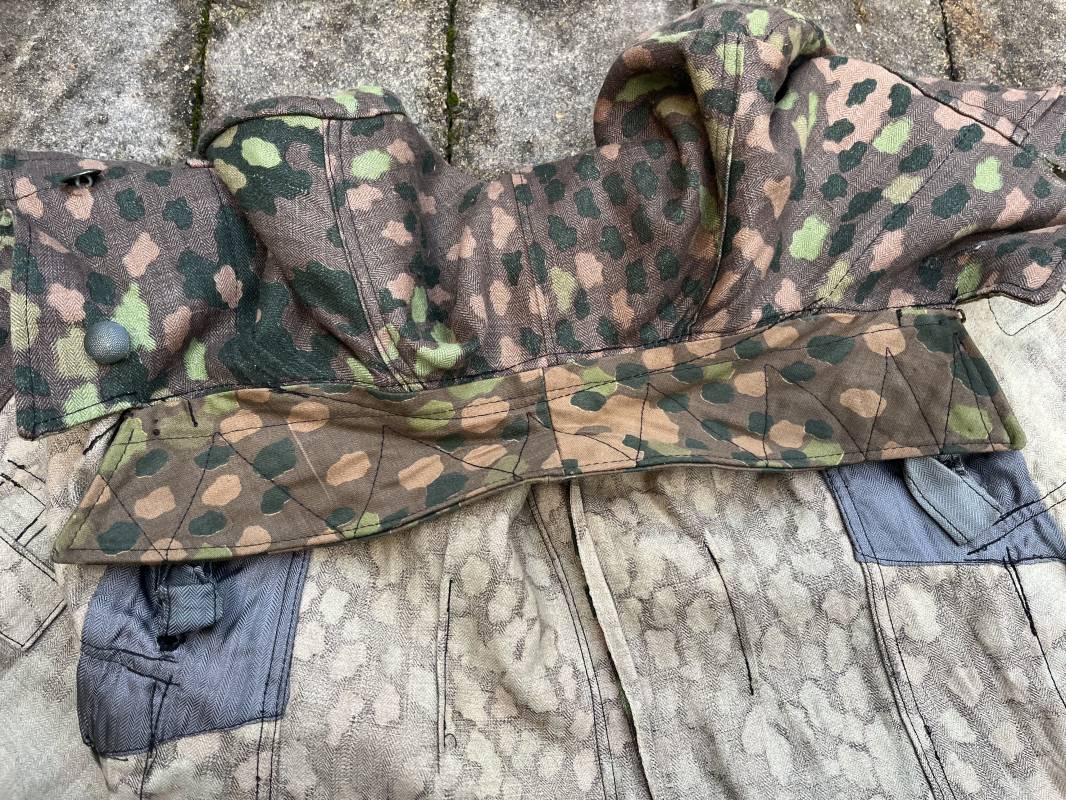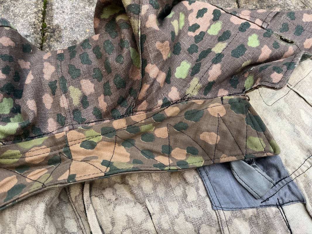 Rare veste troupe modéle 1943 en treillis chevrons camouflée type 'petits pois' de la Waffen SS . Cette trés rare veste est dans un état de conservation exceptionnel . Cette veste est confectionneé en tissu chevrons sauf le col qui est en tissu coton camouflé ! Rare montage mixte . Crochet métallique au col . Veste modéle 1943 de dotation de la Waffen SS : Fermeture frontale à cinq boutons métalliques et deux oeillets de fixation des crochets de ceinturon , deux crochets de ceinturon en fer peints en vert , Quatre poche à rabats droits boutonnés . Aigle de bras troupe du modéle brodé coton gris , monté mains . Tous les boutons sont montés d 'origine . Intérieur doublé satinette grise à chevrons typique des effets vestimentiaires de la WSS . Marquage encre des taille Marquage fabricant Bet;rA Largeur épaules 40 cm , longueur 67 cm , manche 60 cm . Trés belle veste dans un état de conservation exceptionnel . Couleurs de camouflage exceptionnel . Cette veste n a jamais ete reparée , restaurée ni transformée . Veste non raccourcie , non modifiée . Uniforme définitif en collection . Rare uniforme des troupes combattante s de la WSS 1944/45 Ref 18851