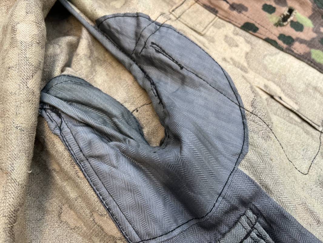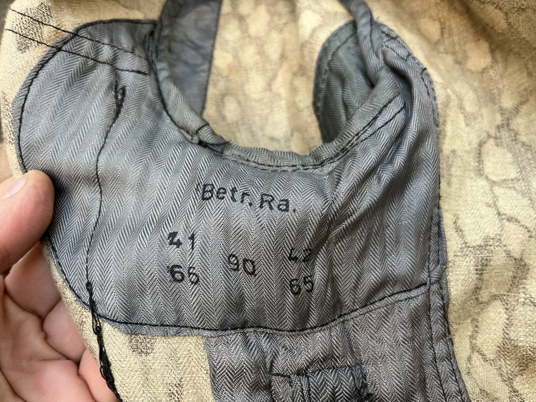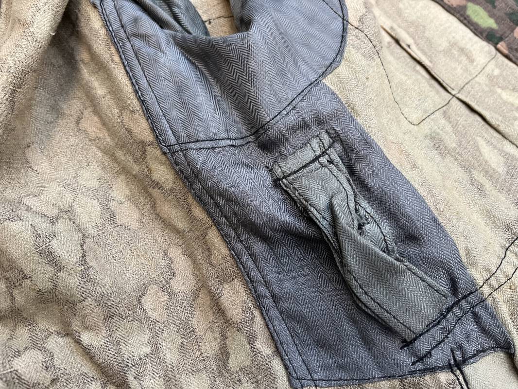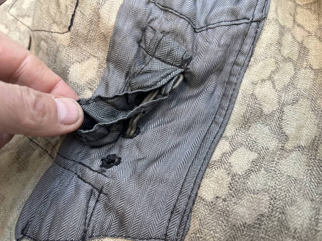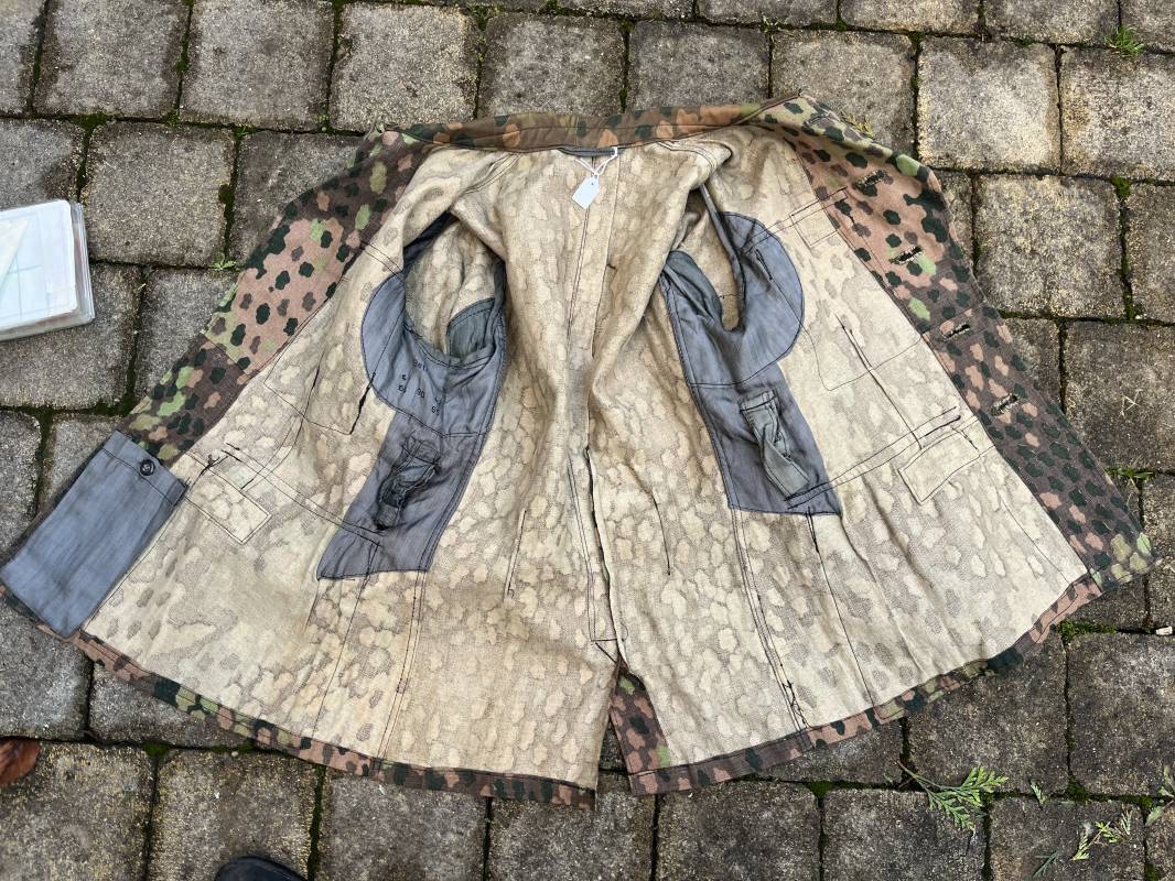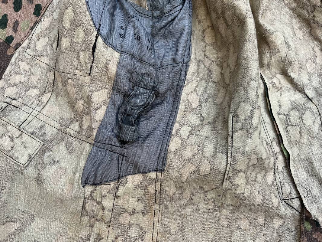 Rare veste troupe modéle 1943 en treillis chevrons camouflée type 'petits pois' de la Waffen SS . Cette trés rare veste est dans un état de conservation exceptionnel . Cette veste est confectionneé en tissu chevrons sauf le col qui est en tissu coton camouflé ! Rare montage mixte . Crochet métallique au col . Veste modéle 1943 de dotation de la Waffen SS : Fermeture frontale à cinq boutons métalliques et deux oeillets de fixation des crochets de ceinturon , deux crochets de ceinturon en fer peints en vert , Quatre poche à rabats droits boutonnés . Aigle de bras troupe du modéle brodé coton gris , monté mains . Tous les boutons sont montés d 'origine . Intérieur doublé satinette grise à chevrons typique des effets vestimentiaires de la WSS . Marquage encre des taille Marquage fabricant Bet;rA Largeur épaules 40 cm , longueur 67 cm , manche 60 cm . Trés belle veste dans un état de conservation exceptionnel . Couleurs de camouflage exceptionnel . Cette veste n a jamais ete reparée , restaurée ni transformée . Veste non raccourcie , non modifiée . Uniforme définitif en collection . Rare uniforme des troupes combattante s de la WSS 1944/45 Ref 18851
