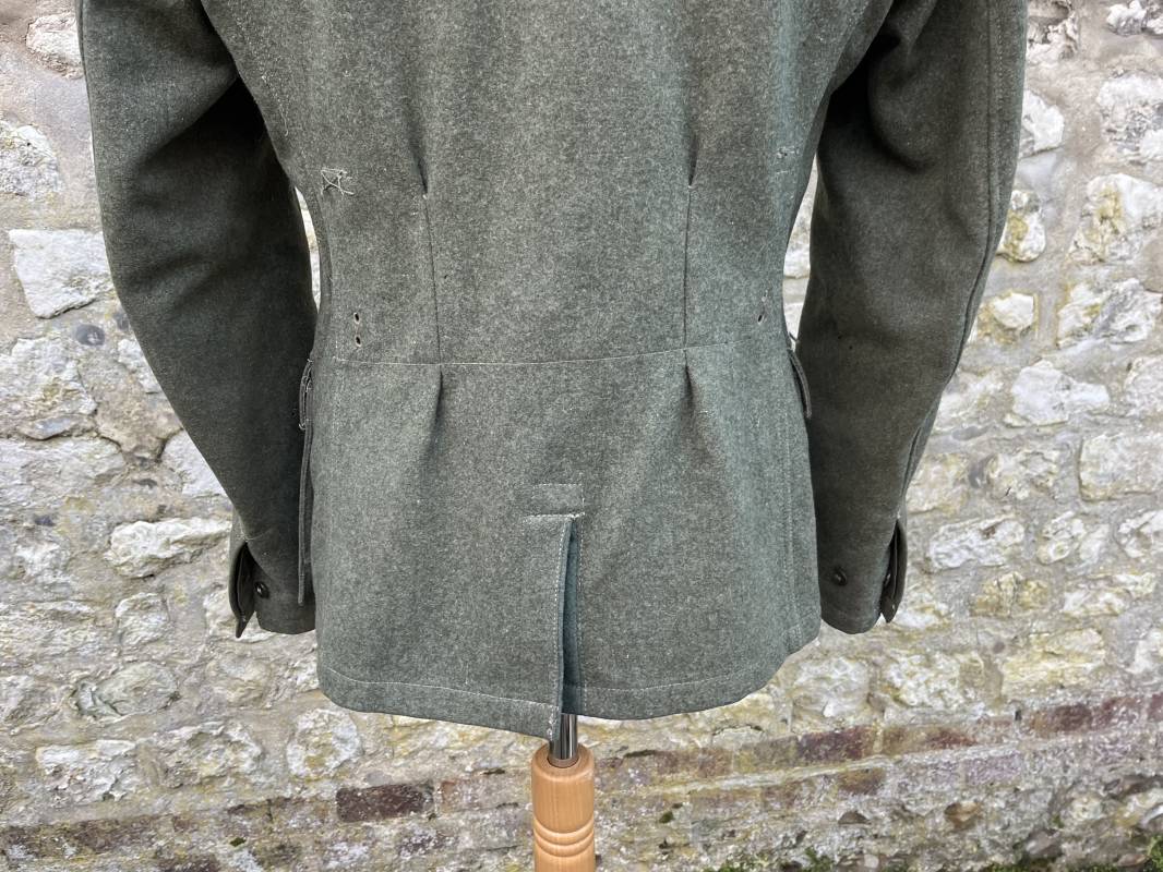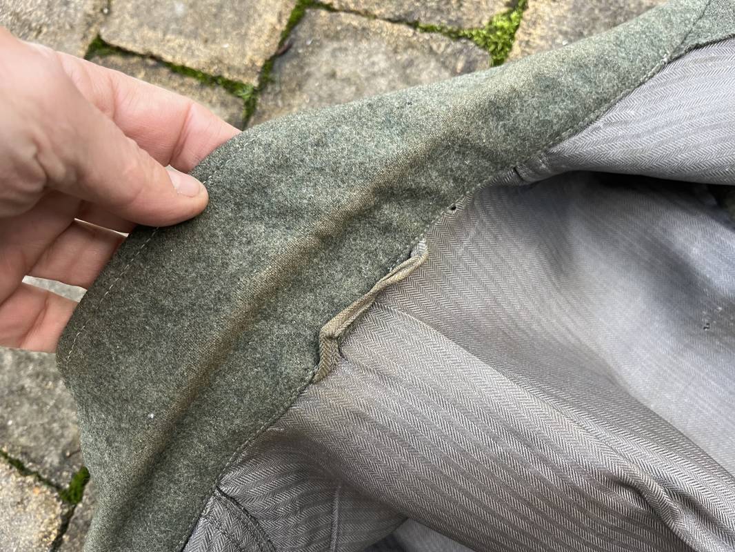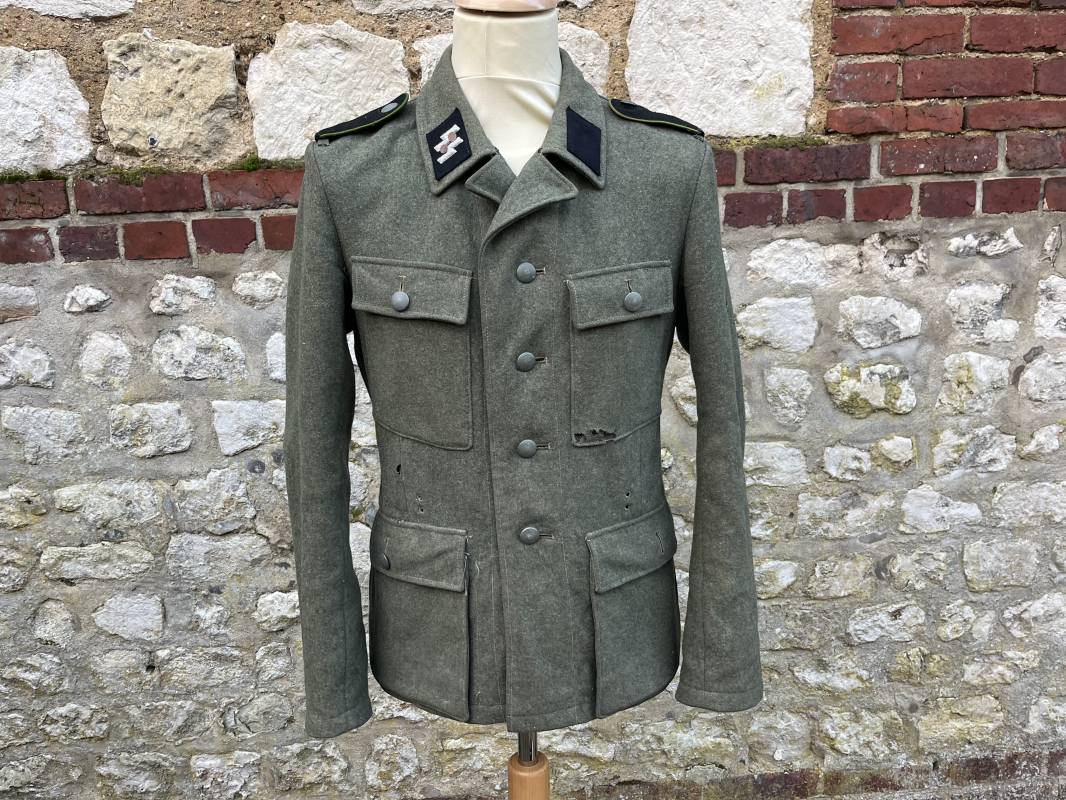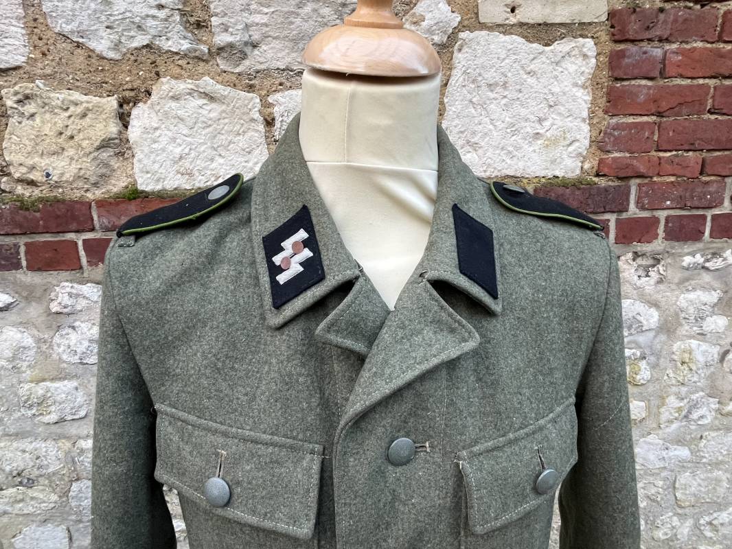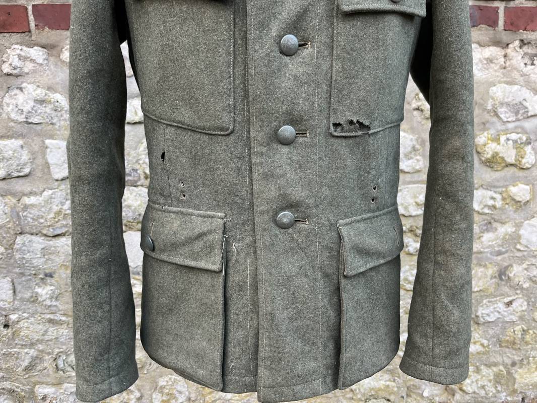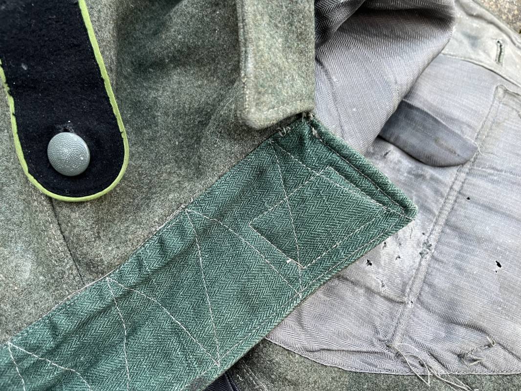 Rare veste troupe modéle 1943 en drap feldgrau d'un soldat Panzer grenadier de la Waffen SS . Cette trés rare veste montée d 'origine a été trouvée dans le secteur de Lisieux ( 14 ) il y a 40 ans . 100 % d origine et intouchée . Veste modéle 1943 de dotation de la Waffen SS : Fermeture frontale à cinq boutons métalliques et deux oeillets de fixation des crochets de ceinturon , Quatre poche à rabats droits boutonnés . Col avec coins de col troupe ( litzen) modéle brodé en fil de coton gris , montées machine d 'origine . Aigle de bras troupe du modéle brodé coton gris , monté machine zig zag . Pattes d 'épaules à rabats modéle 1943 , liseré en rayonne vert pré de panzer grenadier , intérieur doublé et renforcé en coton noir . Tous les boutons sont montés d 'origine . Intérieur doublé satinette grise à chevrons typique des effets vestimentiaires de la WSS a noté quelques degats sur la doublure intérieure ( voir photos ) . Marquage encre des taille Marquage code fabricant F349 Largeur épaules 44 cm , longueur 72 cm , manche 63 cm . Trés belle veste légérement portée en trés bel état .Drap trés frais . A noté trous de mites sur bas de poche de poitrine ( voir photos ) . Cette veste n a jamais ete reparée , restaurée ni transformée . Veste non raccourcie , non modifiée . Uniforme définitif en collection . Rare uniforme des troupes combattante s de la WSS durant la bataille de Normandie 1944 Ref 22504