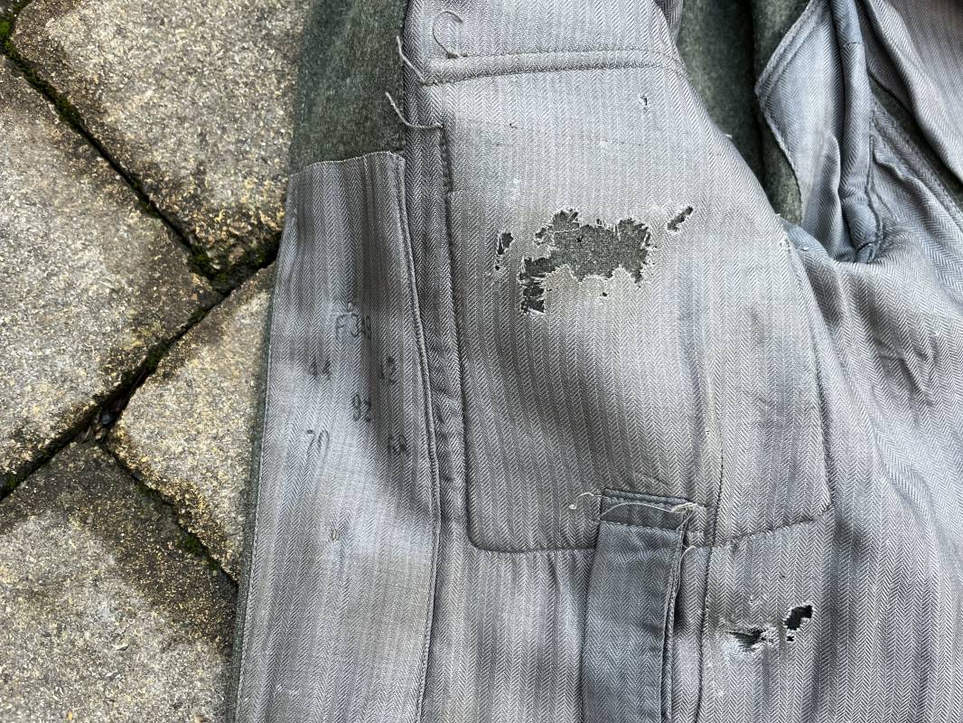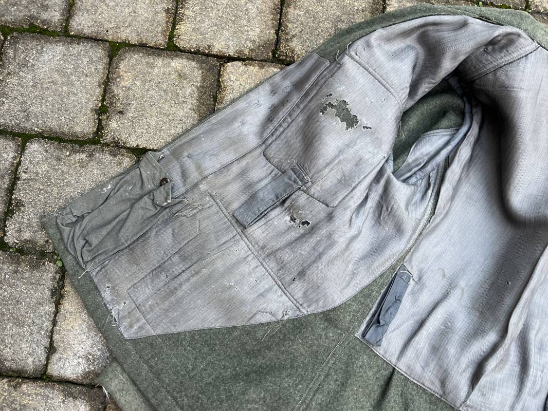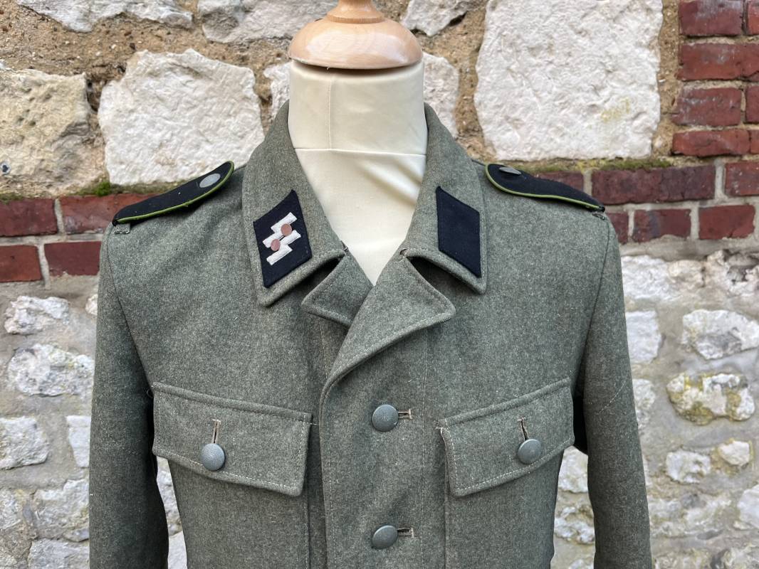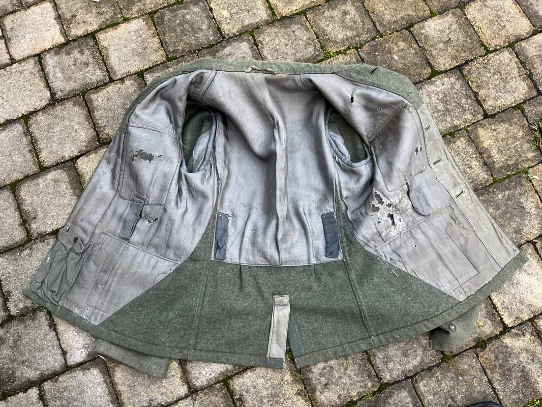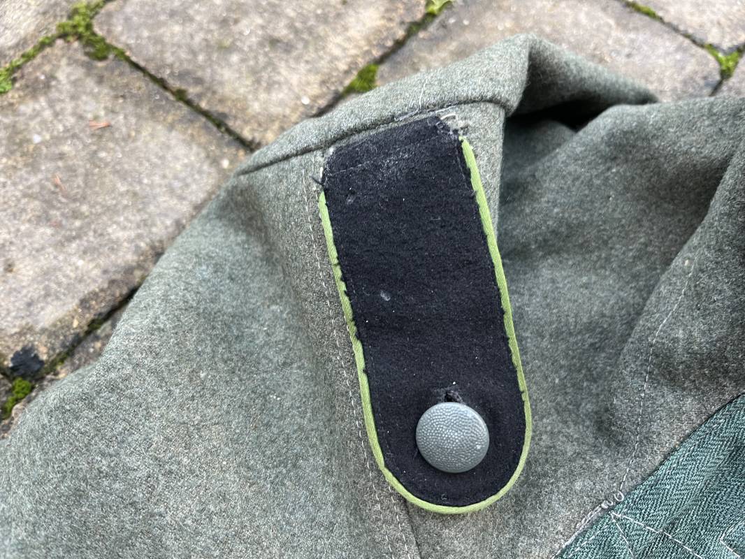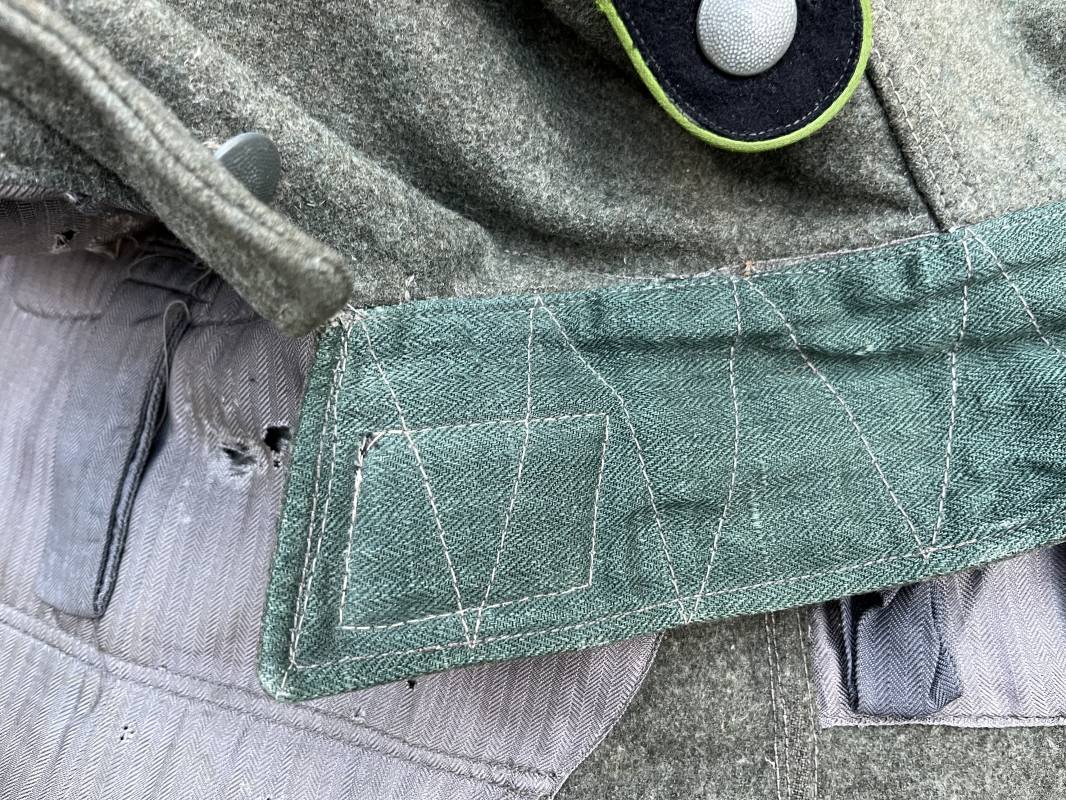 Rare veste troupe modéle 1943 en drap feldgrau d'un soldat Panzer grenadier de la Waffen SS . Cette trés rare veste montée d 'origine a été trouvée dans le secteur de Lisieux ( 14 ) il y a 40 ans . 100 % d origine et intouchée . Veste modéle 1943 de dotation de la Waffen SS : Fermeture frontale à cinq boutons métalliques et deux oeillets de fixation des crochets de ceinturon , Quatre poche à rabats droits boutonnés . Col avec coins de col troupe ( litzen) modéle brodé en fil de coton gris , montées machine d 'origine . Aigle de bras troupe du modéle brodé coton gris , monté machine zig zag . Pattes d 'épaules à rabats modéle 1943 , liseré en rayonne vert pré de panzer grenadier , intérieur doublé et renforcé en coton noir . Tous les boutons sont montés d 'origine . Intérieur doublé satinette grise à chevrons typique des effets vestimentiaires de la WSS a noté quelques degats sur la doublure intérieure ( voir photos ) . Marquage encre des taille Marquage code fabricant F349 Largeur épaules 44 cm , longueur 72 cm , manche 63 cm . Trés belle veste légérement portée en trés bel état .Drap trés frais . A noté trous de mites sur bas de poche de poitrine ( voir photos ) . Cette veste n a jamais ete reparée , restaurée ni transformée . Veste non raccourcie , non modifiée . Uniforme définitif en collection . Rare uniforme des troupes combattante s de la WSS durant la bataille de Normandie 1944 Ref 22504
