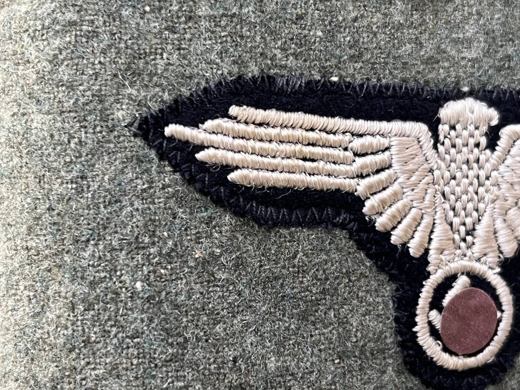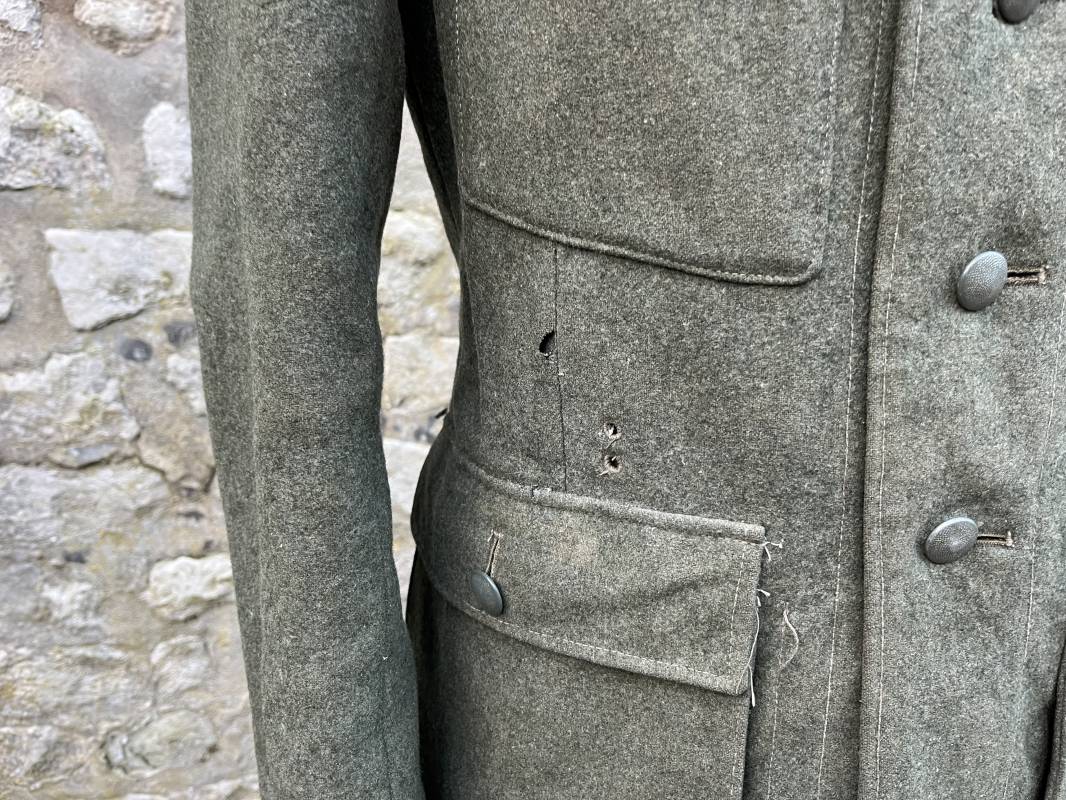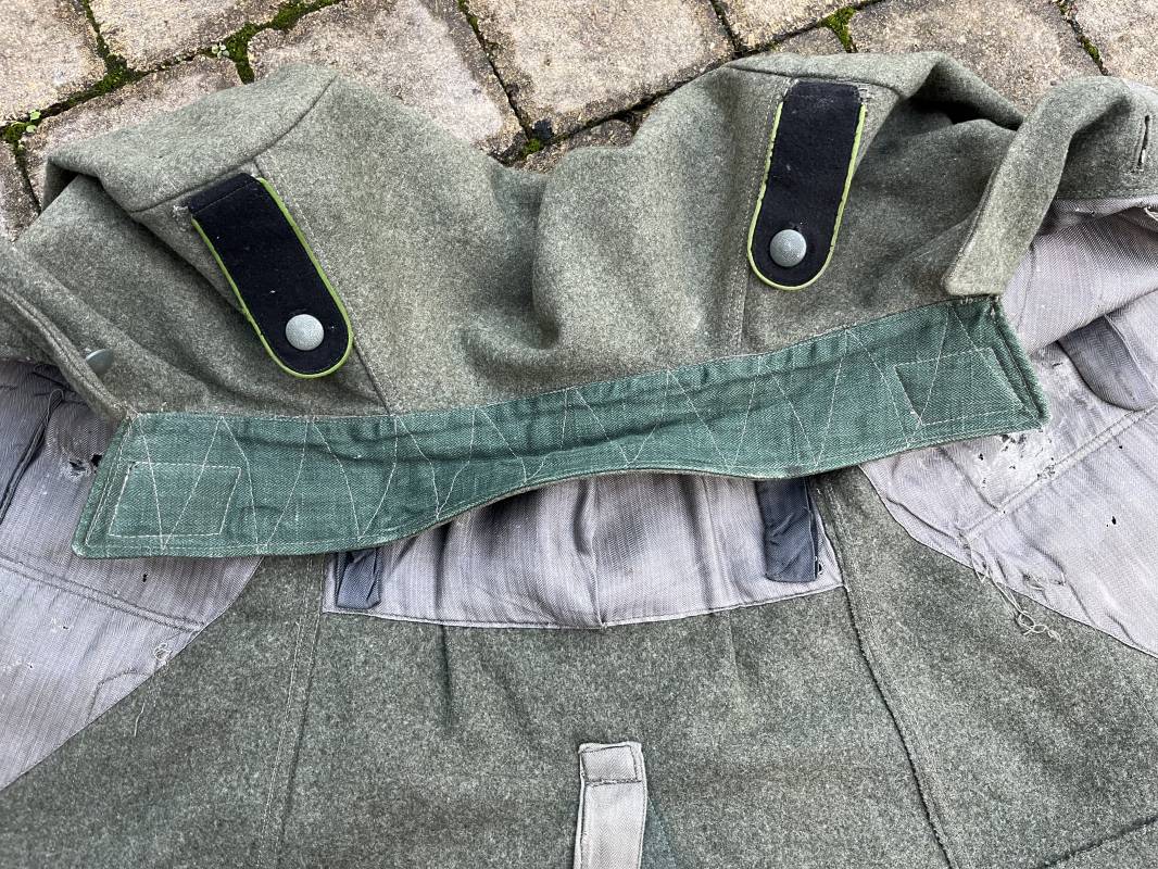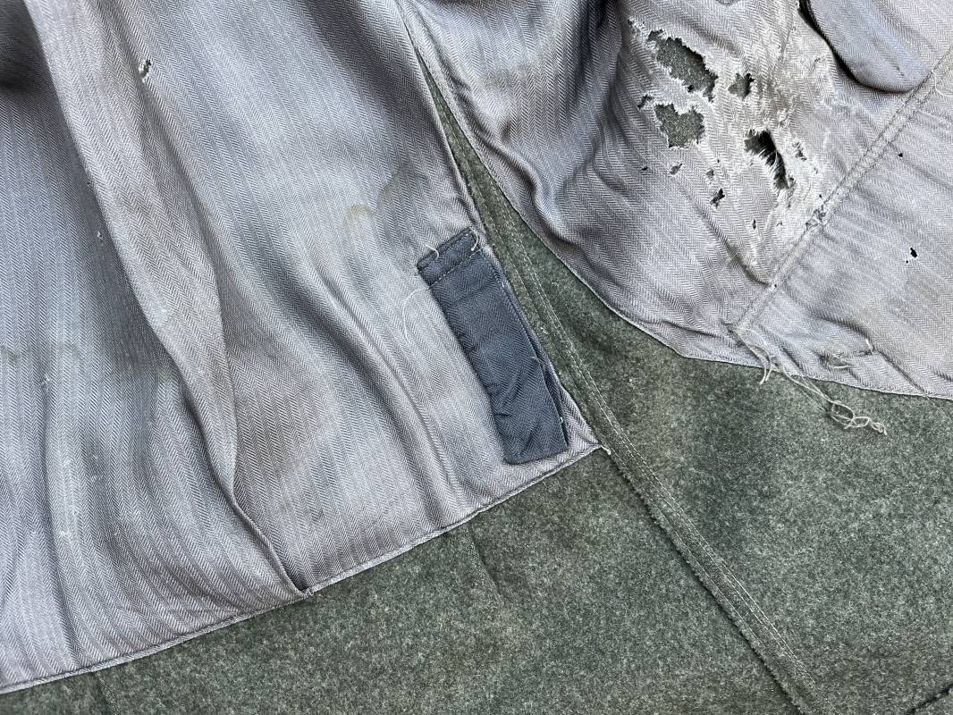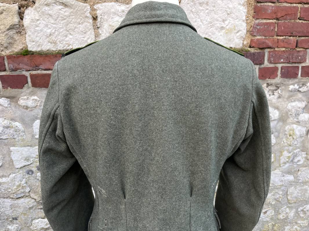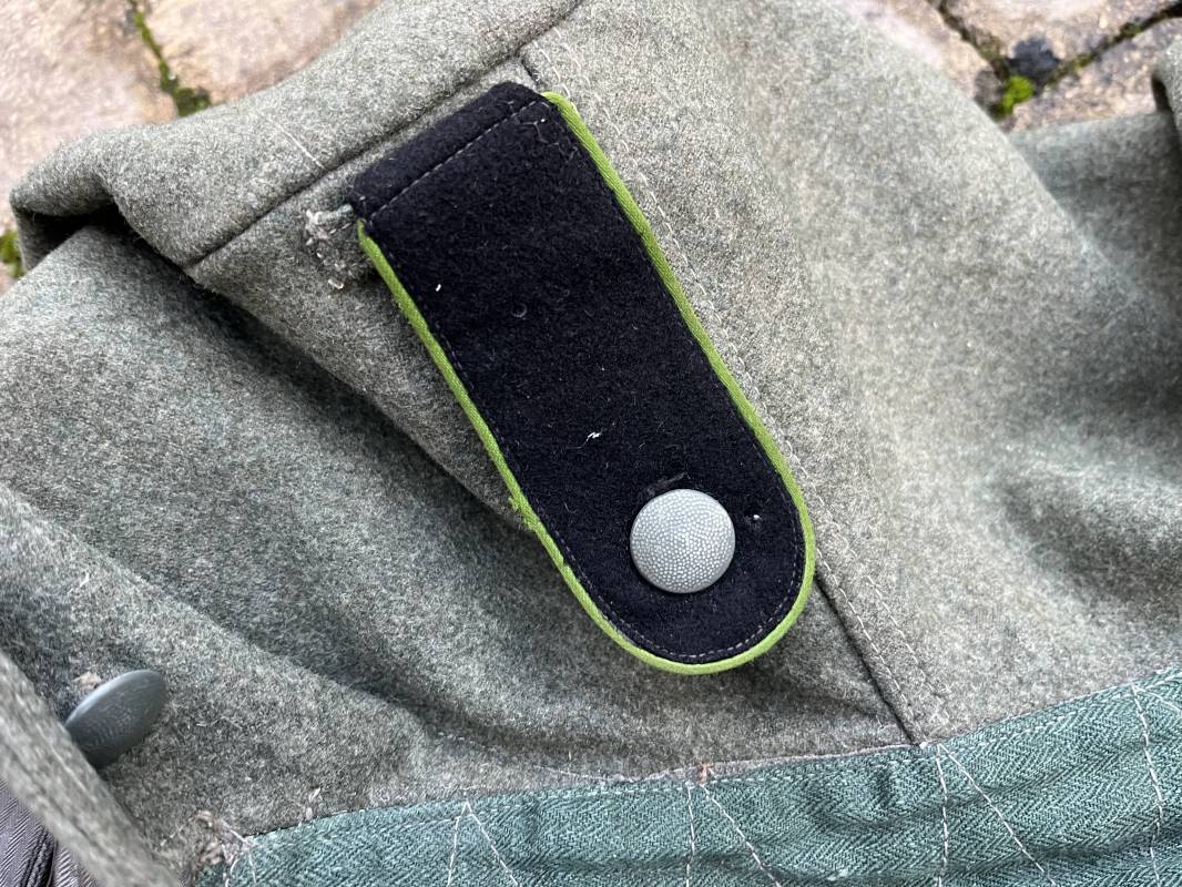 Rare veste troupe modéle 1943 en drap feldgrau d'un soldat Panzer grenadier de la Waffen SS . Cette trés rare veste montée d 'origine a été trouvée dans le secteur de Lisieux ( 14 ) il y a 40 ans . 100 % d origine et intouchée . Veste modéle 1943 de dotation de la Waffen SS : Fermeture frontale à cinq boutons métalliques et deux oeillets de fixation des crochets de ceinturon , Quatre poche à rabats droits boutonnés . Col avec coins de col troupe ( litzen) modéle brodé en fil de coton gris , montées machine d 'origine . Aigle de bras troupe du modéle brodé coton gris , monté machine zig zag . Pattes d 'épaules à rabats modéle 1943 , liseré en rayonne vert pré de panzer grenadier , intérieur doublé et renforcé en coton noir . Tous les boutons sont montés d 'origine . Intérieur doublé satinette grise à chevrons typique des effets vestimentiaires de la WSS a noté quelques degats sur la doublure intérieure ( voir photos ) . Marquage encre des taille Marquage code fabricant F349 Largeur épaules 44 cm , longueur 72 cm , manche 63 cm . Trés belle veste légérement portée en trés bel état .Drap trés frais . A noté trous de mites sur bas de poche de poitrine ( voir photos ) . Cette veste n a jamais ete reparée , restaurée ni transformée . Veste non raccourcie , non modifiée . Uniforme définitif en collection . Rare uniforme des troupes combattante s de la WSS durant la bataille de Normandie 1944 Ref 22504