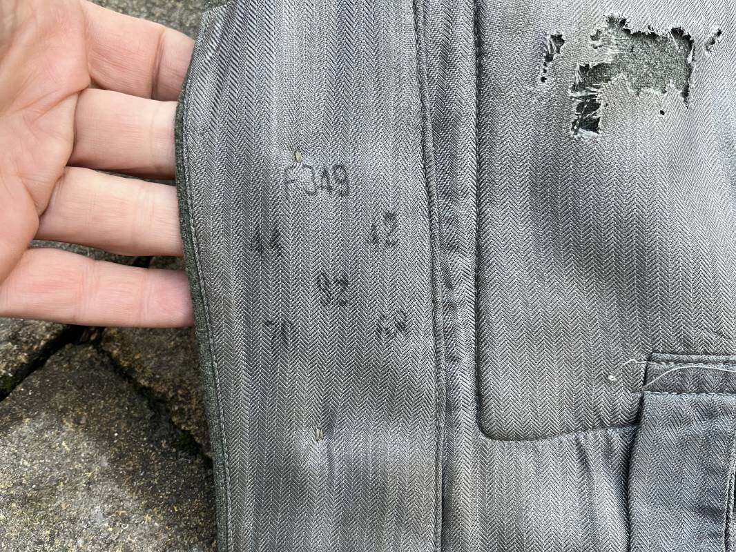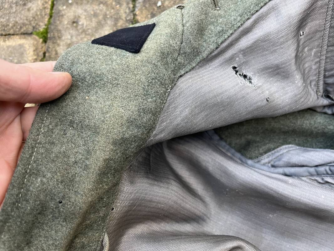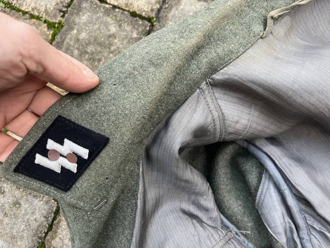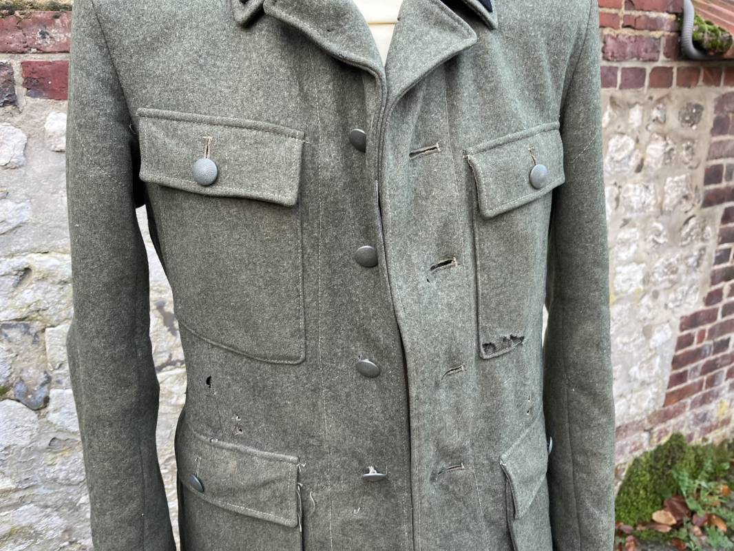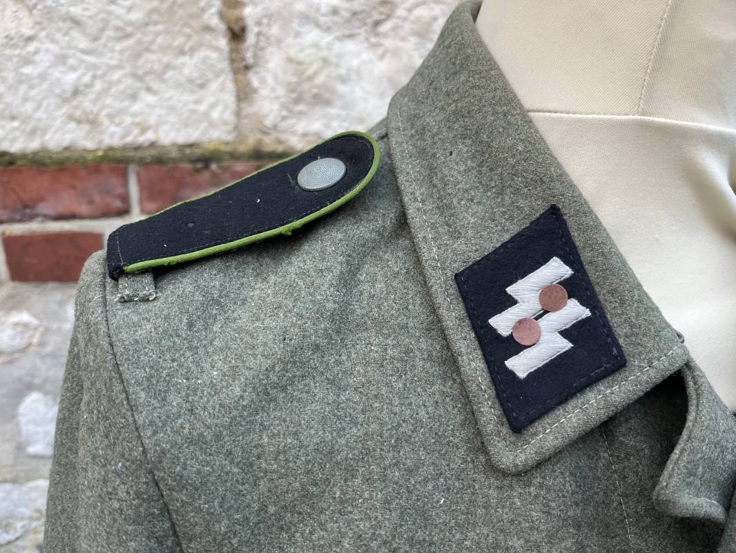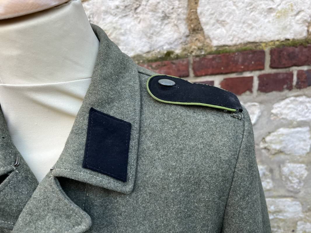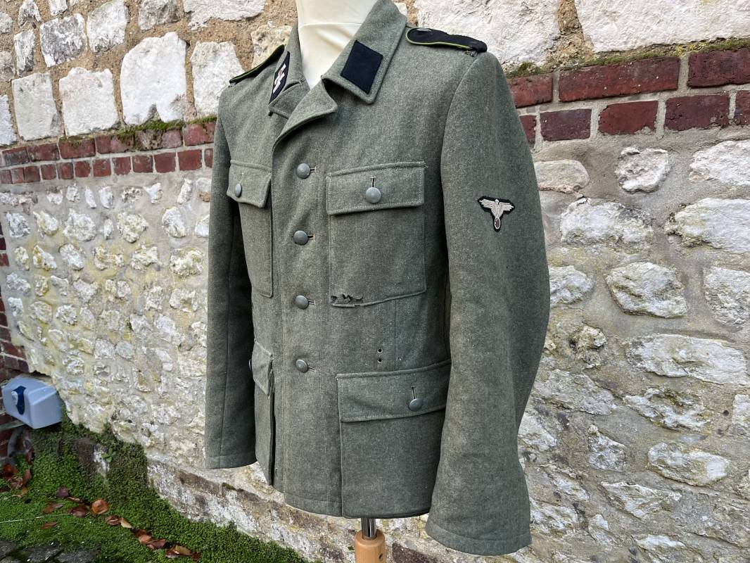 Rare veste troupe modéle 1943 en drap feldgrau d'un soldat Panzer grenadier de la Waffen SS . Cette trés rare veste montée d 'origine a été trouvée dans le secteur de Lisieux ( 14 ) il y a 40 ans . 100 % d origine et intouchée . Veste modéle 1943 de dotation de la Waffen SS : Fermeture frontale à cinq boutons métalliques et deux oeillets de fixation des crochets de ceinturon , Quatre poche à rabats droits boutonnés . Col avec coins de col troupe ( litzen) modéle brodé en fil de coton gris , montées machine d 'origine . Aigle de bras troupe du modéle brodé coton gris , monté machine zig zag . Pattes d 'épaules à rabats modéle 1943 , liseré en rayonne vert pré de panzer grenadier , intérieur doublé et renforcé en coton noir . Tous les boutons sont montés d 'origine . Intérieur doublé satinette grise à chevrons typique des effets vestimentiaires de la WSS a noté quelques degats sur la doublure intérieure ( voir photos ) . Marquage encre des taille Marquage code fabricant F349 Largeur épaules 44 cm , longueur 72 cm , manche 63 cm . Trés belle veste légérement portée en trés bel état .Drap trés frais . A noté trous de mites sur bas de poche de poitrine ( voir photos ) . Cette veste n a jamais ete reparée , restaurée ni transformée . Veste non raccourcie , non modifiée . Uniforme définitif en collection . Rare uniforme des troupes combattante s de la WSS durant la bataille de Normandie 1944 Ref 22504