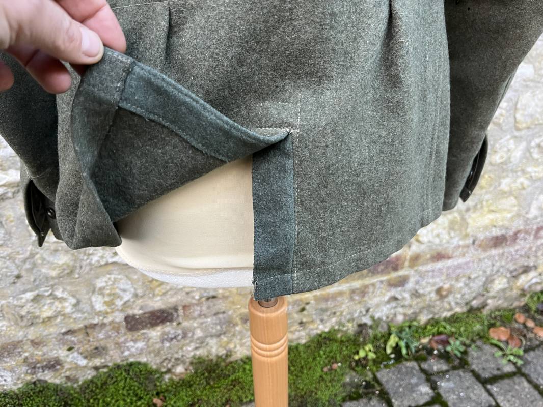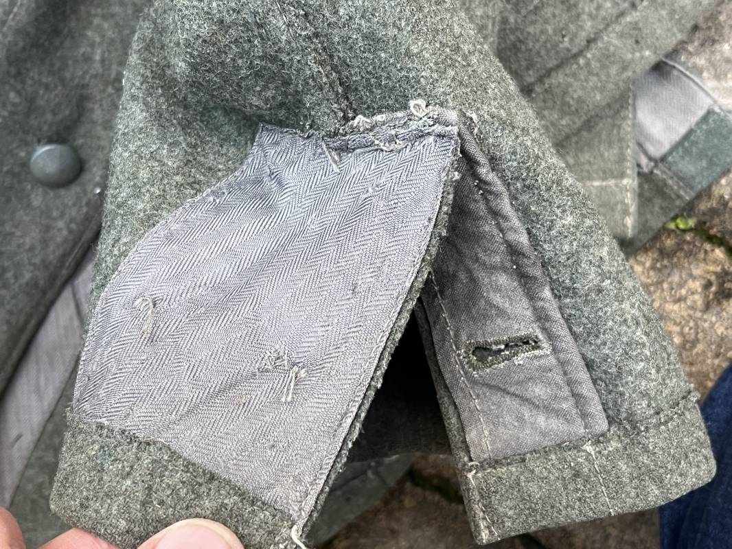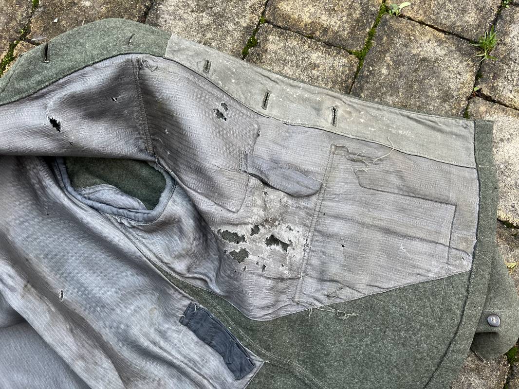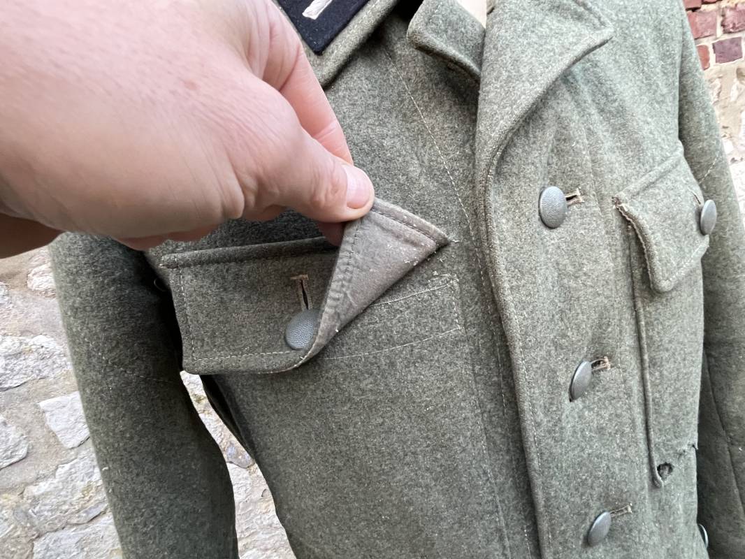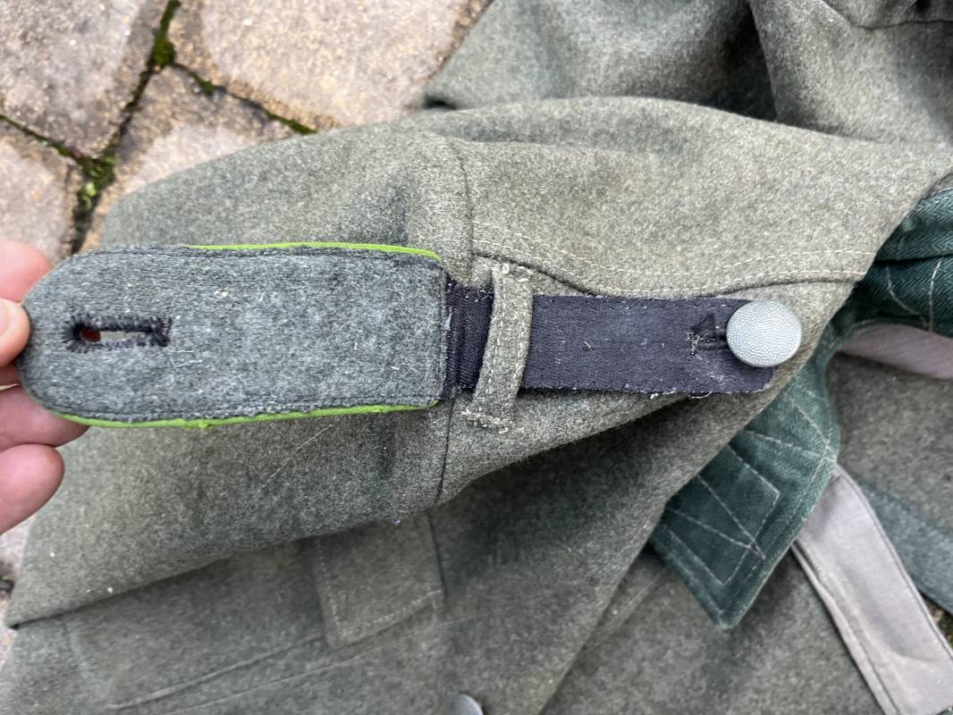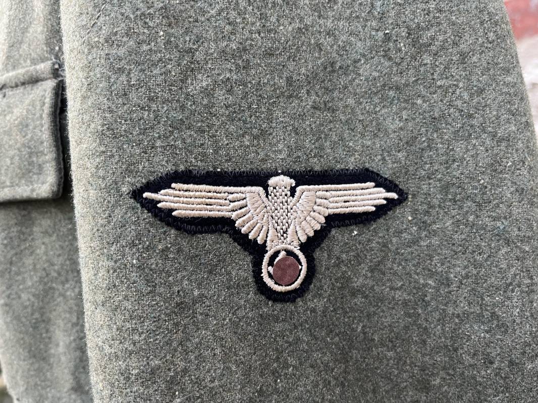 Rare veste troupe modéle 1943 en drap feldgrau d'un soldat Panzer grenadier de la Waffen SS . Cette trés rare veste montée d 'origine a été trouvée dans le secteur de Lisieux ( 14 ) il y a 40 ans . 100 % d origine et intouchée . Veste modéle 1943 de dotation de la Waffen SS : Fermeture frontale à cinq boutons métalliques et deux oeillets de fixation des crochets de ceinturon , Quatre poche à rabats droits boutonnés . Col avec coins de col troupe ( litzen) modéle brodé en fil de coton gris , montées machine d 'origine . Aigle de bras troupe du modéle brodé coton gris , monté machine zig zag . Pattes d 'épaules à rabats modéle 1943 , liseré en rayonne vert pré de panzer grenadier , intérieur doublé et renforcé en coton noir . Tous les boutons sont montés d 'origine . Intérieur doublé satinette grise à chevrons typique des effets vestimentiaires de la WSS a noté quelques degats sur la doublure intérieure ( voir photos ) . Marquage encre des taille Marquage code fabricant F349 Largeur épaules 44 cm , longueur 72 cm , manche 63 cm . Trés belle veste légérement portée en trés bel état .Drap trés frais . A noté trous de mites sur bas de poche de poitrine ( voir photos ) . Cette veste n a jamais ete reparée , restaurée ni transformée . Veste non raccourcie , non modifiée . Uniforme définitif en collection . Rare uniforme des troupes combattante s de la WSS durant la bataille de Normandie 1944 Ref 22504