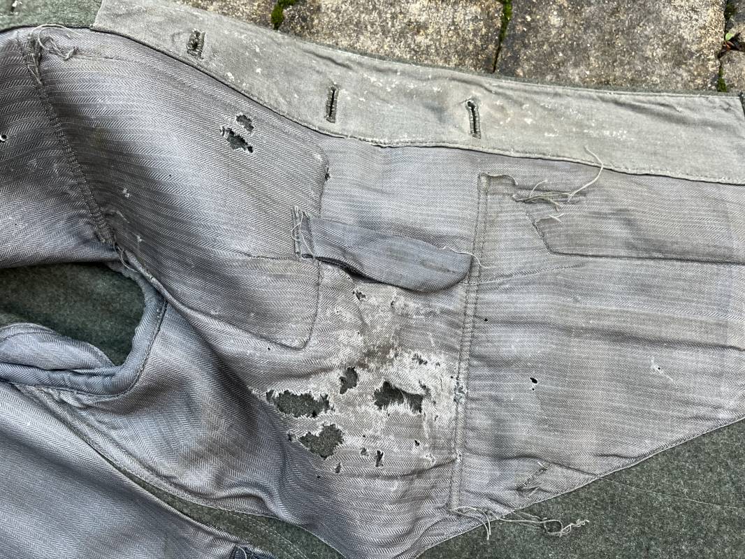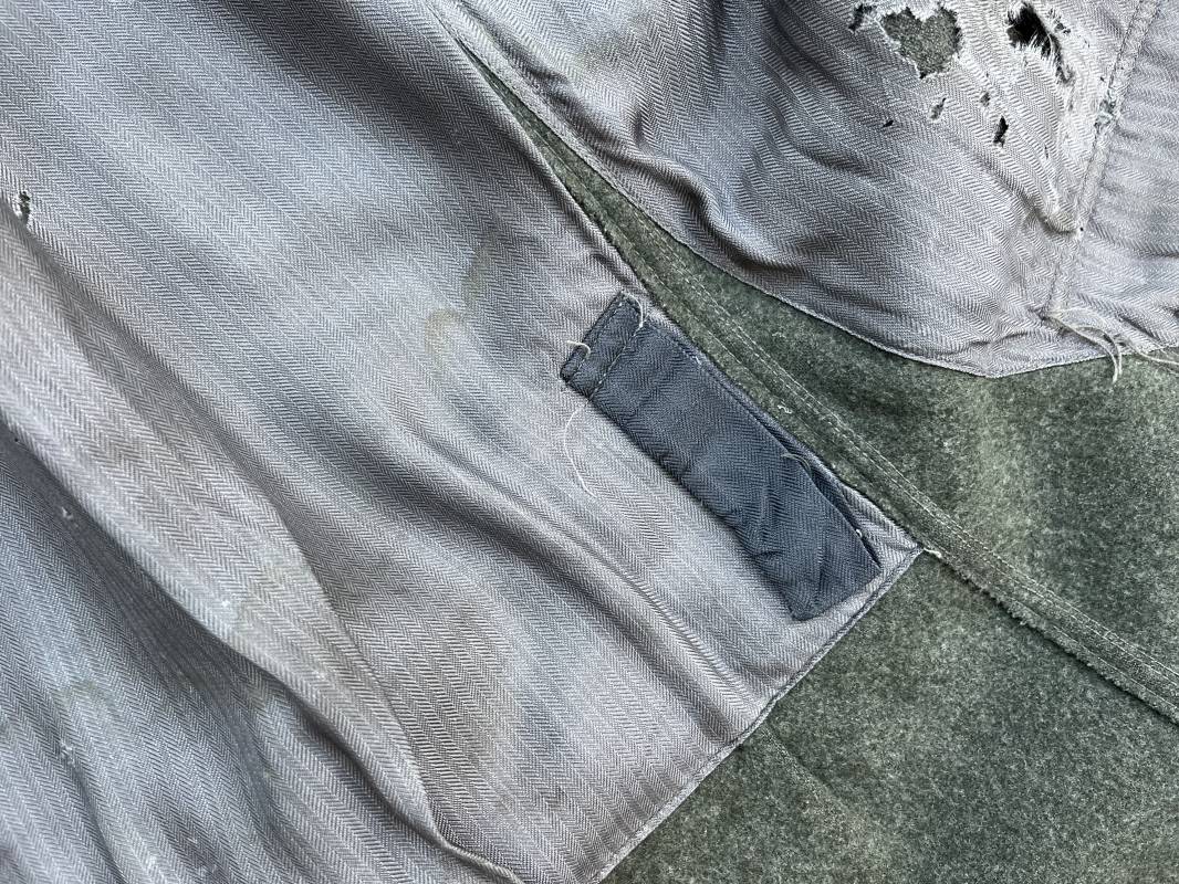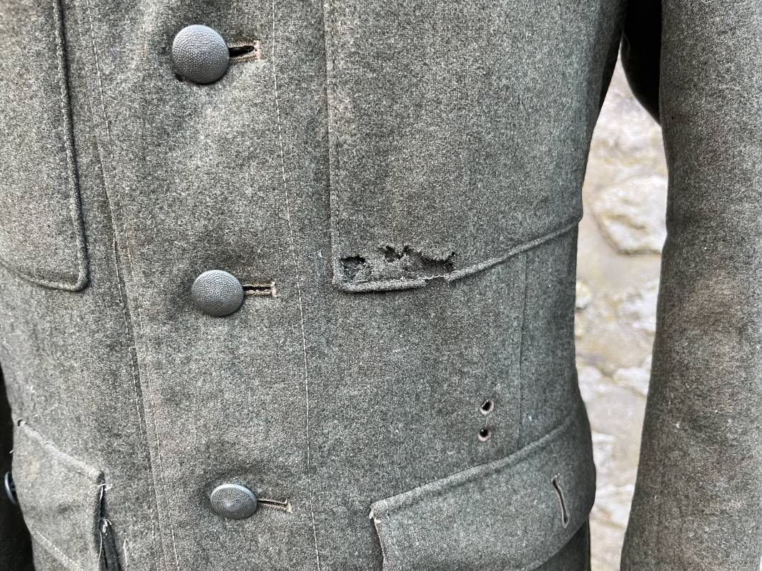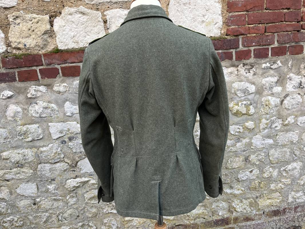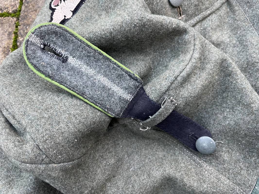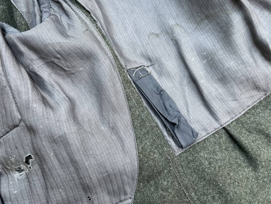 Rare veste troupe modéle 1943 en drap feldgrau d'un soldat Panzer grenadier de la Waffen SS . Cette trés rare veste montée d 'origine a été trouvée dans le secteur de Lisieux ( 14 ) il y a 40 ans . 100 % d origine et intouchée . Veste modéle 1943 de dotation de la Waffen SS : Fermeture frontale à cinq boutons métalliques et deux oeillets de fixation des crochets de ceinturon , Quatre poche à rabats droits boutonnés . Col avec coins de col troupe ( litzen) modéle brodé en fil de coton gris , montées machine d 'origine . Aigle de bras troupe du modéle brodé coton gris , monté machine zig zag . Pattes d 'épaules à rabats modéle 1943 , liseré en rayonne vert pré de panzer grenadier , intérieur doublé et renforcé en coton noir . Tous les boutons sont montés d 'origine . Intérieur doublé satinette grise à chevrons typique des effets vestimentiaires de la WSS a noté quelques degats sur la doublure intérieure ( voir photos ) . Marquage encre des taille Marquage code fabricant F349 Largeur épaules 44 cm , longueur 72 cm , manche 63 cm . Trés belle veste légérement portée en trés bel état .Drap trés frais . A noté trous de mites sur bas de poche de poitrine ( voir photos ) . Cette veste n a jamais ete reparée , restaurée ni transformée . Veste non raccourcie , non modifiée . Uniforme définitif en collection . Rare uniforme des troupes combattante s de la WSS durant la bataille de Normandie 1944 Ref 22504